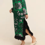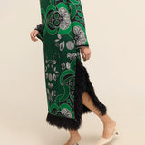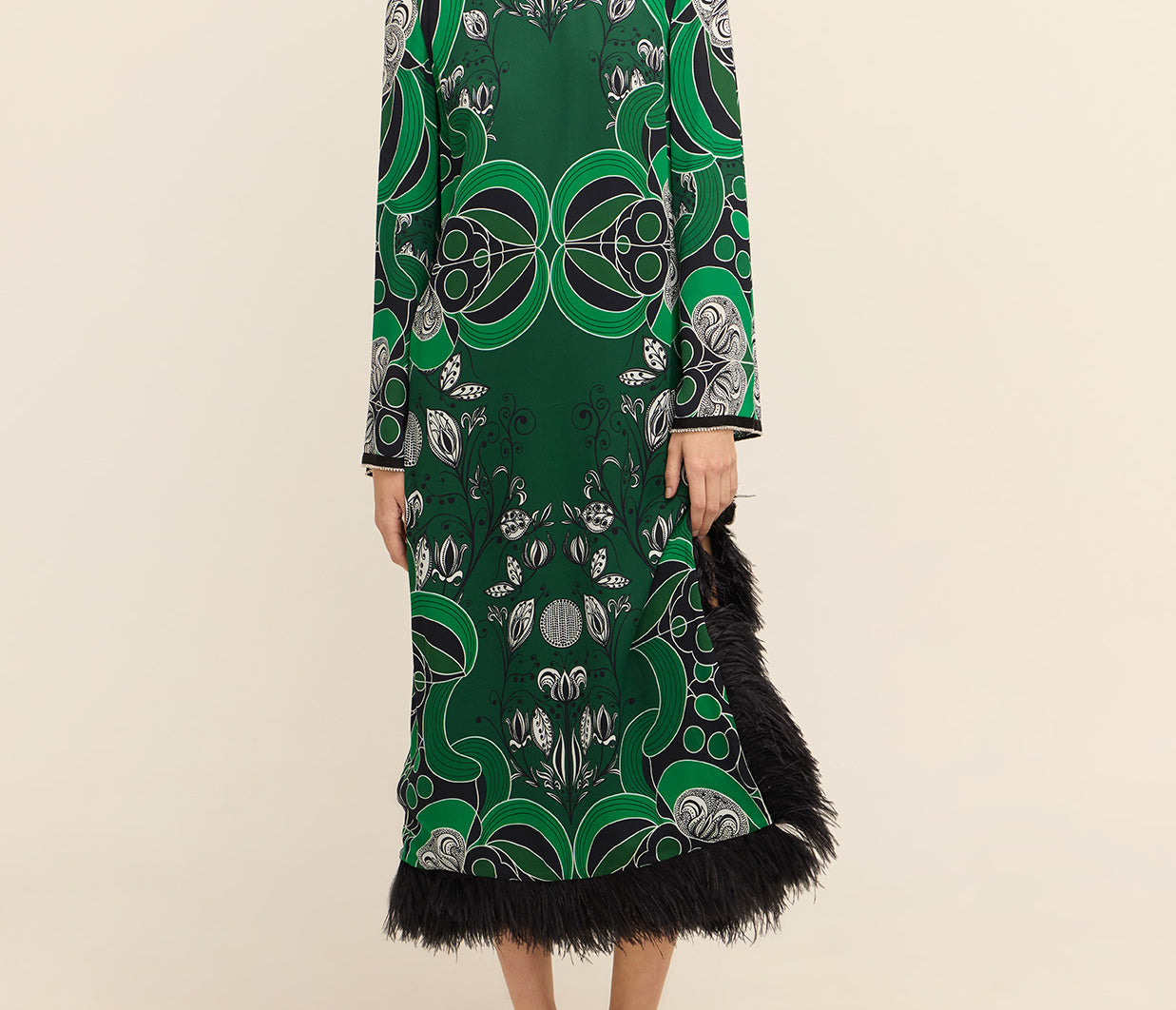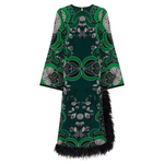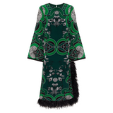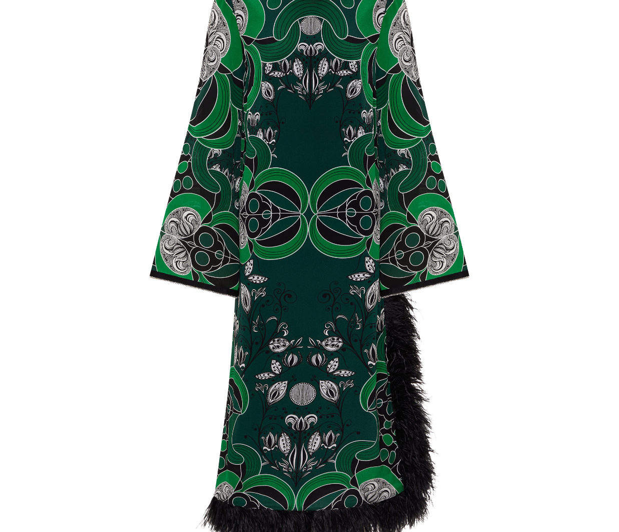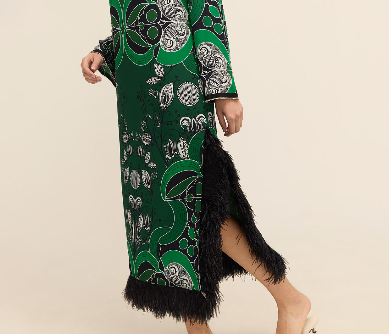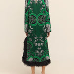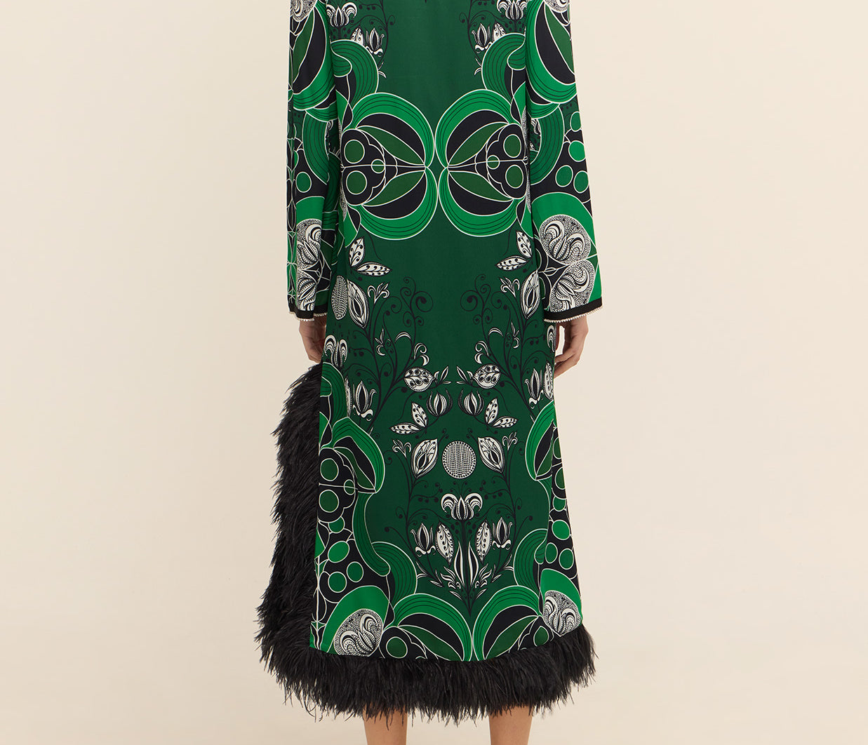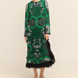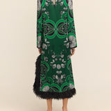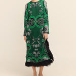 Introducing Borgo De Nor's Seraphina Crepe in Enchantress Emerald Midi Dress a '70s inspired glamour with a contemporary edge, showcasing vivid emerald tones against striking black and white motifs. Jet feather trim and crystal embellishments adds a touch of luxury to the fitted A-line silhouette, making it an exceptional choice for a standout entrance.