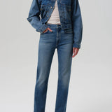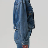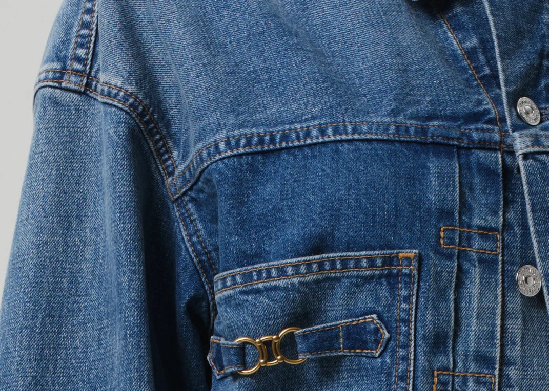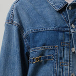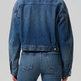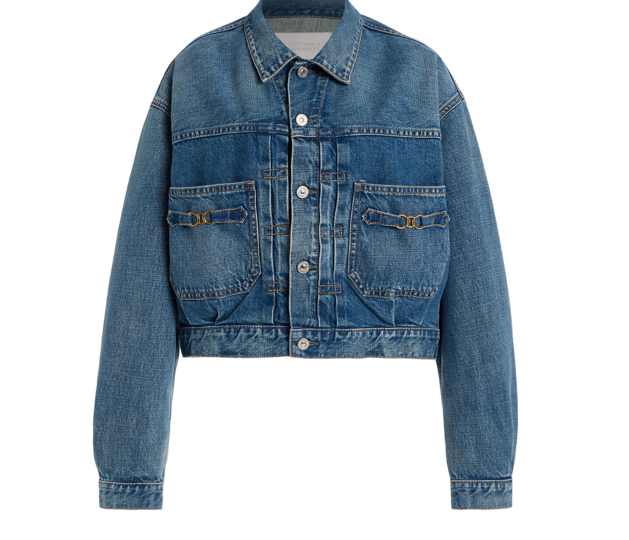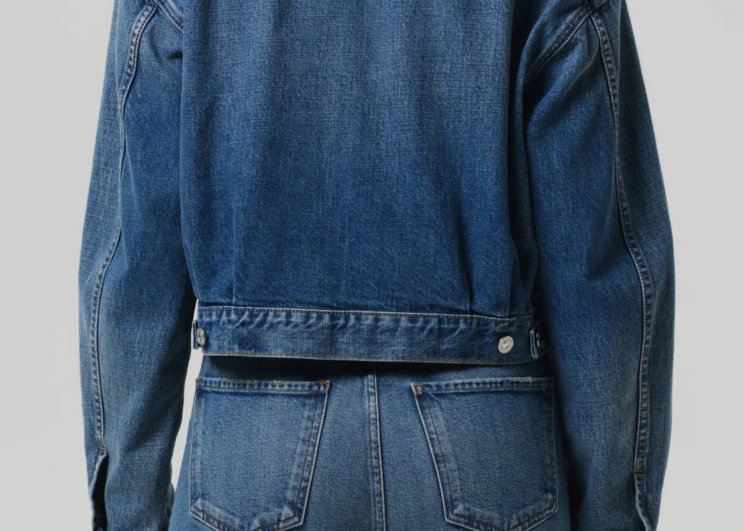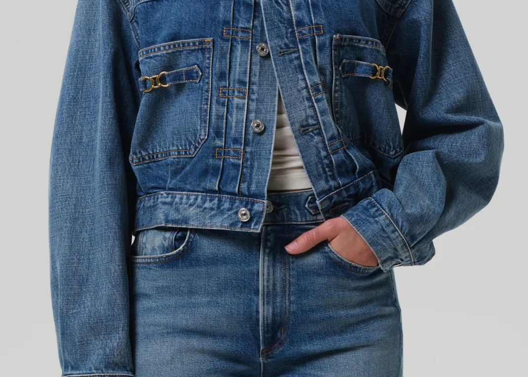 Introducing Citizens of Humanity's Alma Jacket with Horsebit in Sweetzer, a denim jacket in medium to dark indigo. The Alma denim jacket is made from non-stretch Japanese denim with a soft drape and vintage-inspired feel. Finished with signature horsebit hardware at the waist, it adds subtle structure and polish. The Sweetzer wash is a medium to dark indigo with authentic fading. Ideal layered over crisp shirting or paired with tonal denim.