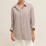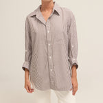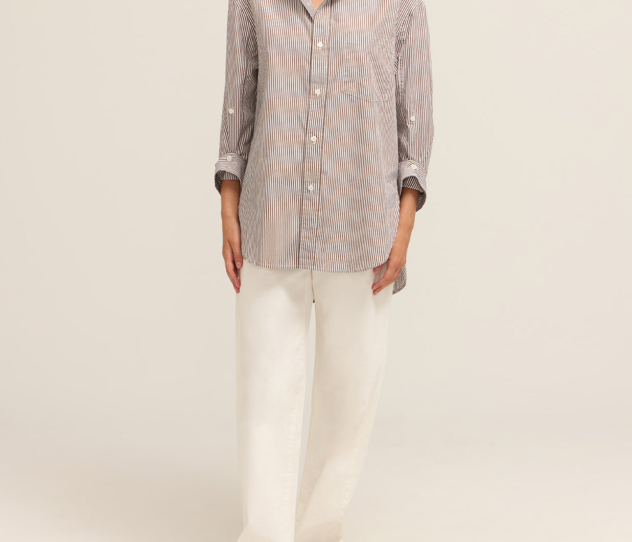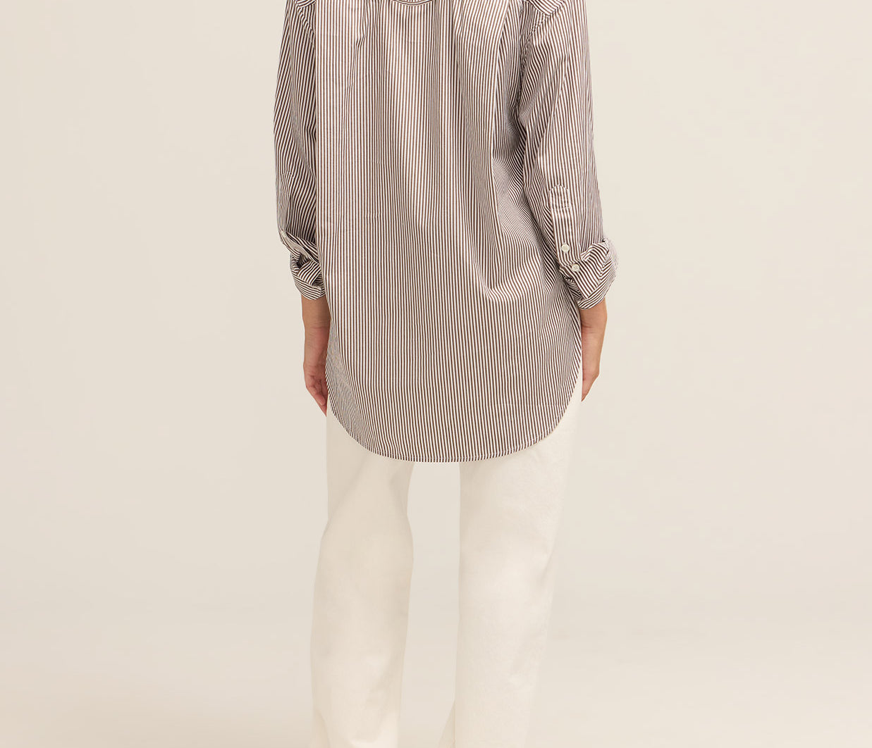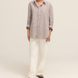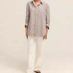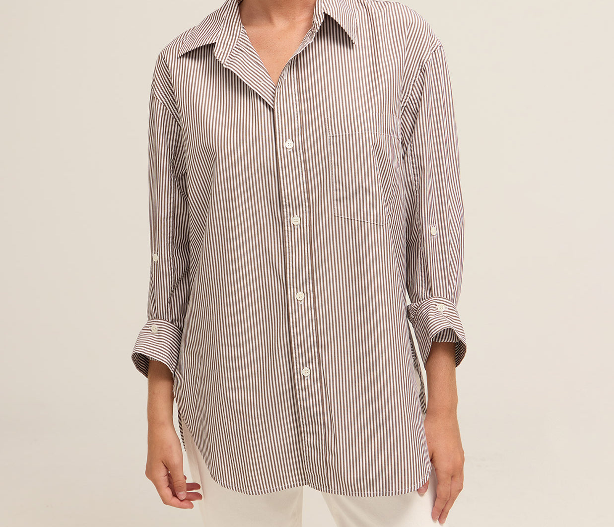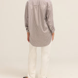 Introducing the Kayla Shirt in Desert Stripe, offering a fresh take on a timeless classic. Its oversized silhouette provides a relaxed, comfortable fit, while the high-low hem adds a modern twist and new dimension to the design.