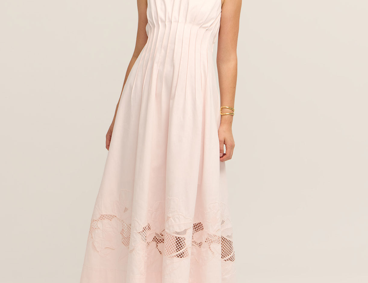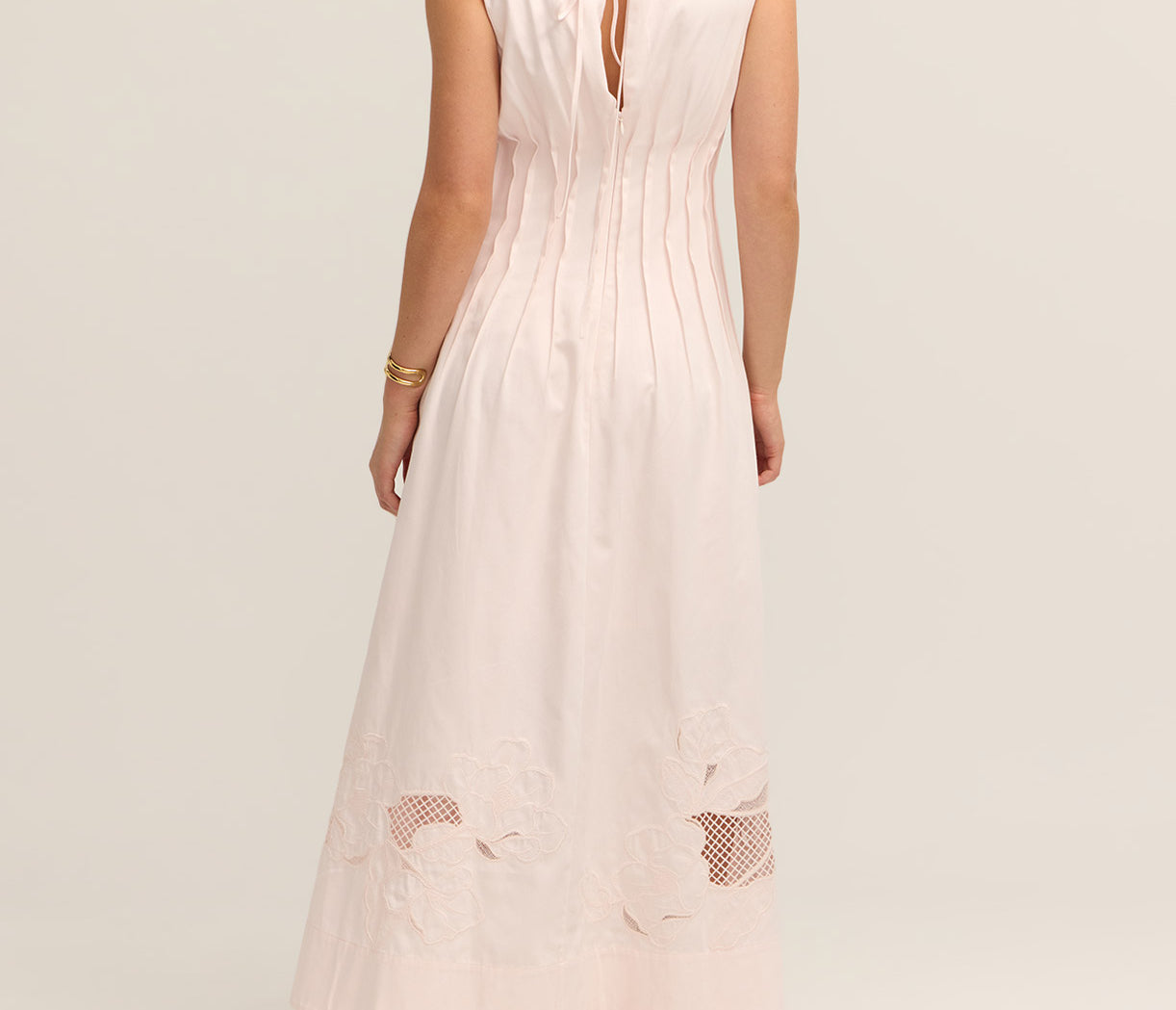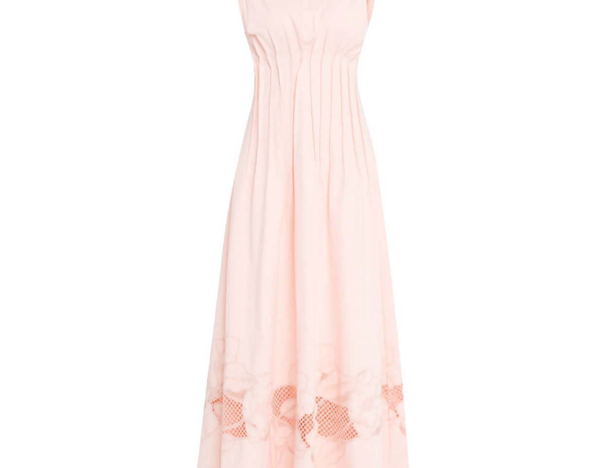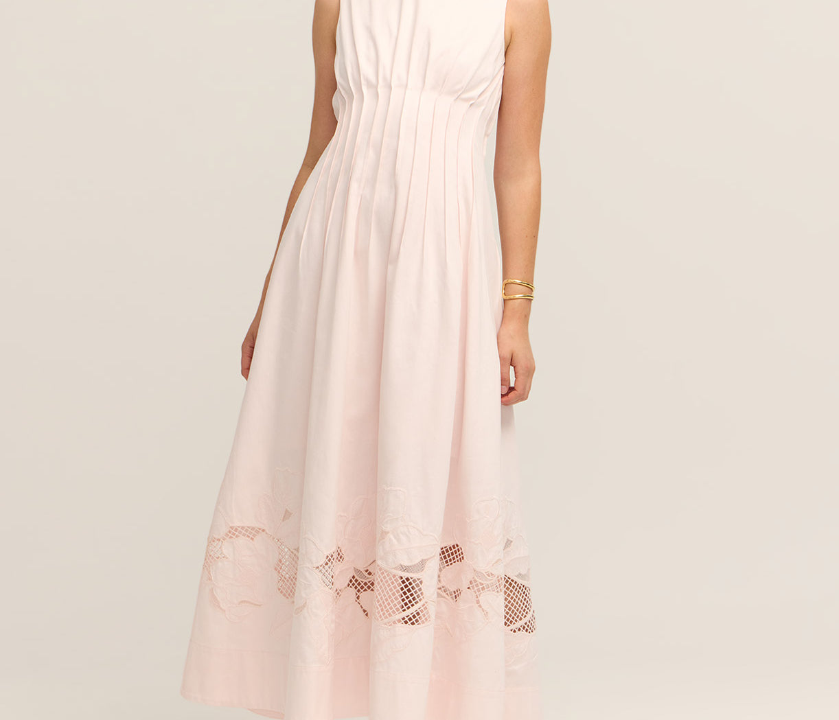 Introducing the Anika Embroidered Dress in Blossom. Crafted from a crisp cotton fabrication this midi dress features intricate pintuck detailing contouring through the waistline before falling into a full skirt. Bespoke embroidery adorns the skirt hemline featuring floral motifs, lattice lace detailing and intricate cut work.
