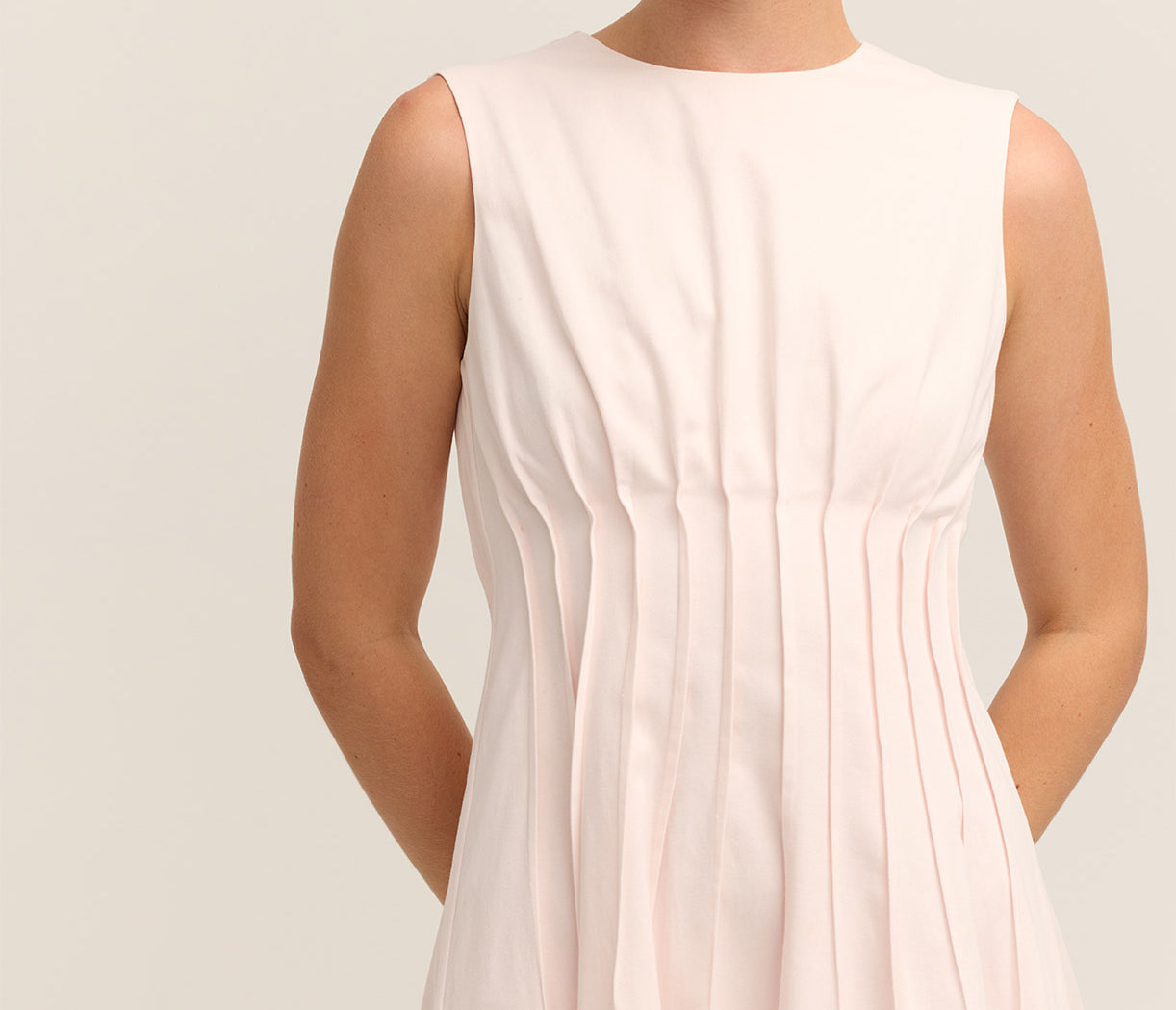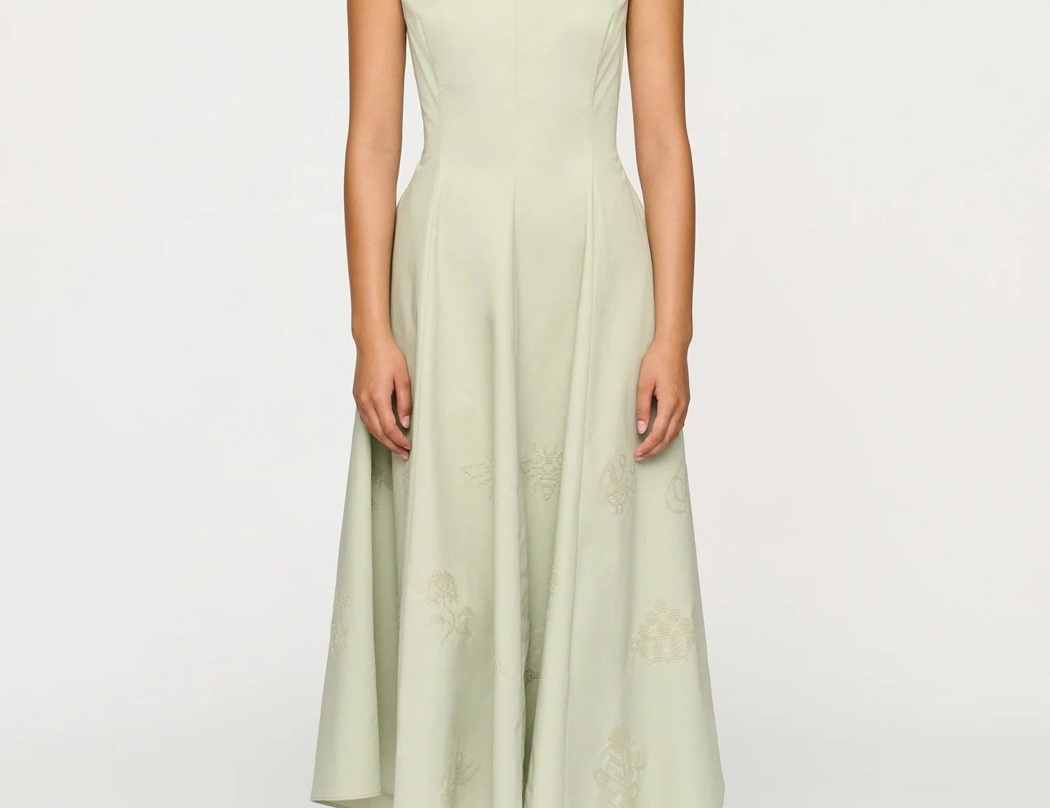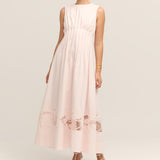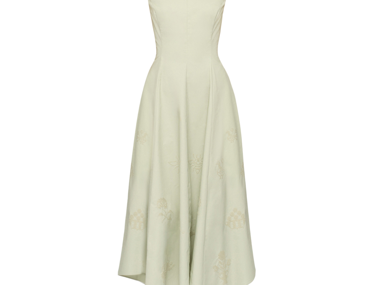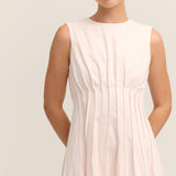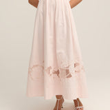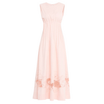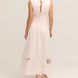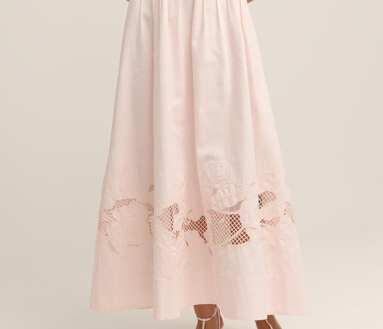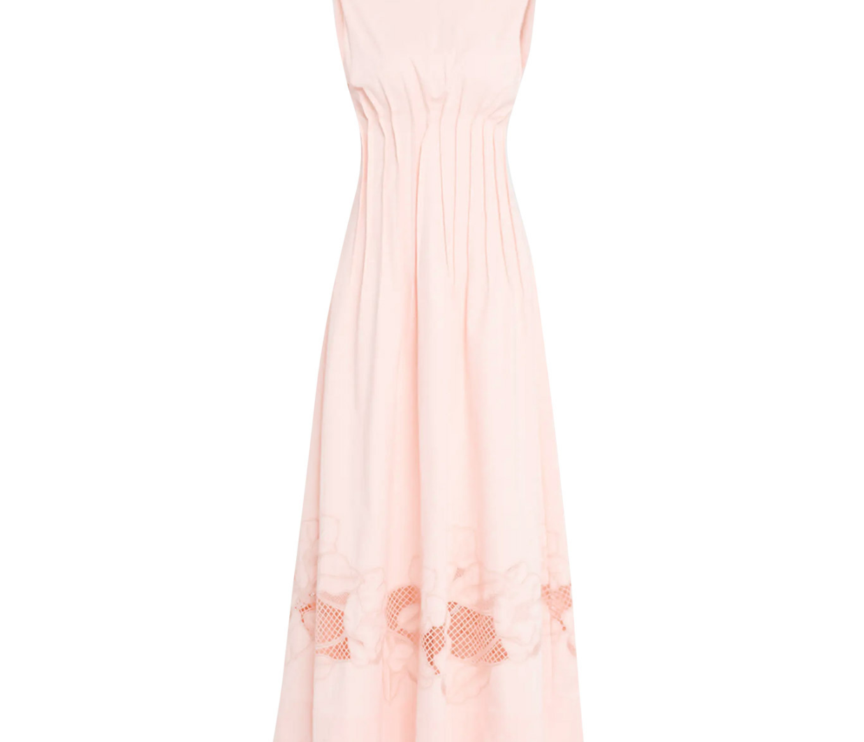 Introducing the Anika Embroidered Dress in Blossom. Crafted from a crisp cotton fabrication this midi dress features intricate pintuck detailing contouring through the waistline before falling into a full skirt. Bespoke embroidery adorns the skirt hemline featuring floral motifs, lattice lace detailing and intricate cut work.