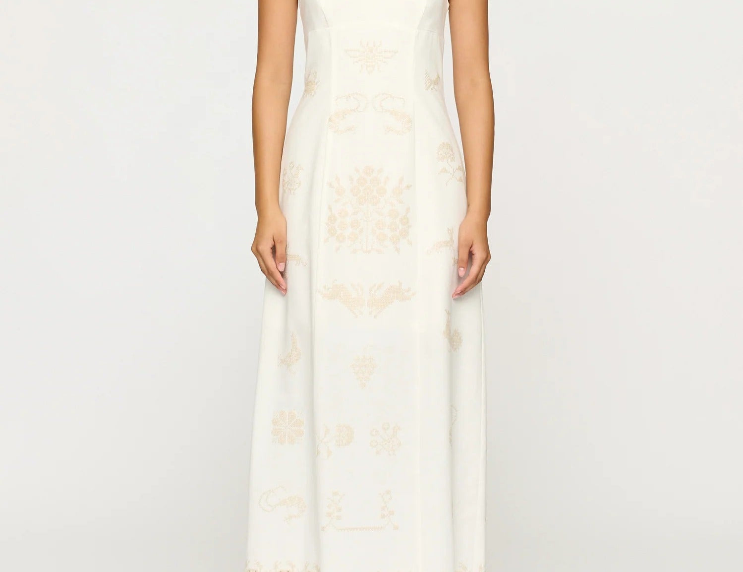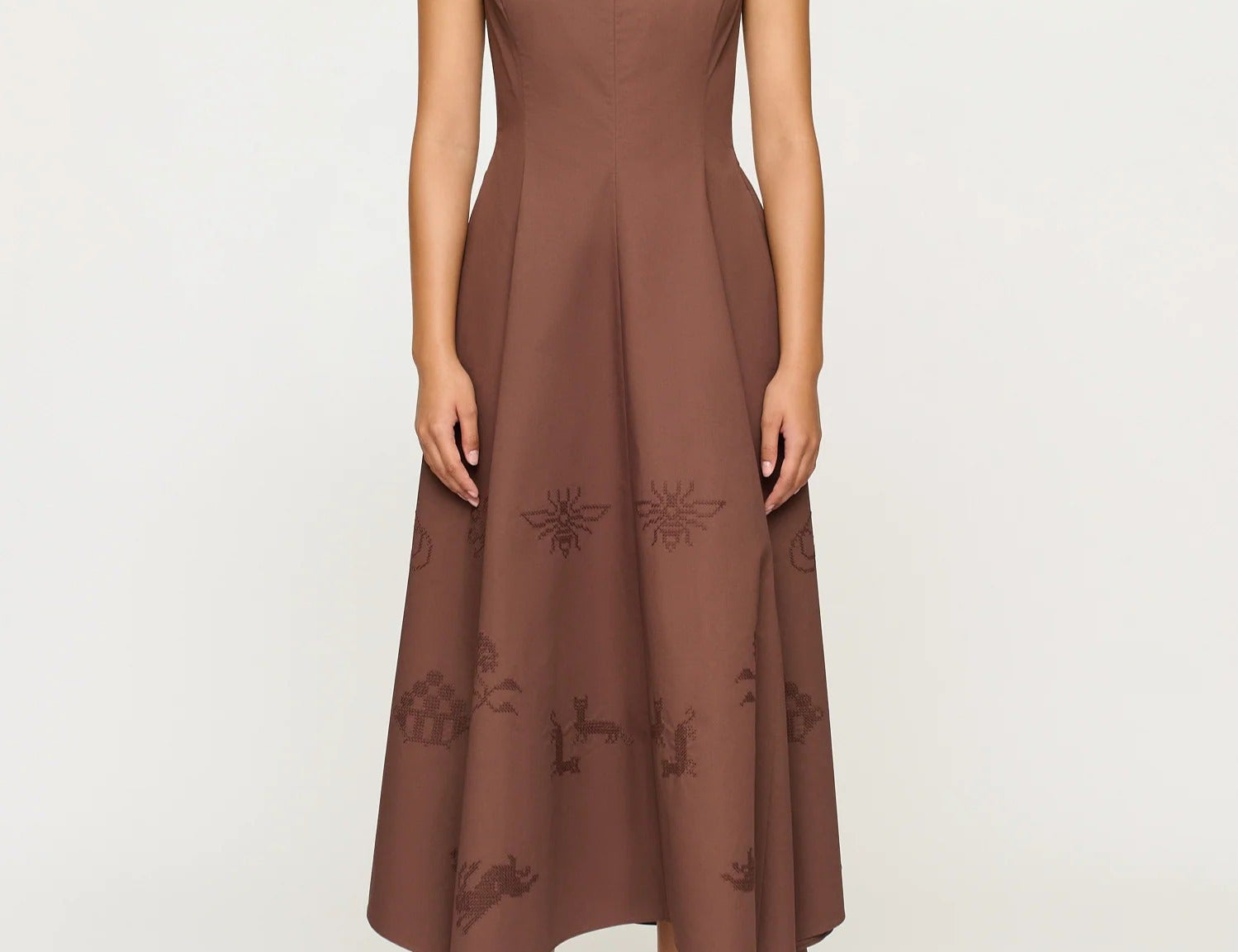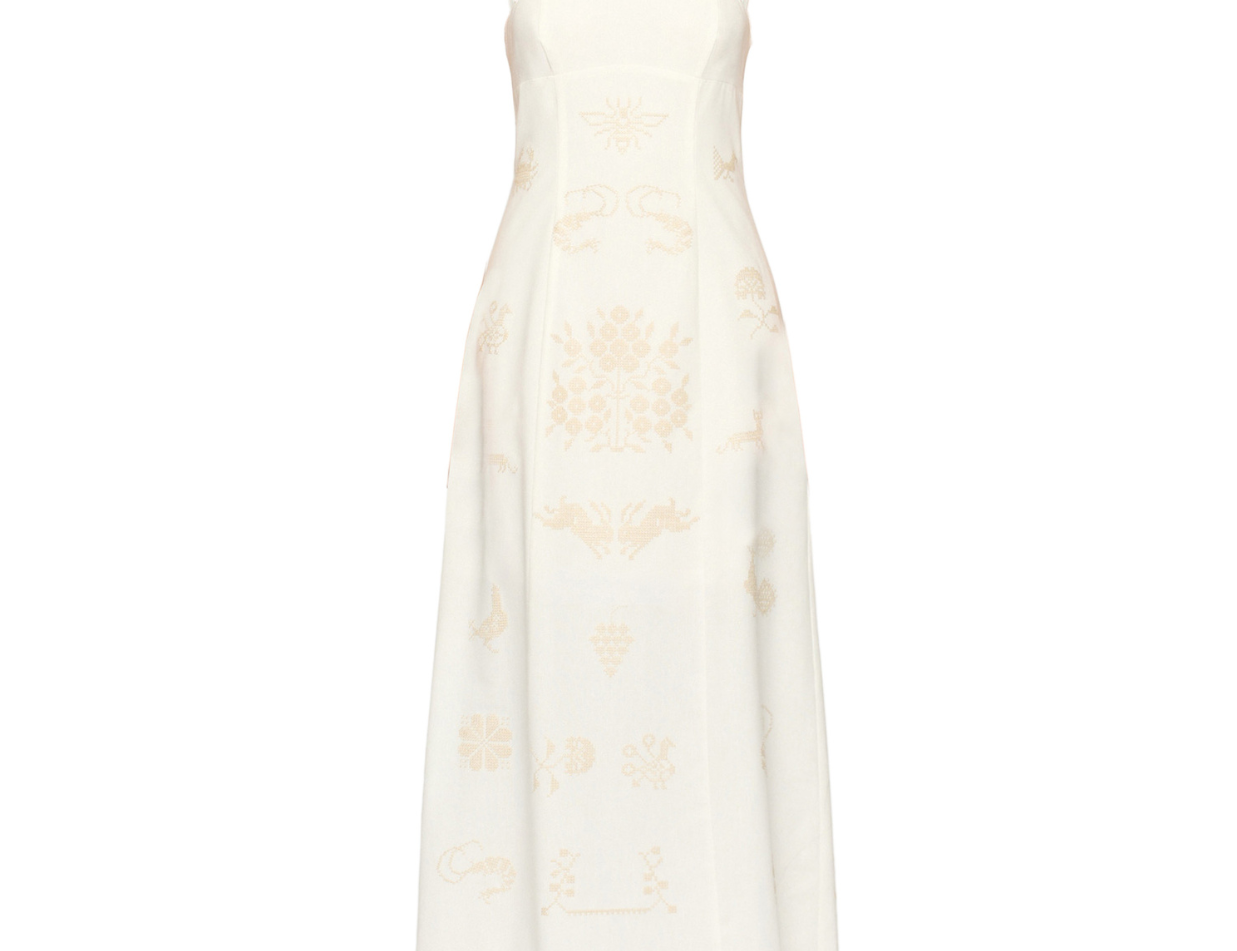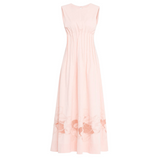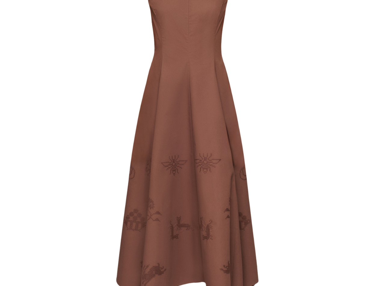 Introducing the Anika Embroidered Dress in Blossom. Crafted from a crisp cotton fabrication this midi dress features intricate pintuck detailing contouring through the waistline before falling into a full skirt. Bespoke embroidery adorns the skirt hemline featuring floral motifs, lattice lace detailing and intricate cut work.
