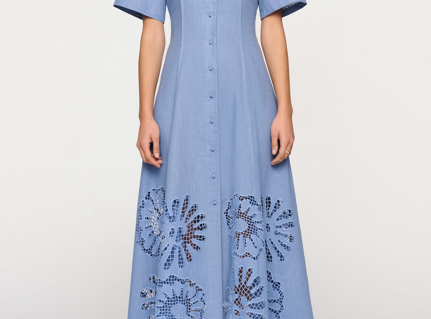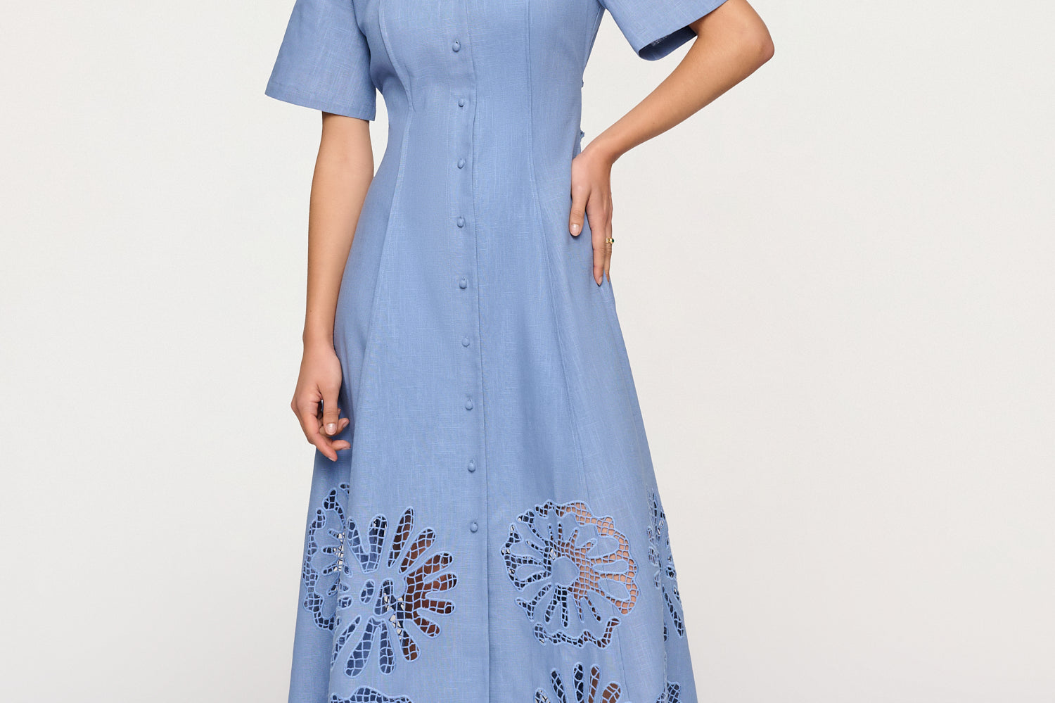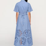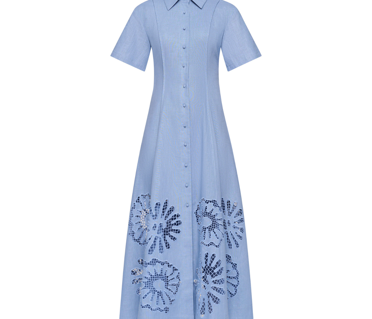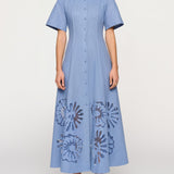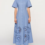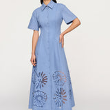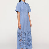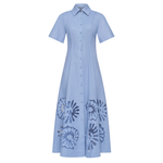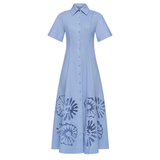 Introducing Clea's Annalise Shirt Dress in Delphinium, a short-sleeved midi shirt dress silhouette in a blue hue. Crafted in cotton poplin, this short-sleeve dress features a flattering split neckline and an A-line skirt for effortless movement. The rich blue hue adds a bold yet versatile touch, making it the perfect cotton poplin dress to wear from day to evening.