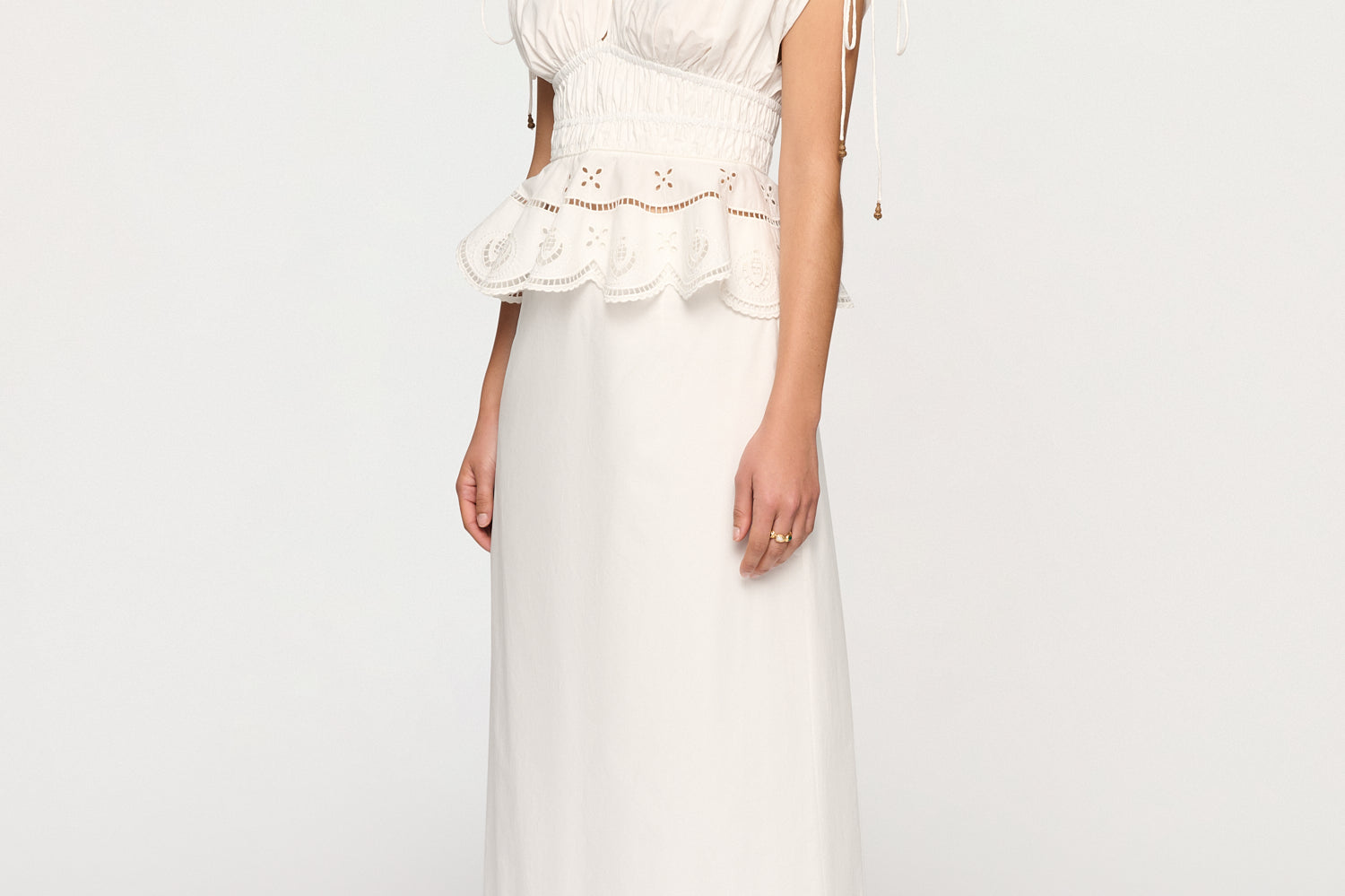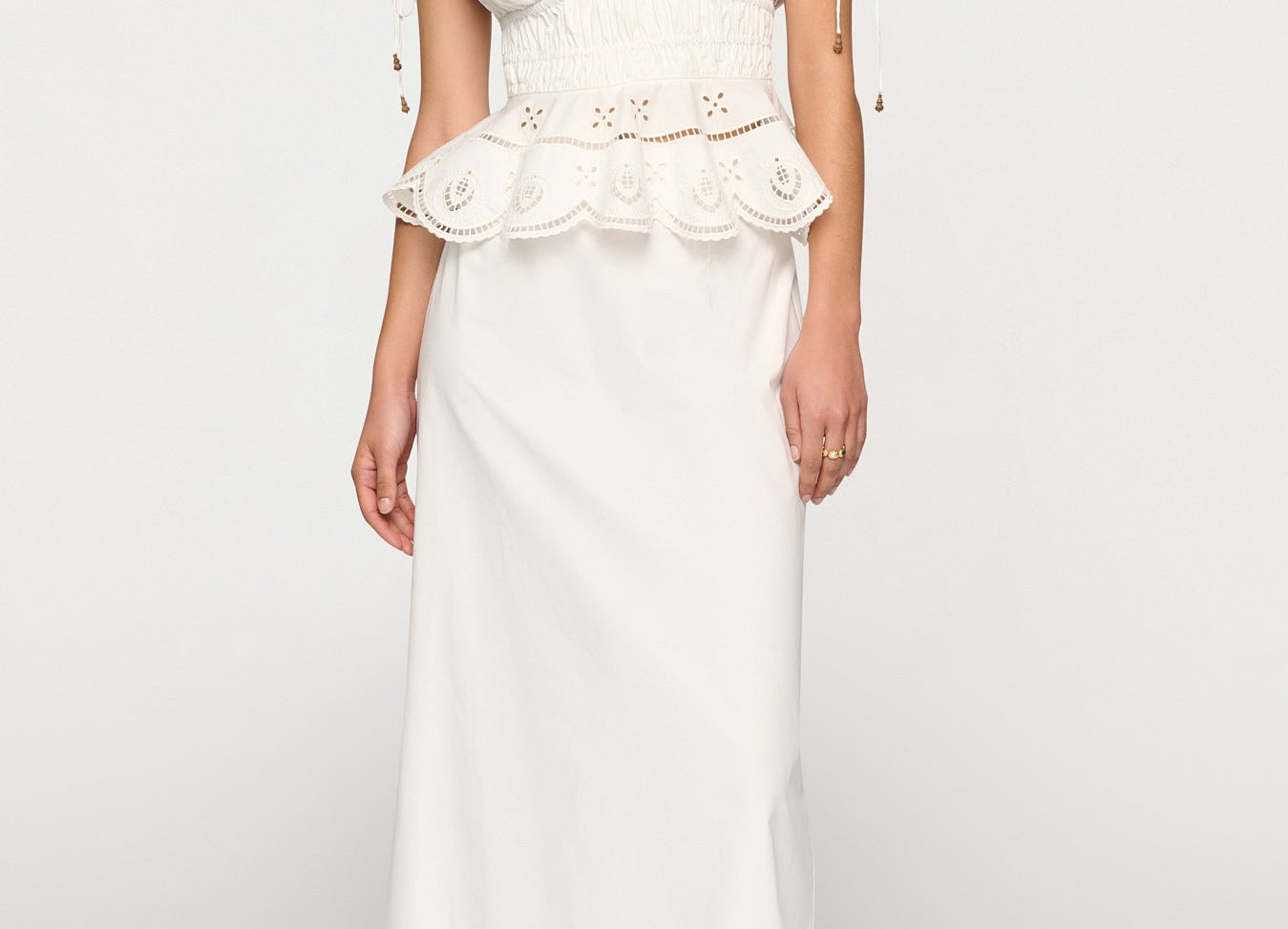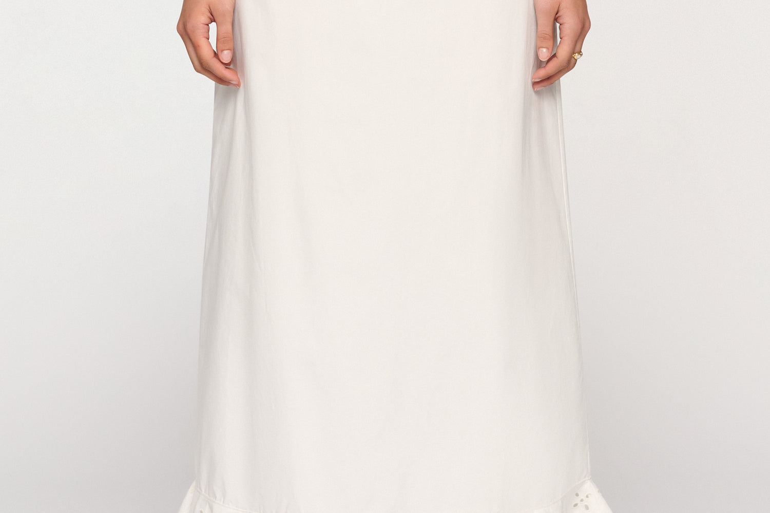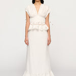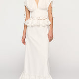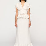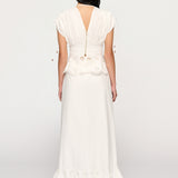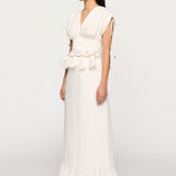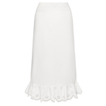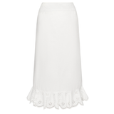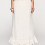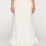 Introducing Clea's Bettina Skirt in White, a maxi skirt silhouette in white. The Bettina Skirt is designed in an A-line silhouette, featuring an invisible back zip, embroidered flounce, and scalloped edge. Pair it with the Yolander top for a coordinated look.