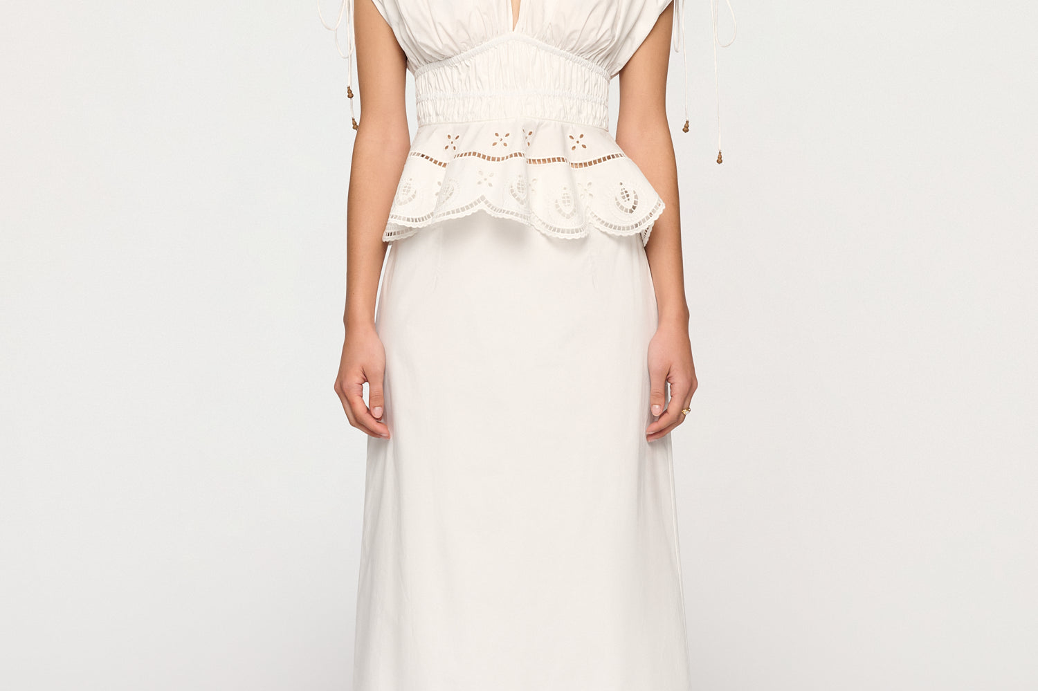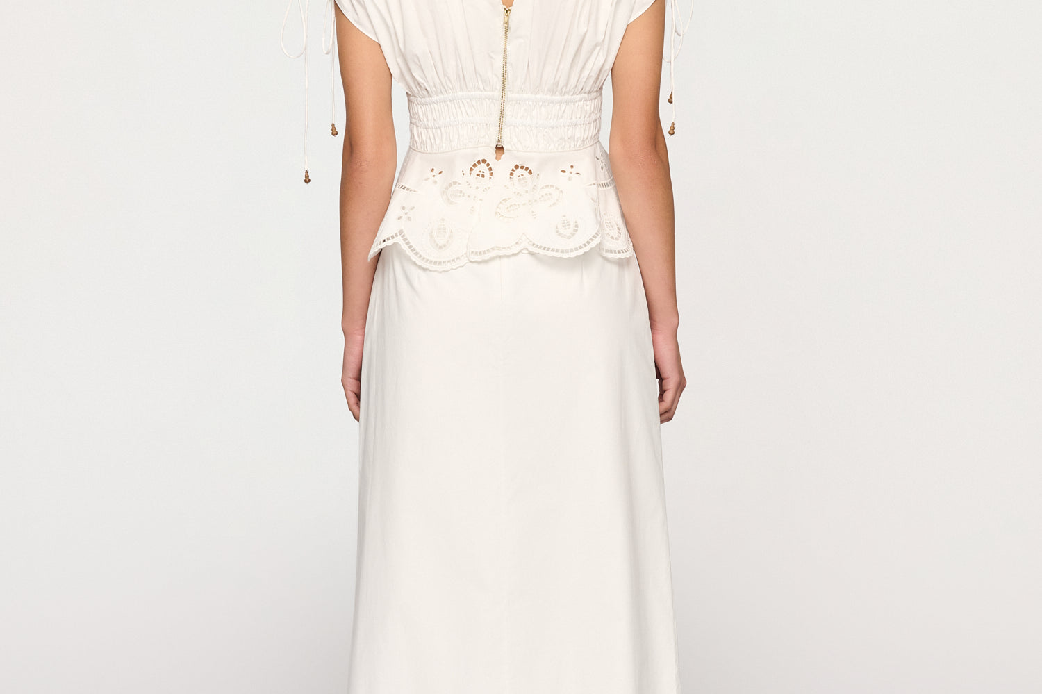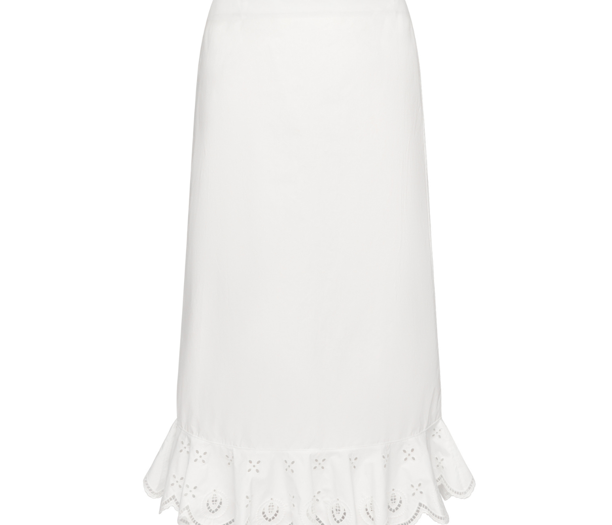 Introducing Clea's Bettina Skirt in White, a maxi skirt silhouette in white. The Bettina Skirt is designed in an A-line silhouette, featuring an invisible back zip, embroidered flounce, and scalloped edge. Pair it with the Yolander top for a coordinated look.