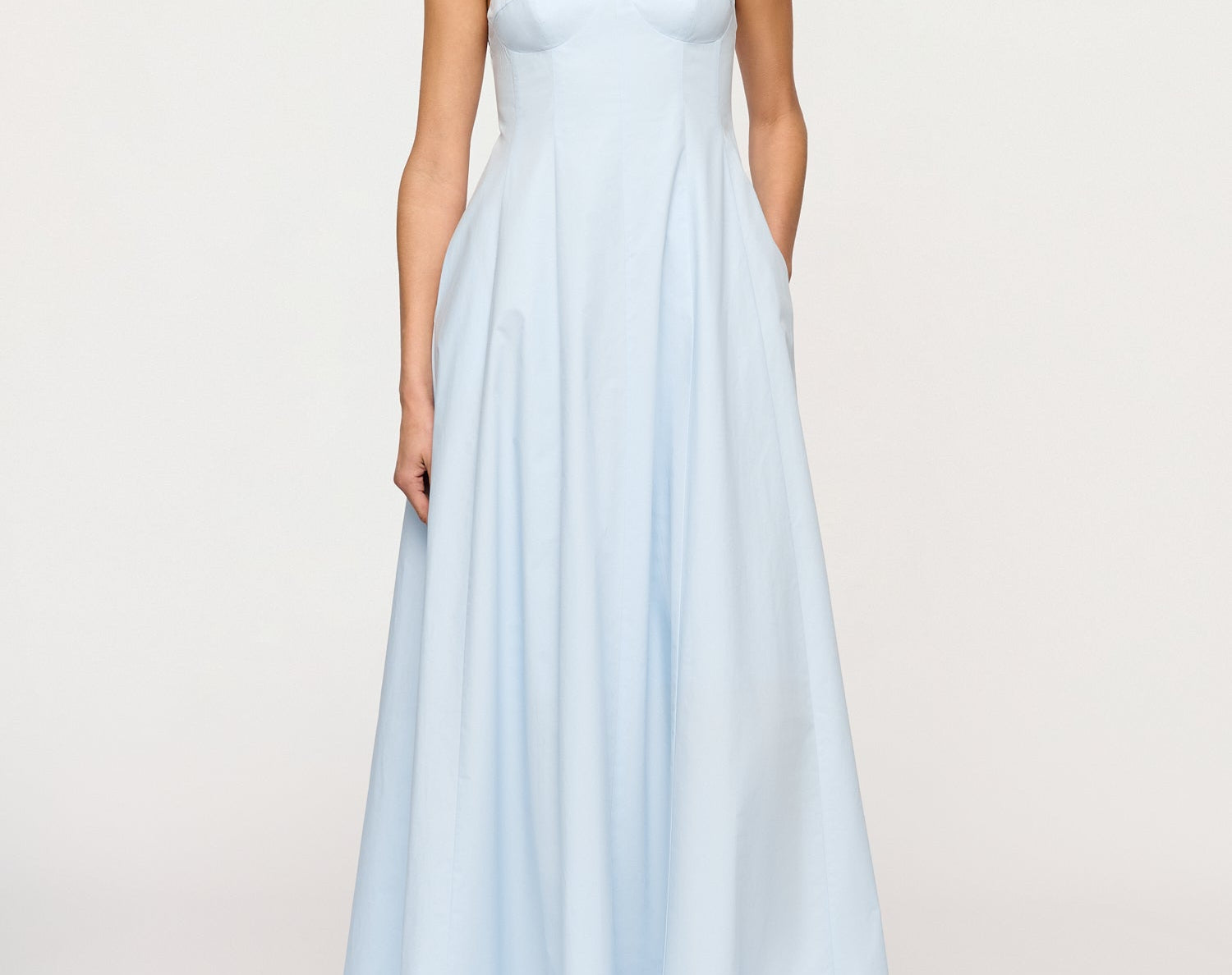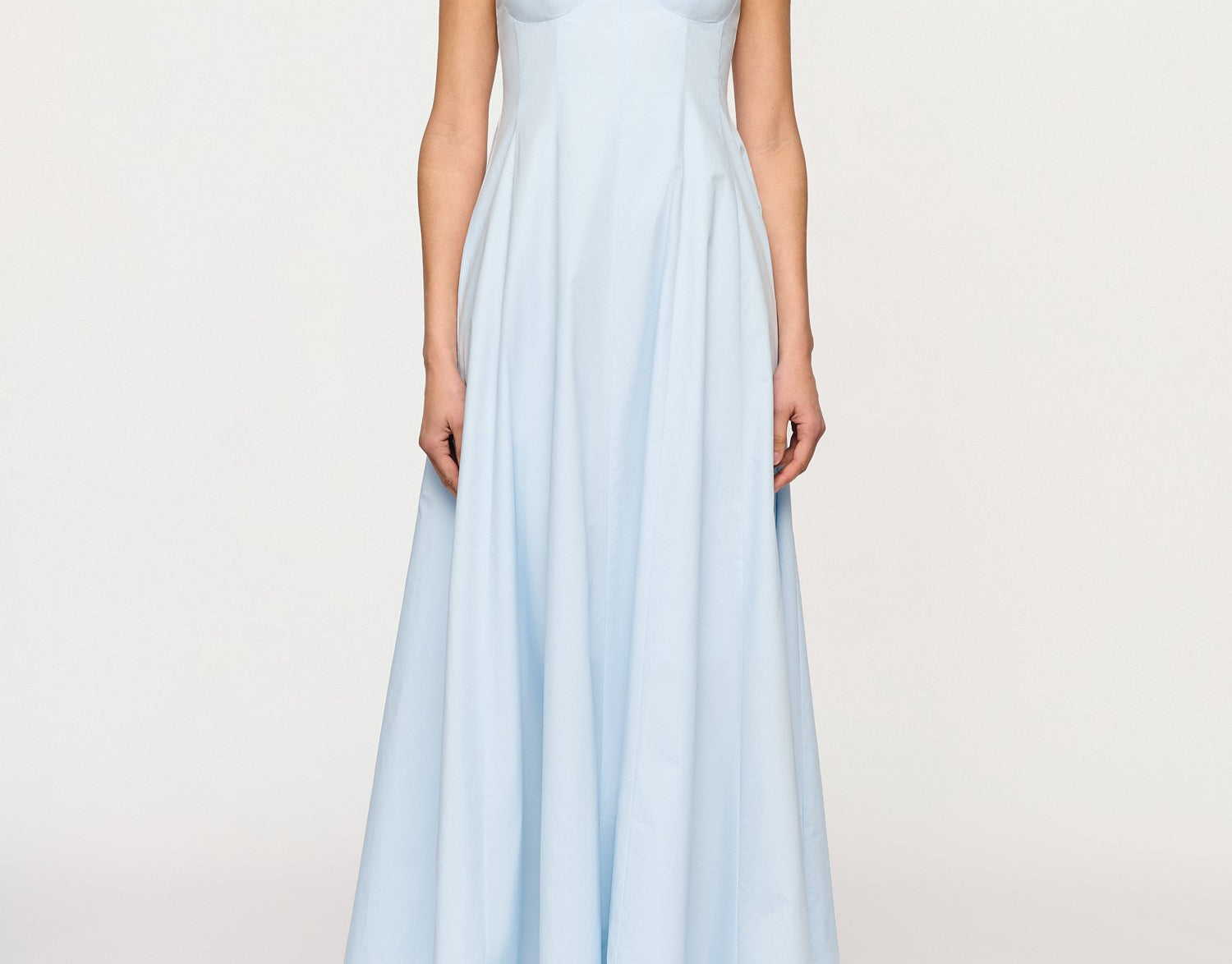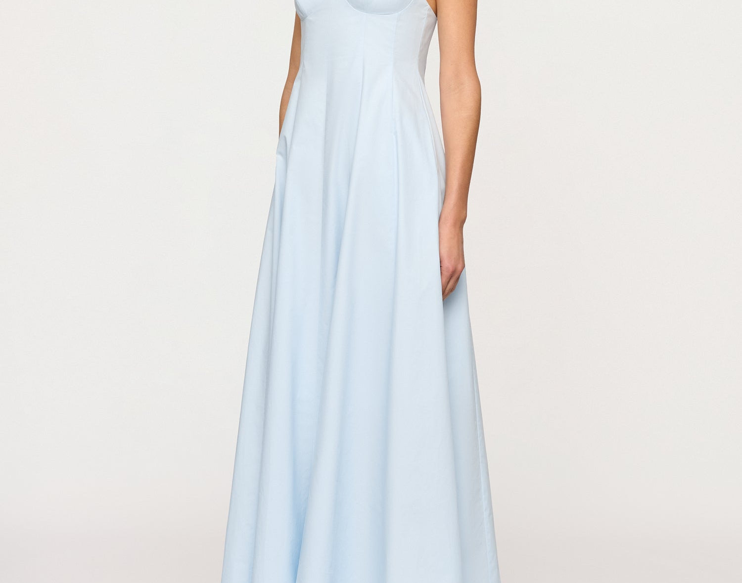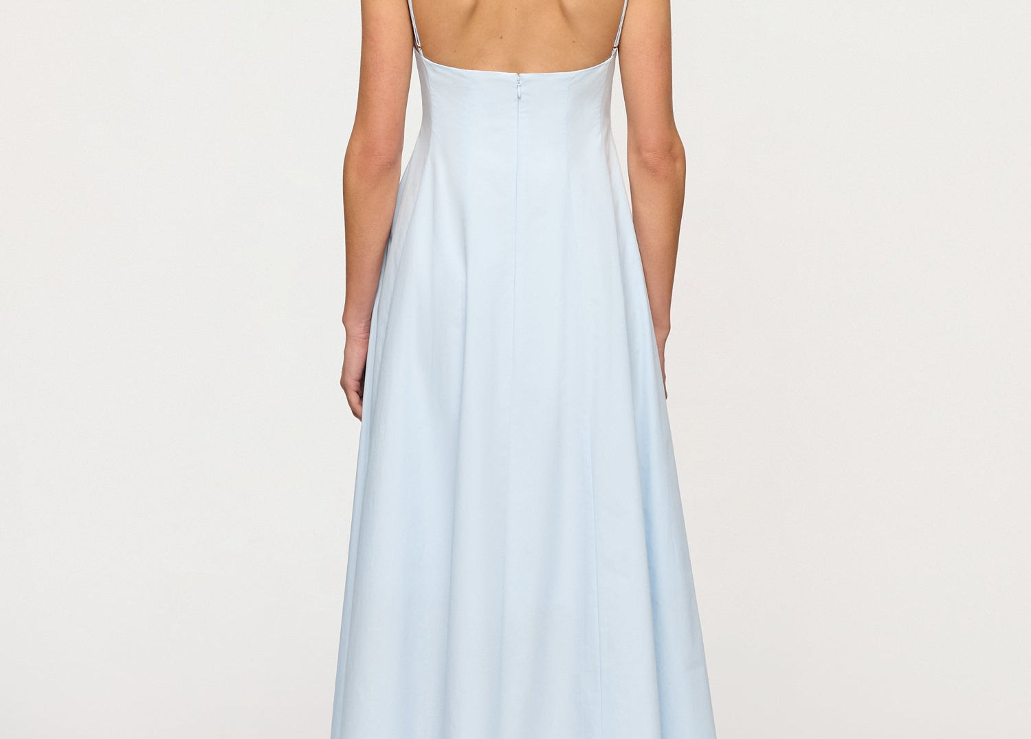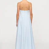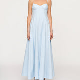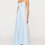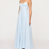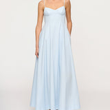Introducing the Maxi Dress in Blue Tint, a cotton thin strap maxi silhouete in a baby blue hue. The Cynthia Dress features a structured bustline, adjustable spaghetti straps, and a fitted bodice that flows into a voluminous full-length skirt. Perfect for beachside weddings or city soirées, it embodies timeless elegance and refined ease.