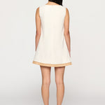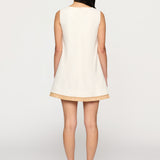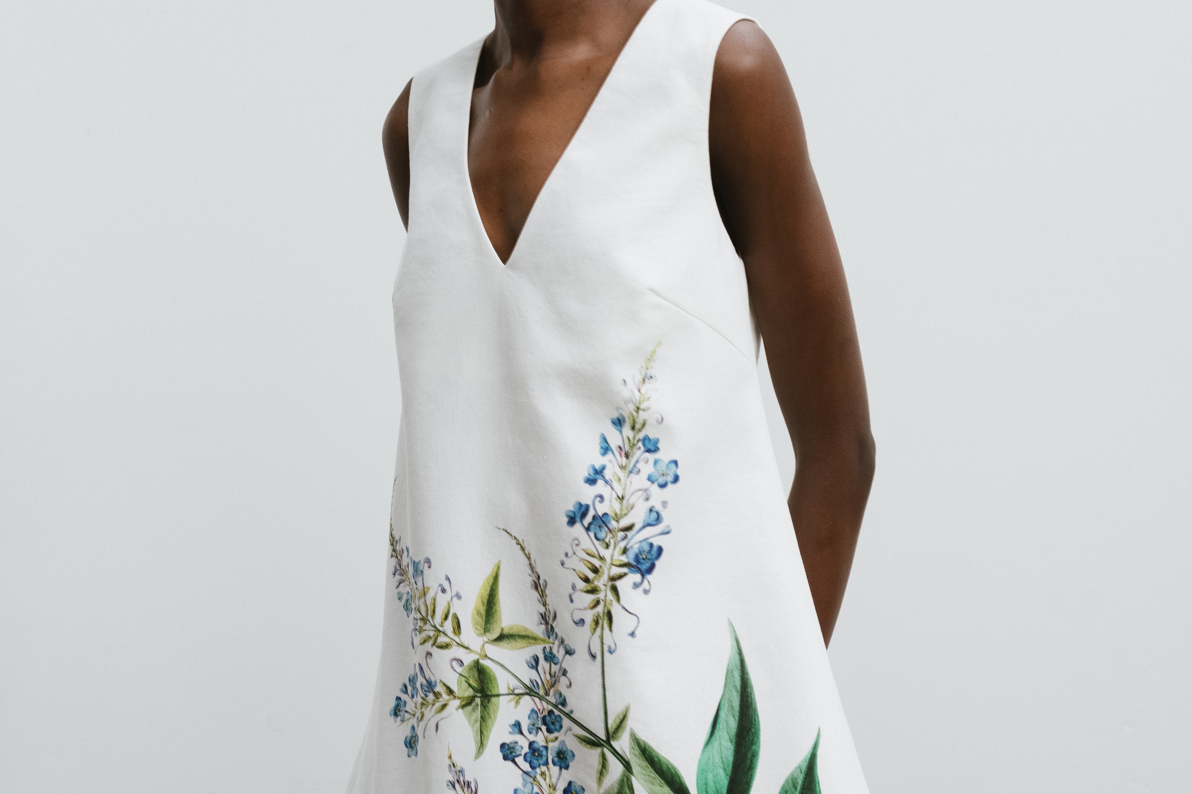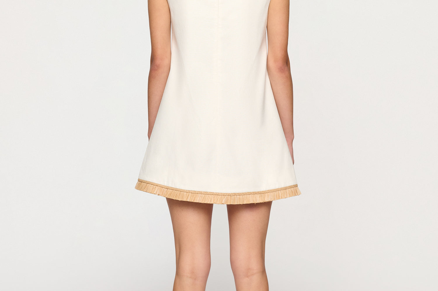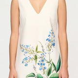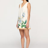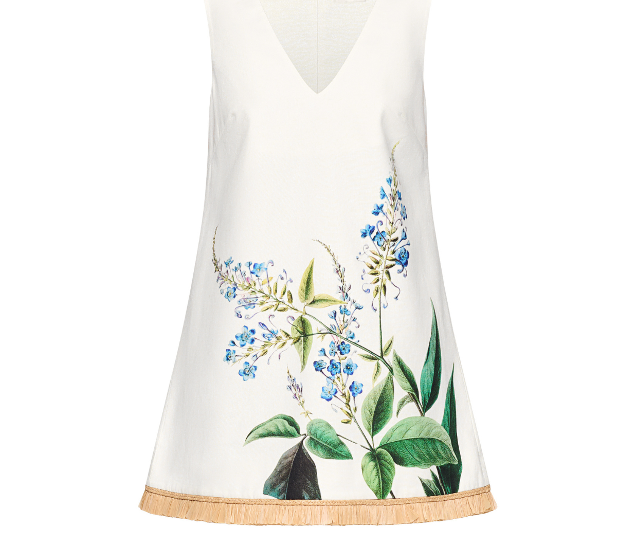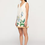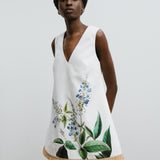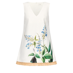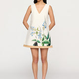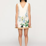 Introducing Clea's Pepe Mini Dress in Laurel Bloom, a shift mini-length dress silhouette in Laurel Bloom print canvas. Designed in an A-line silhouette, featuring a V-neckline and a center-back invisible zipper. The Laurel Bloom print is an intricate botanical illustration, and the raffia trim at the hem introduces texture and contrast, lending a sense of play to an otherwise pared-back silhouette.