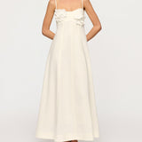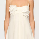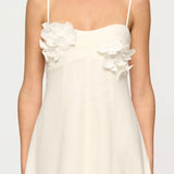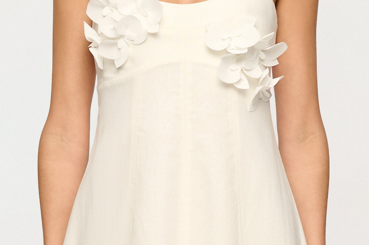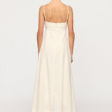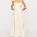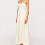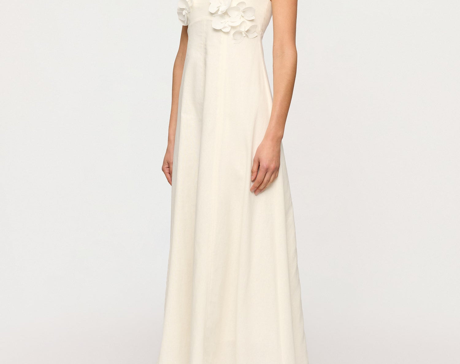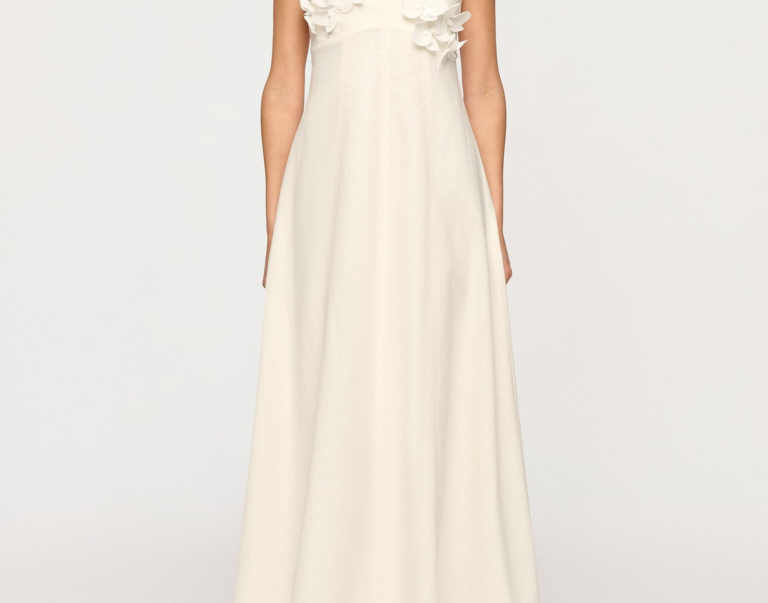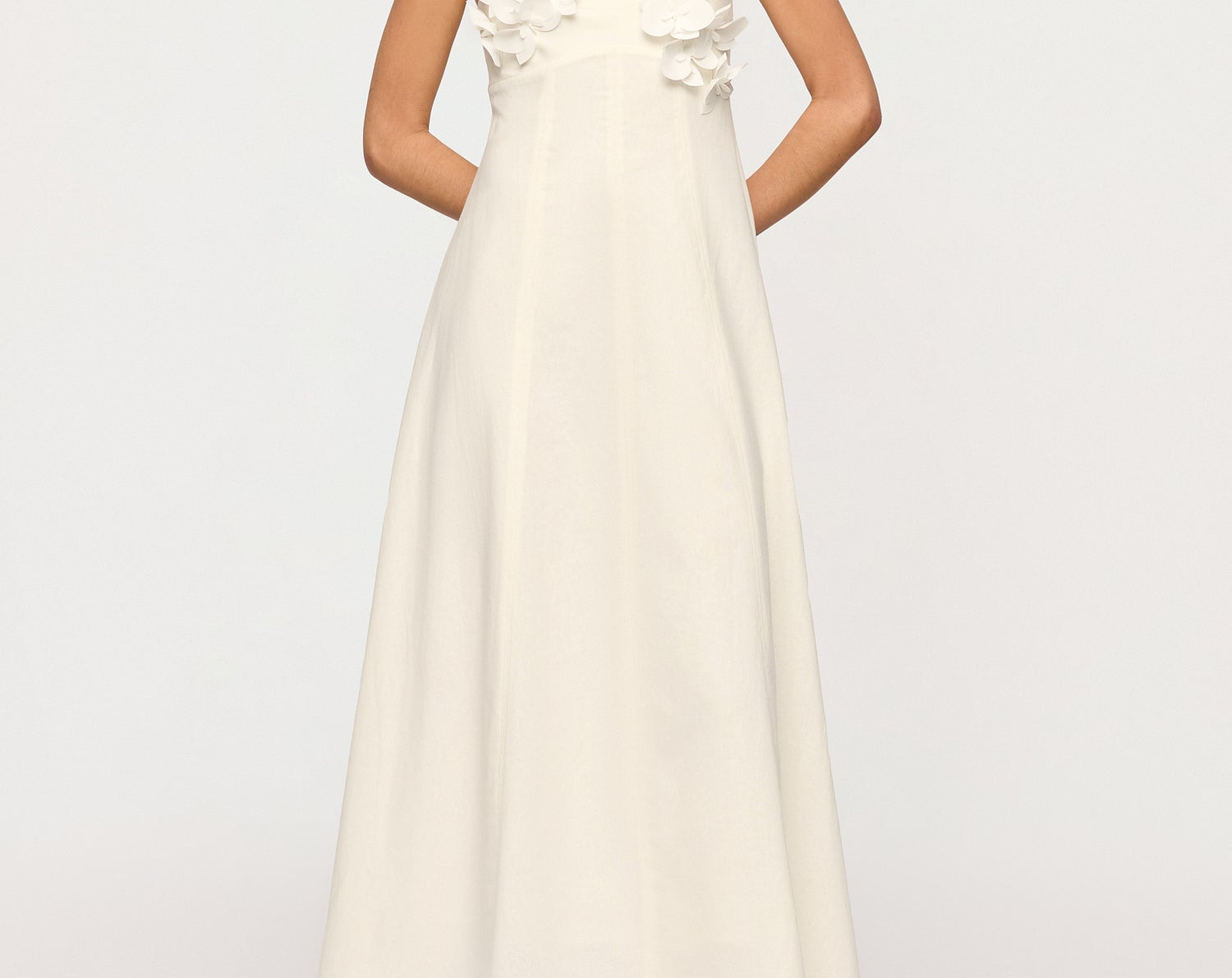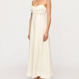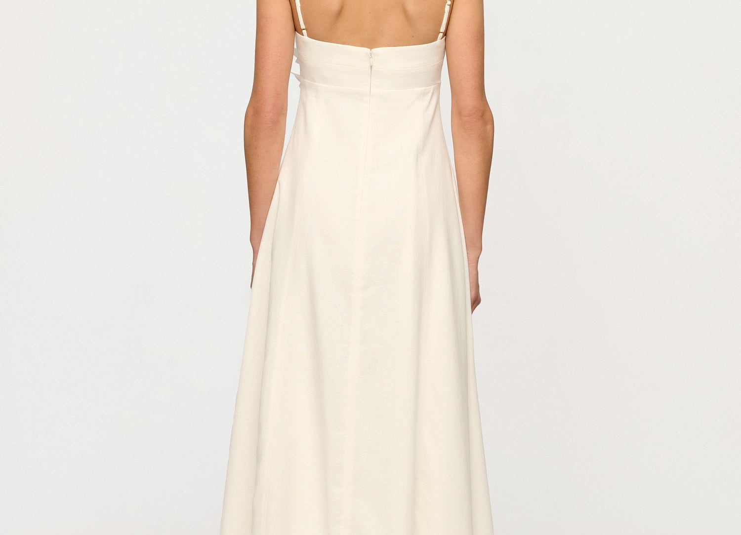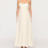 Introducing Clea’s Roselle Midi Dress in Off White, a thin strap A-line maxi silhouette in an off white hue. Designed with delicate adjustable straps and a softly fitted bodice featuring floral embroidery at the chest, the Roselle Dress falls into a fluid A-line skirt from under the bust. Finished with a concealed back zip for an elegant, refined finish.