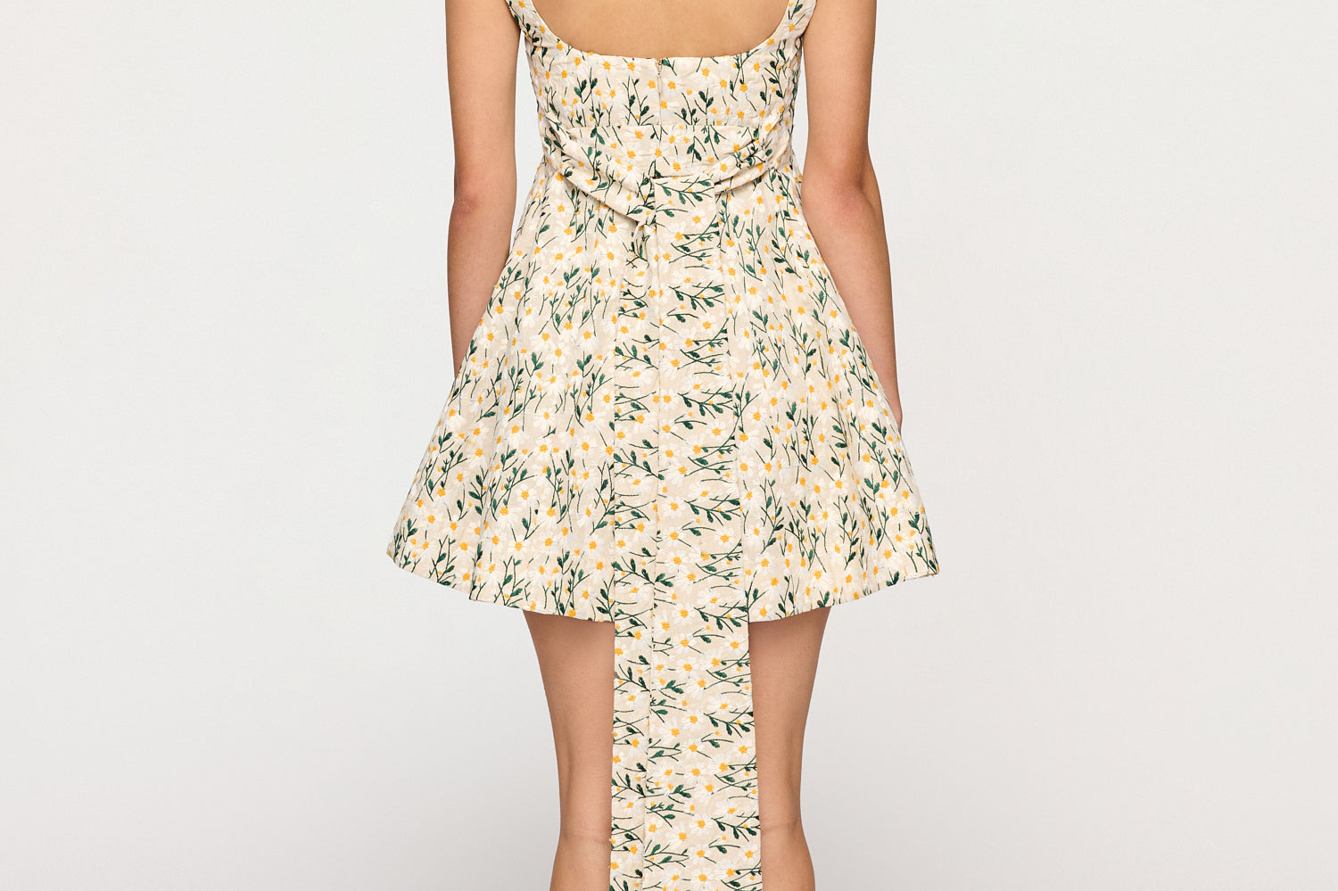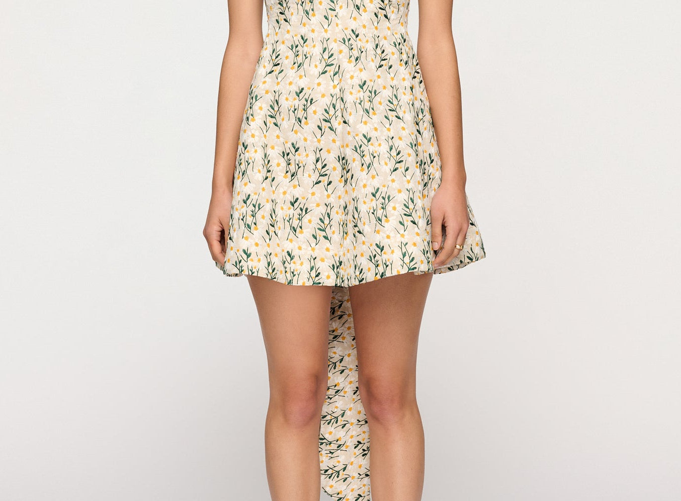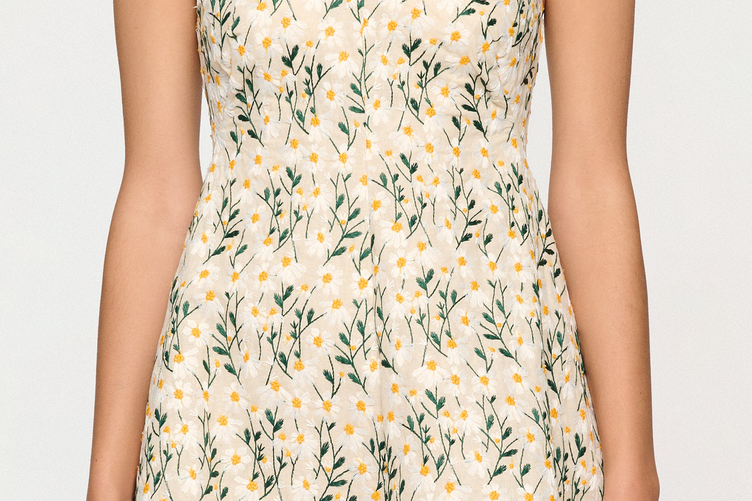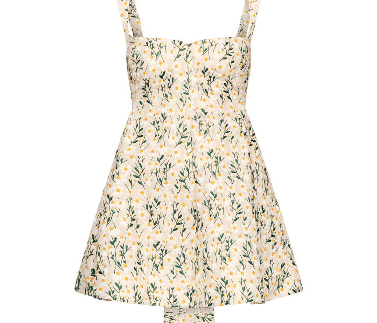 Introducing Clea's Rue Mini Dress in Daisy Meadow, a flared mini dress silhouette in daisy meadow floral embroidery. The Rue Dress features a contoured, panelled bodice that curves into a central seam, framed by a square neckline at the front and a scooped line at the back. The full skirt is anchored by a deep hem facing, giving volume and shape to the silhouette.