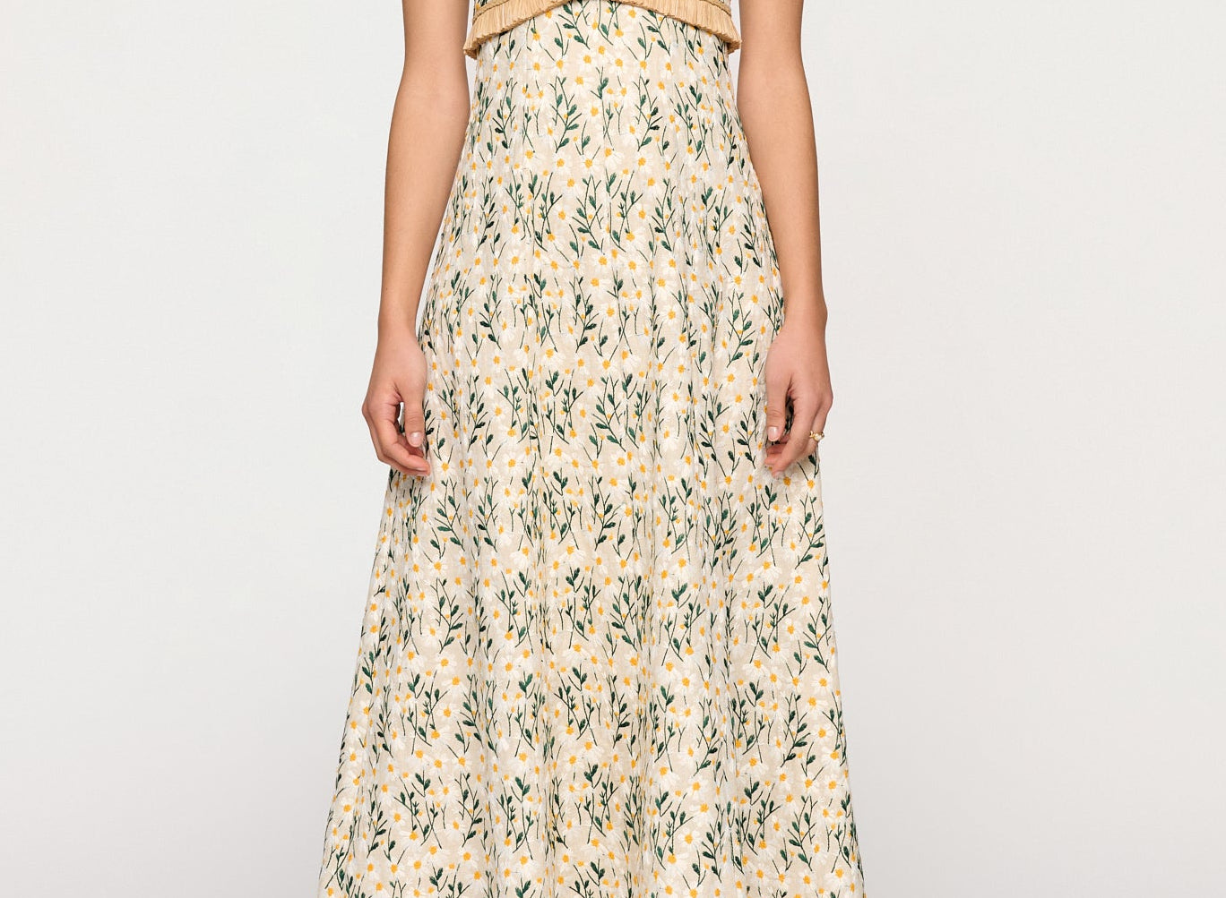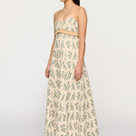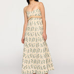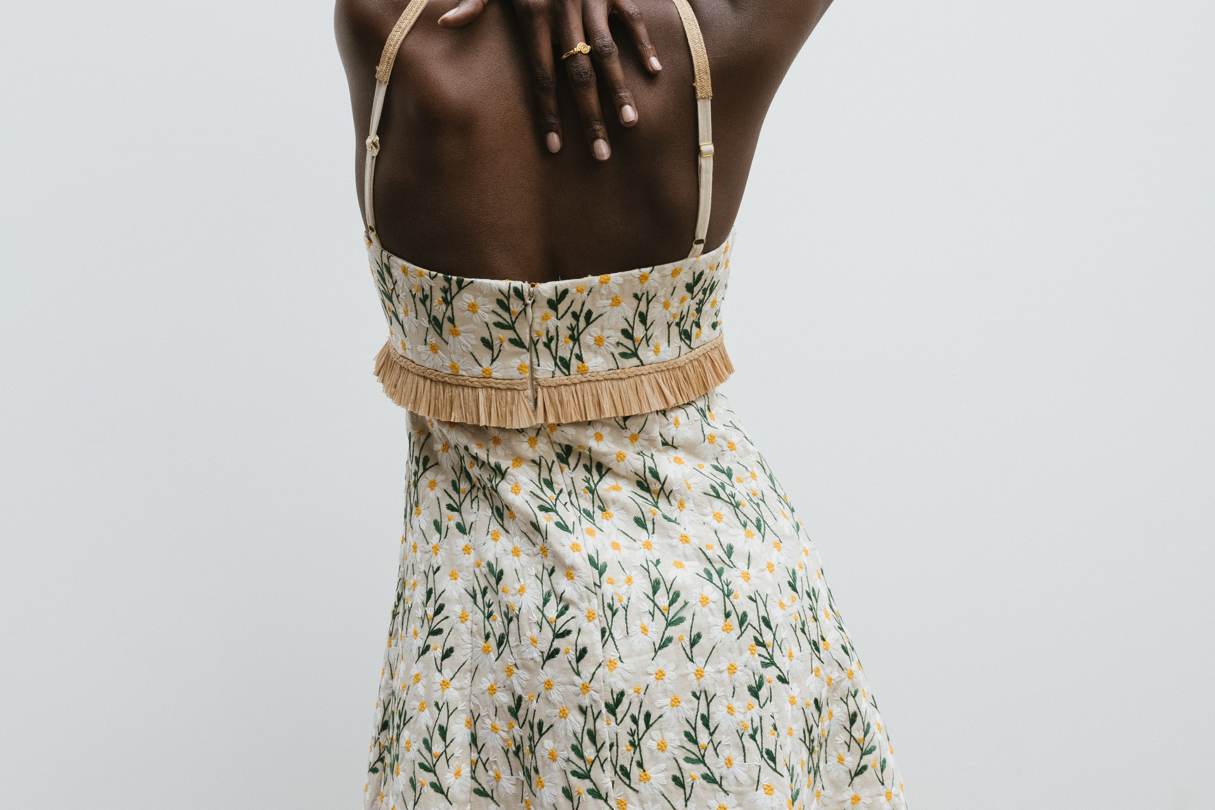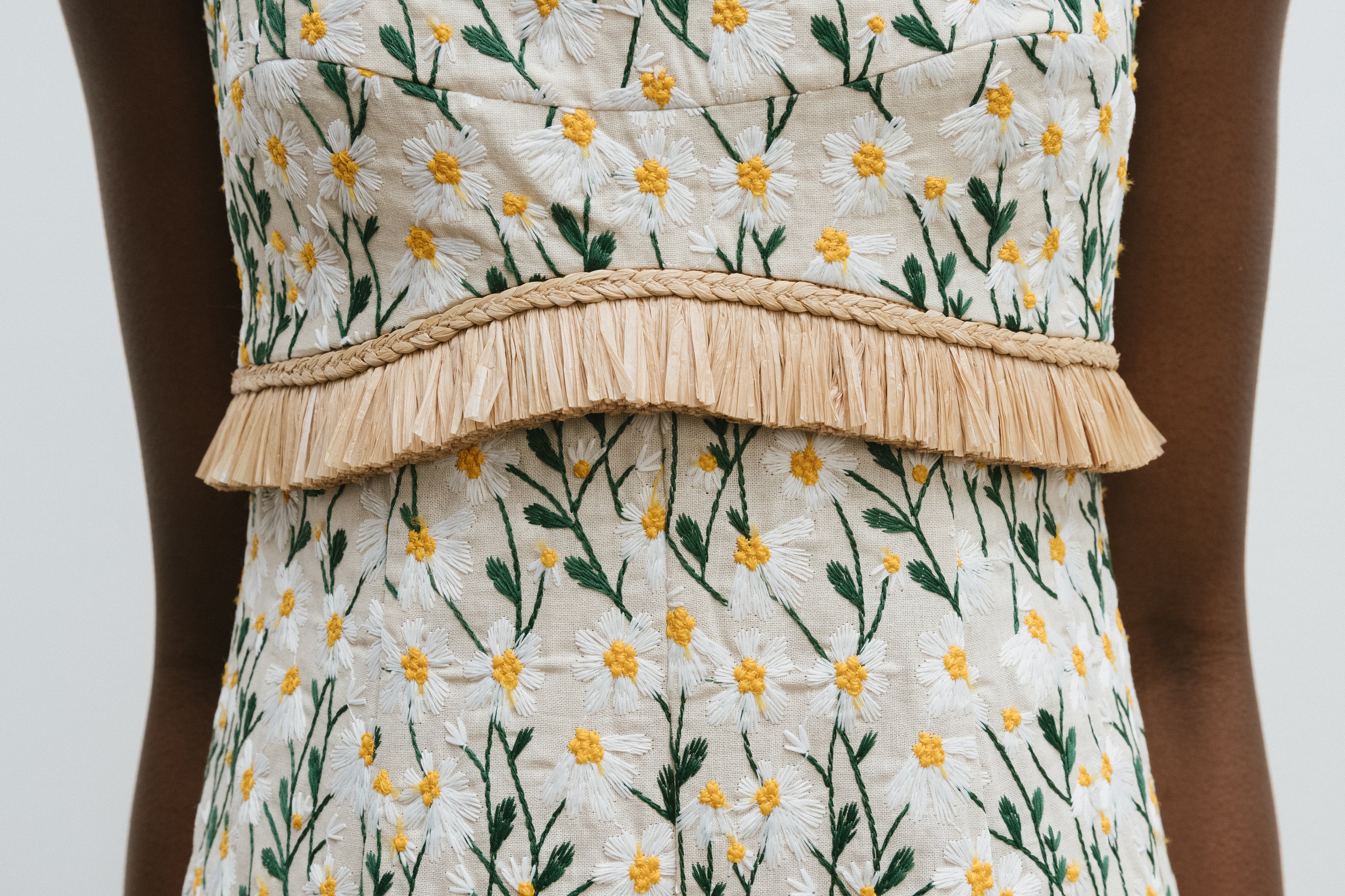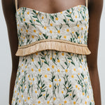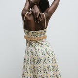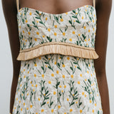 Introducing Clea's Salvador Midi Dress in Daisy Meadow, a maxi dress silhouette in daisy meadow embroidery. The Salvador Dress features a shaped bodice that flows into a full circular-cut skirt. Raffia shoulder straps and coordinating raffia trim at the waist subtly frame the form, adding natural texture and definition. Designed with depth and movement, the Salvador embodies effortless femininity with artisanal detail.