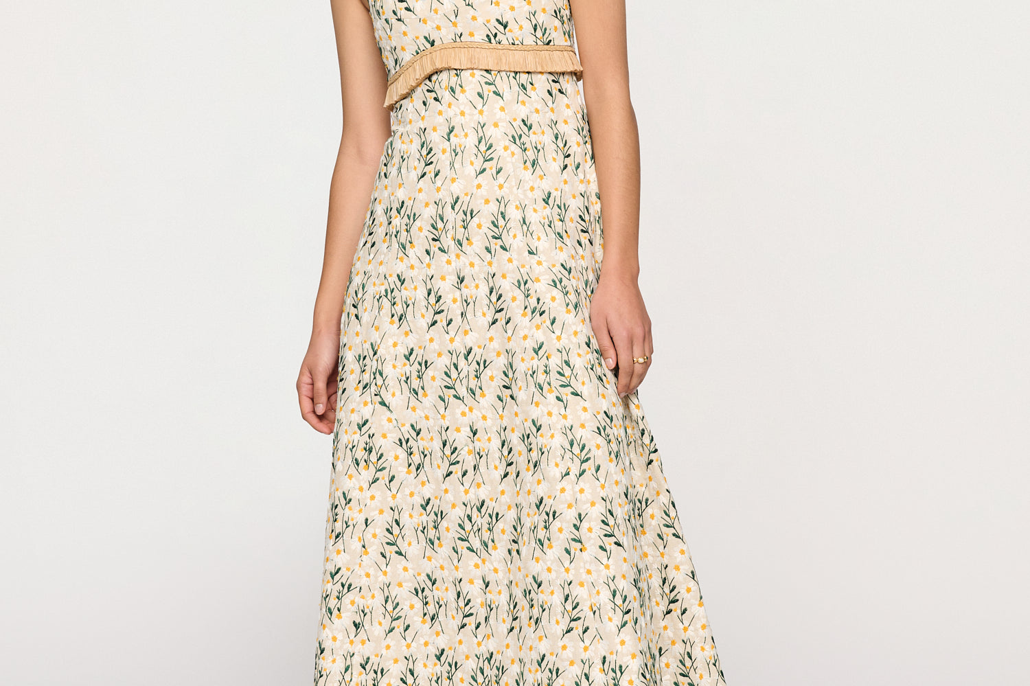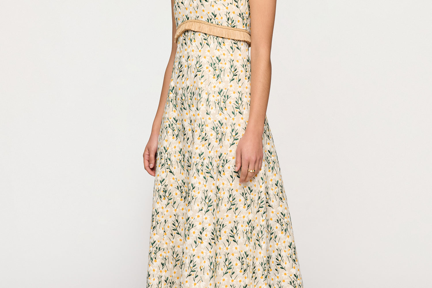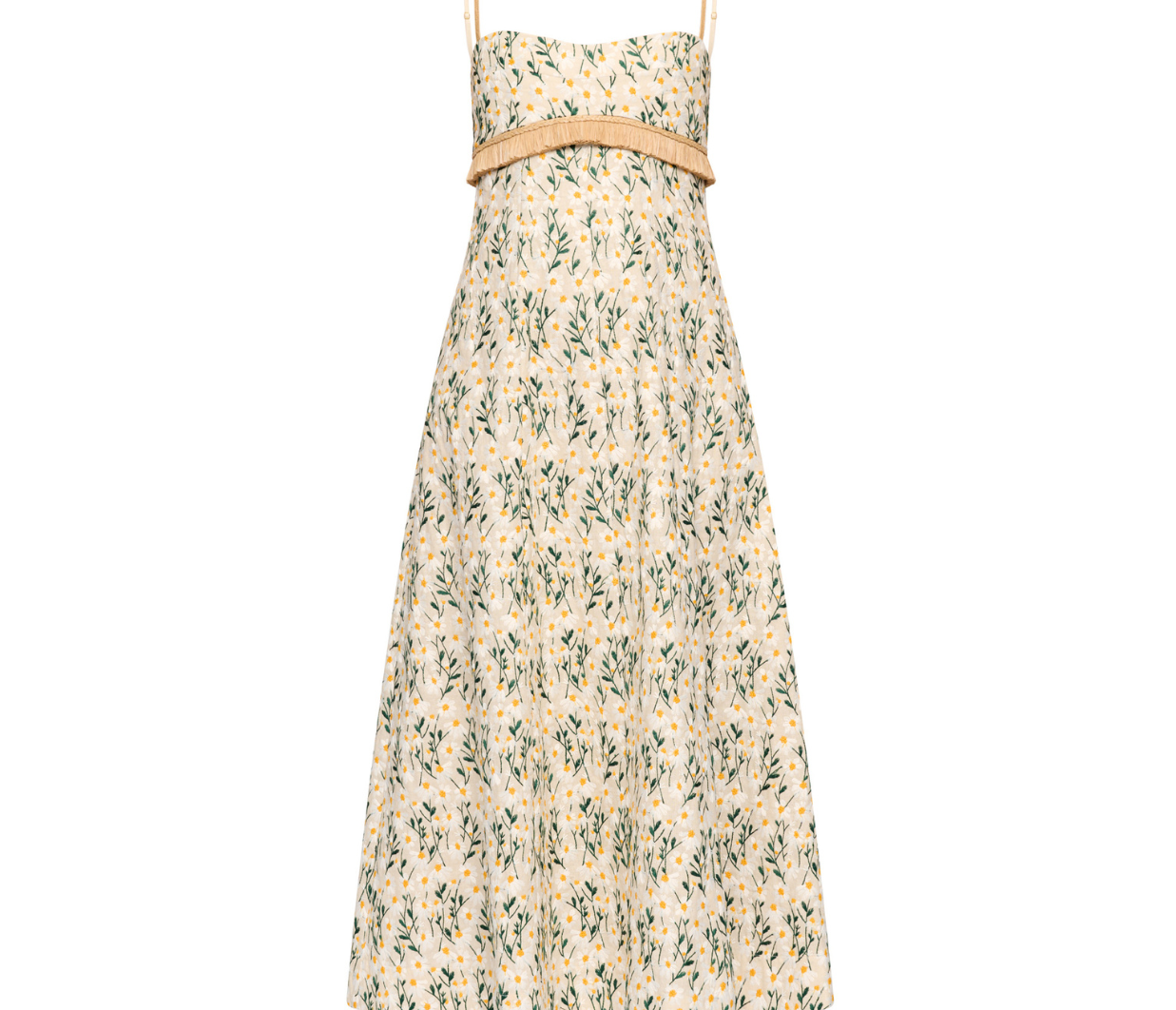 Introducing Clea's Salvador Midi Dress in Daisy Meadow, a maxi dress silhouette in daisy meadow embroidery. The Salvador Dress features a shaped bodice that flows into a full circular-cut skirt. Raffia shoulder straps and coordinating raffia trim at the waist subtly frame the form, adding natural texture and definition. Designed with depth and movement, the Salvador embodies effortless femininity with artisanal detail.