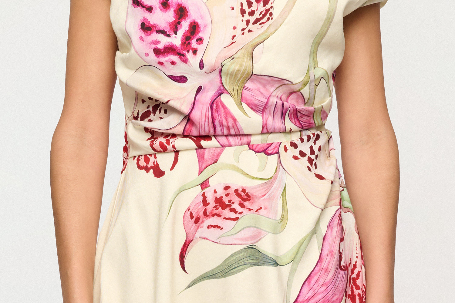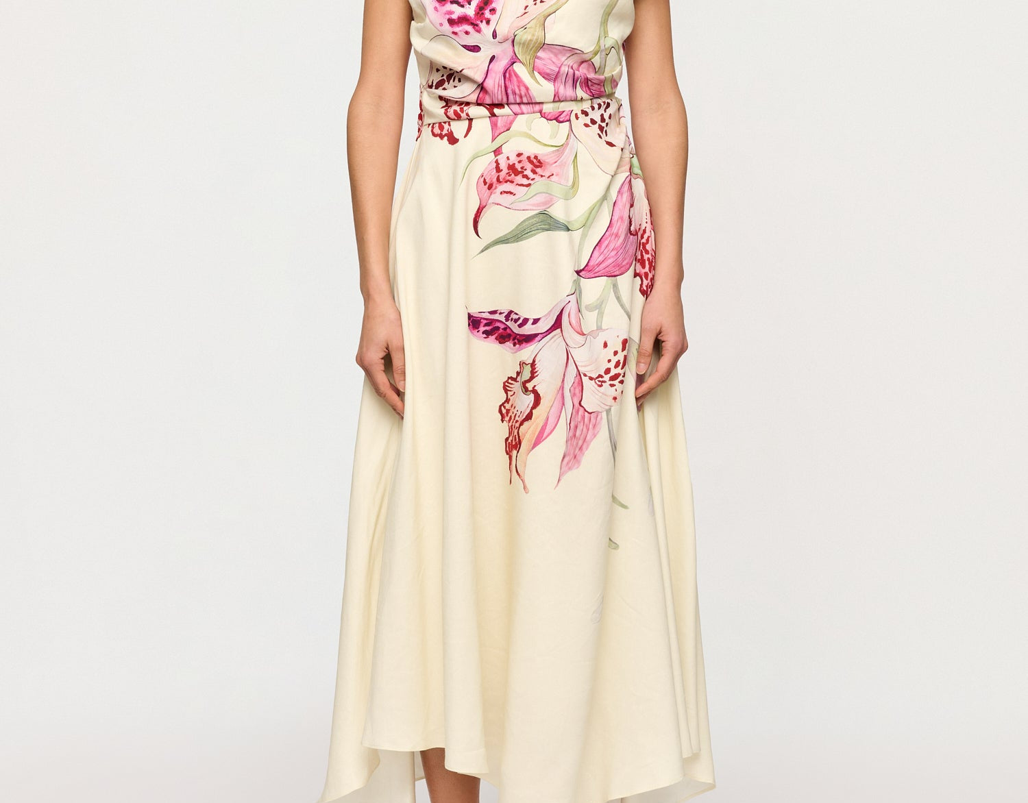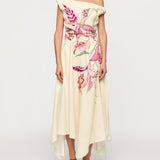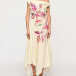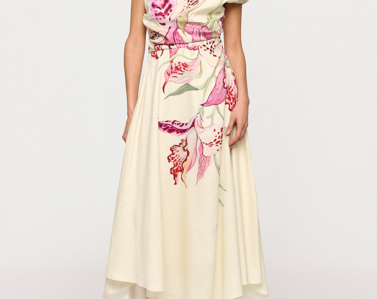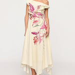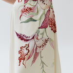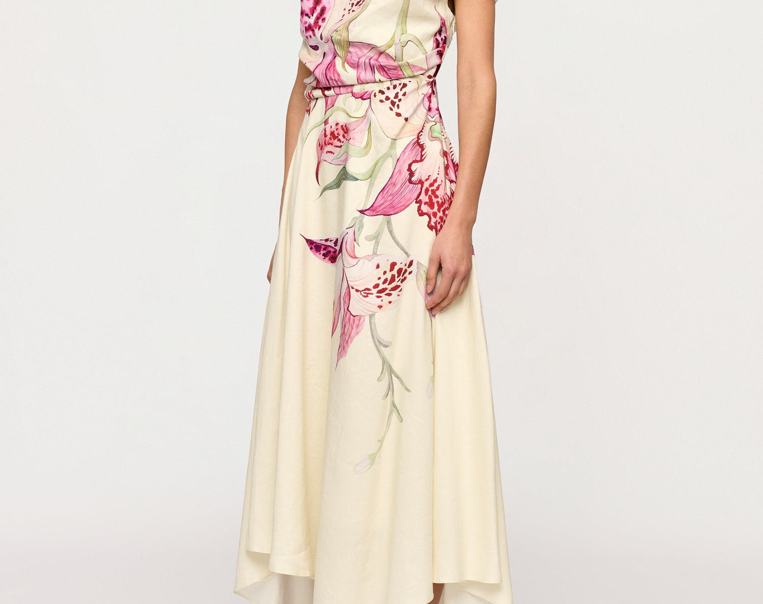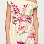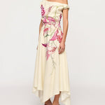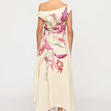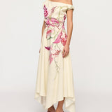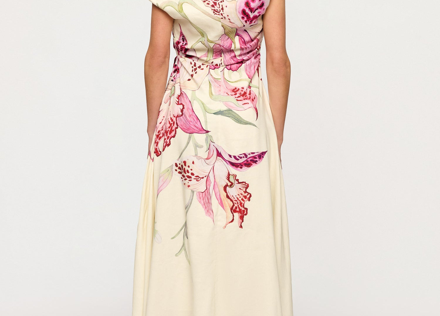 Introducing Clea’s Waverly Dress, an asymmetric off-shoulder maxi silhouette featuring the exclusive Kuro Neko orchid print in soft ivory. Designed with a draped shoulder, softly tucked waist, and handkerchief hemline, the Waverly Dress is a refined choice for event dressing.