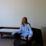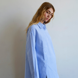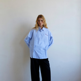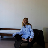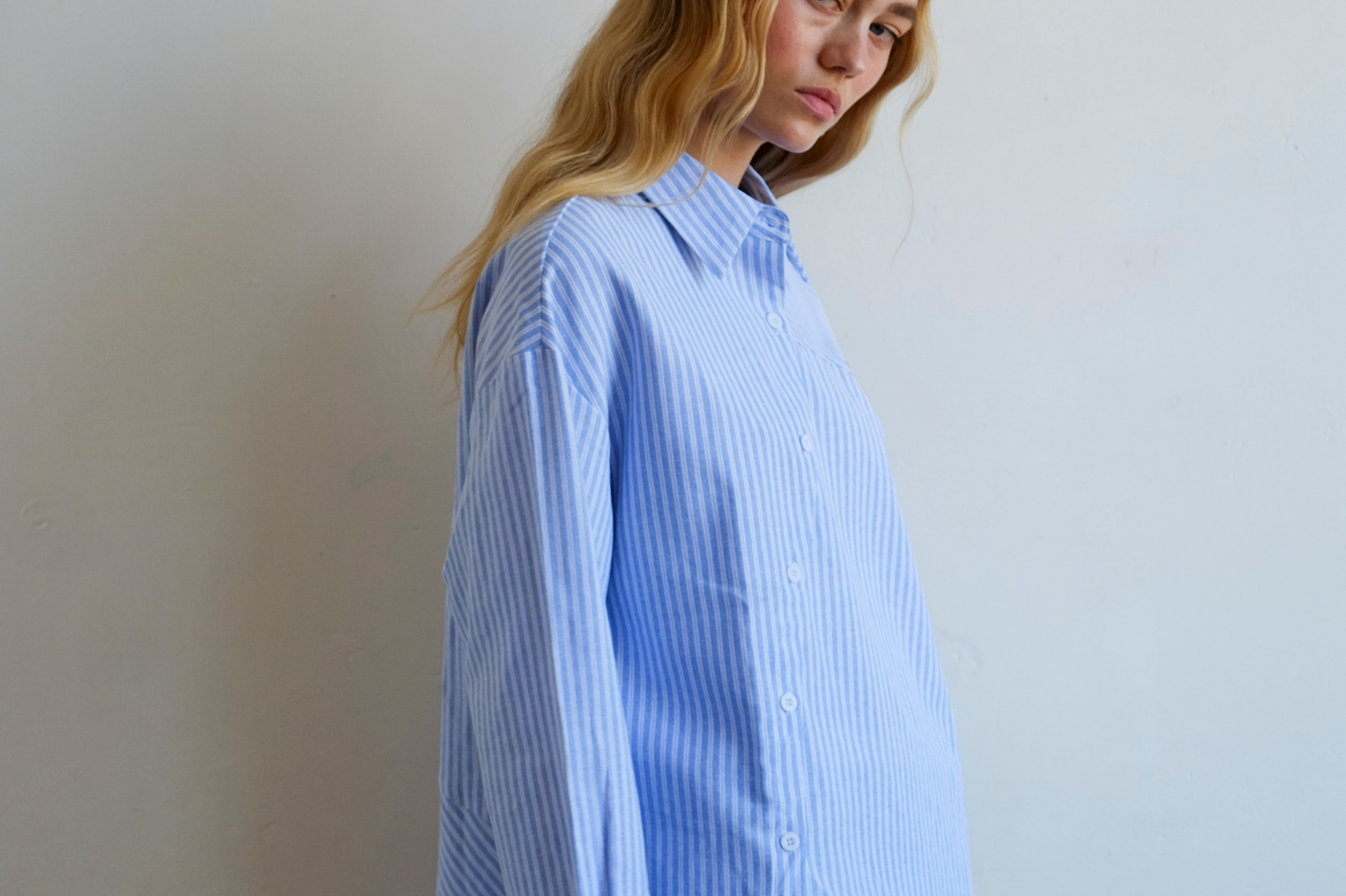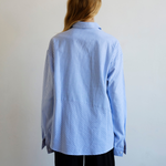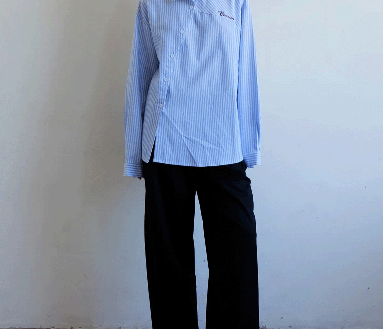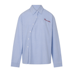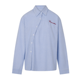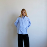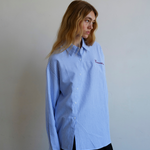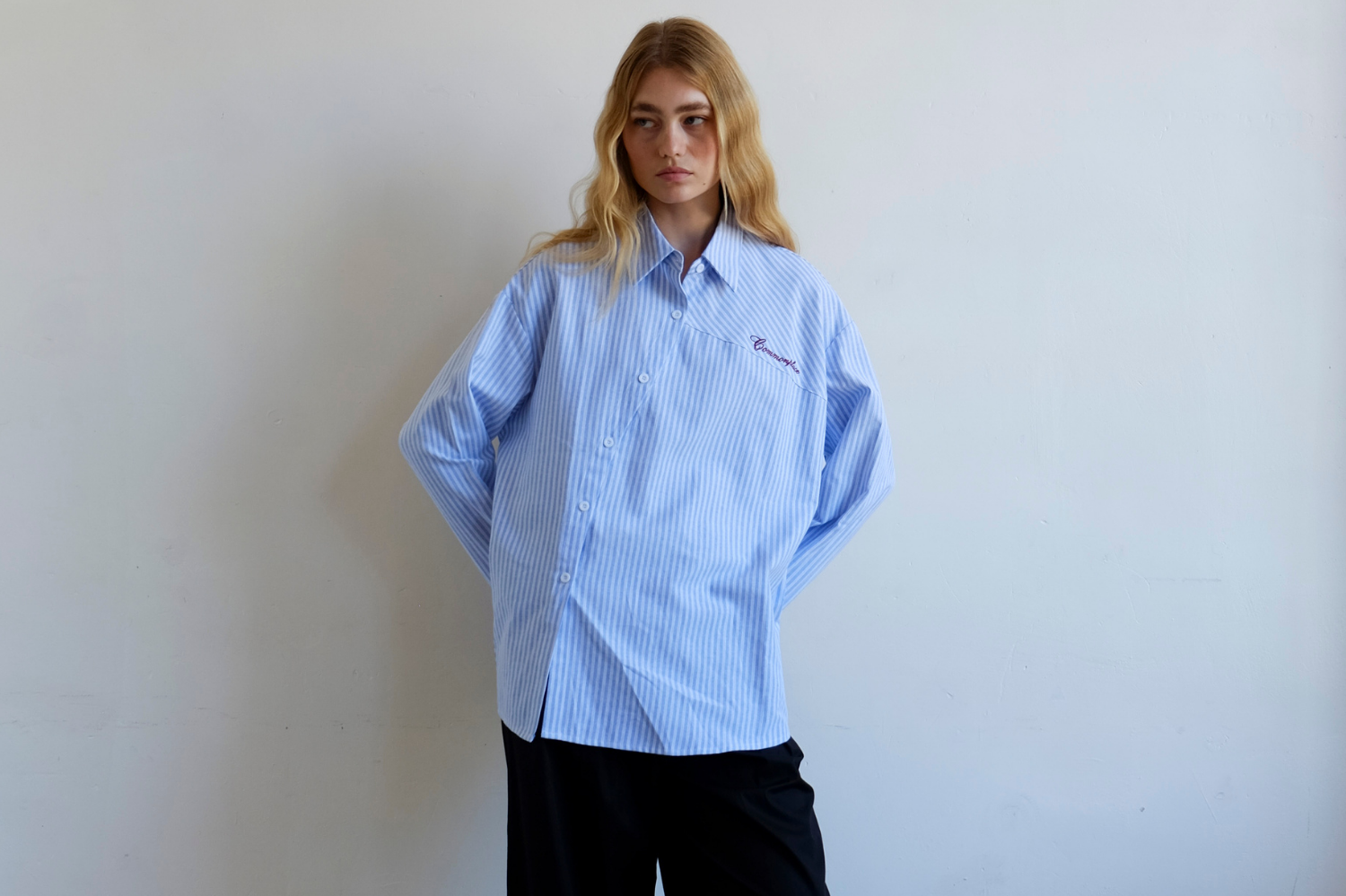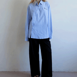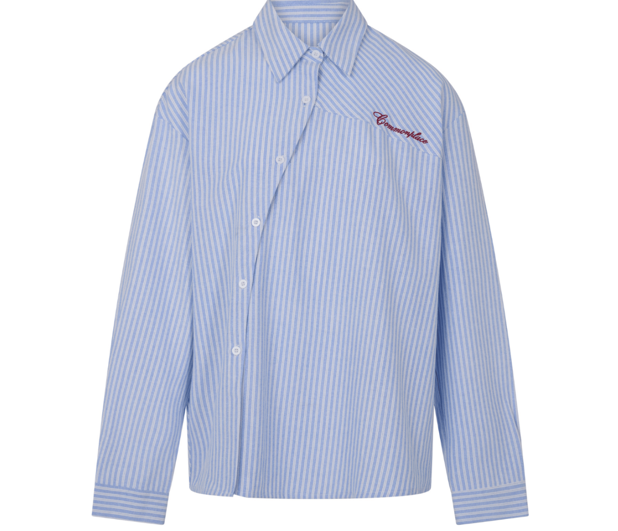 Introducing Commonplace Essential's Cortez Shirt in Sky Stripe, a classic point-collared t-shirt silhouette in blue stripe. The Cortez shirt is a relaxed silhouette with a button-through front and curved hemline finished with a red, embroidered logo. Style it with a denim bottom for a coordinated look.