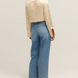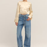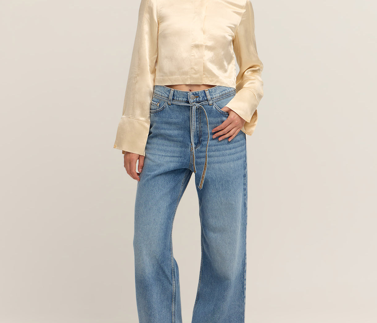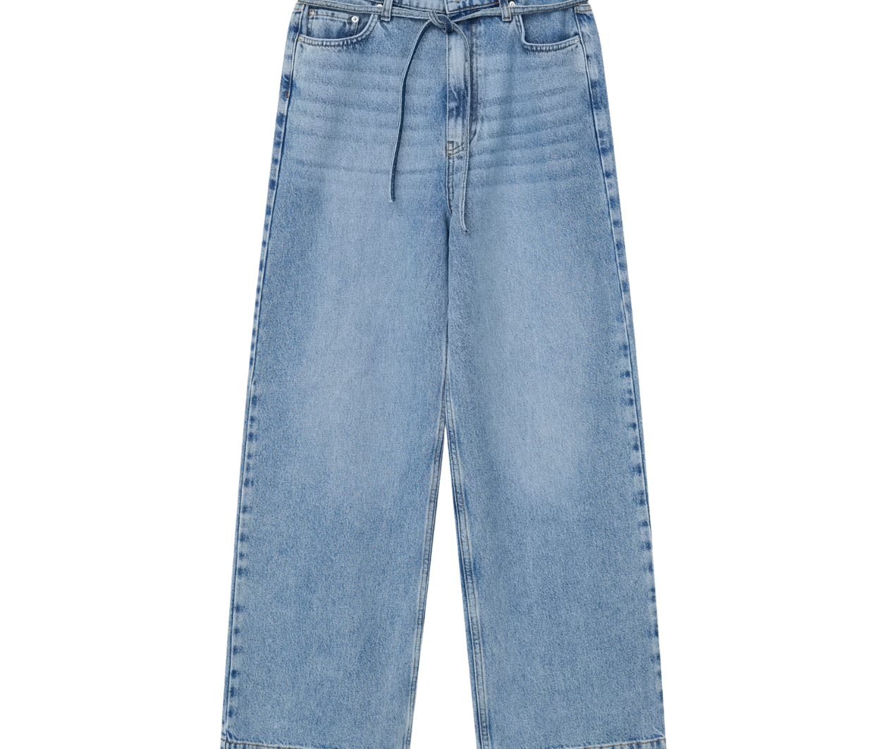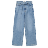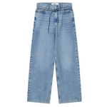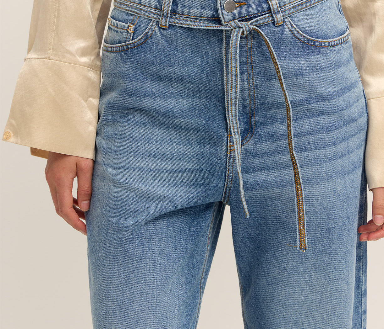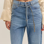 Introducing Elijah Denim Jeans in Soft Blue. These low-rise, straight-leg jeans feature five pockets, a zip fly with button closure, and a removable tie belt at the waist. The jeans have a loose fit.