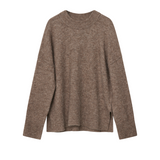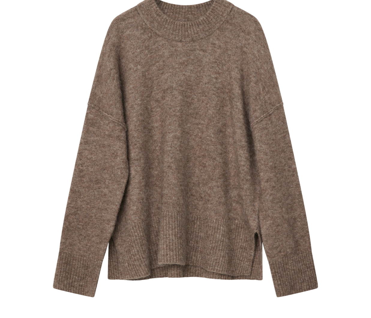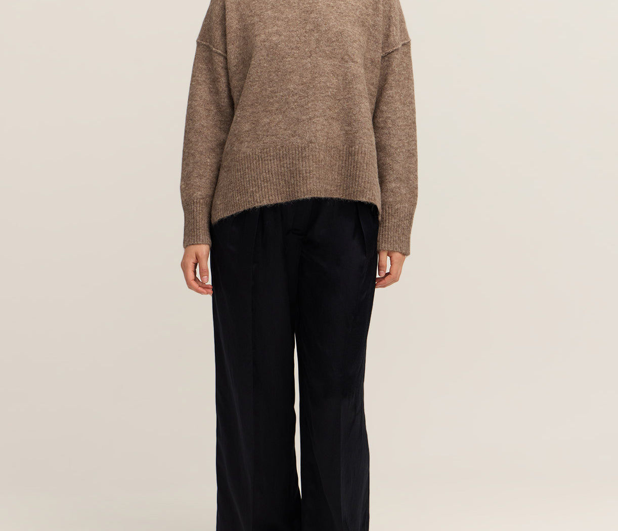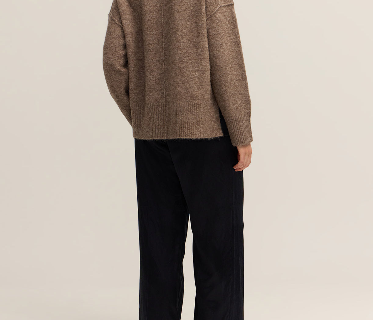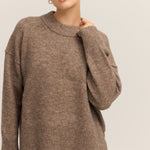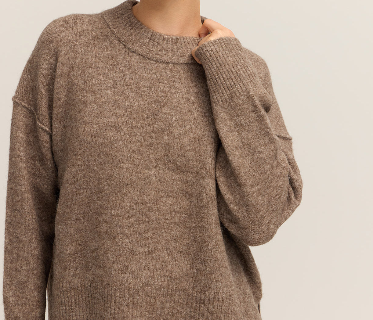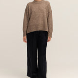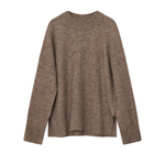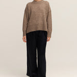 Introducing Josie Cozy Days Pullover in Walnut. Crafted from a luxurious blend of wool, alpaca this soft, thick jumper is designed for ultimate comfort. Ribbed detailing at the neck, hem, and wrists adds subtle texture, while the dipped hem and oversized fit create a relaxed silhouette perfect for layering.