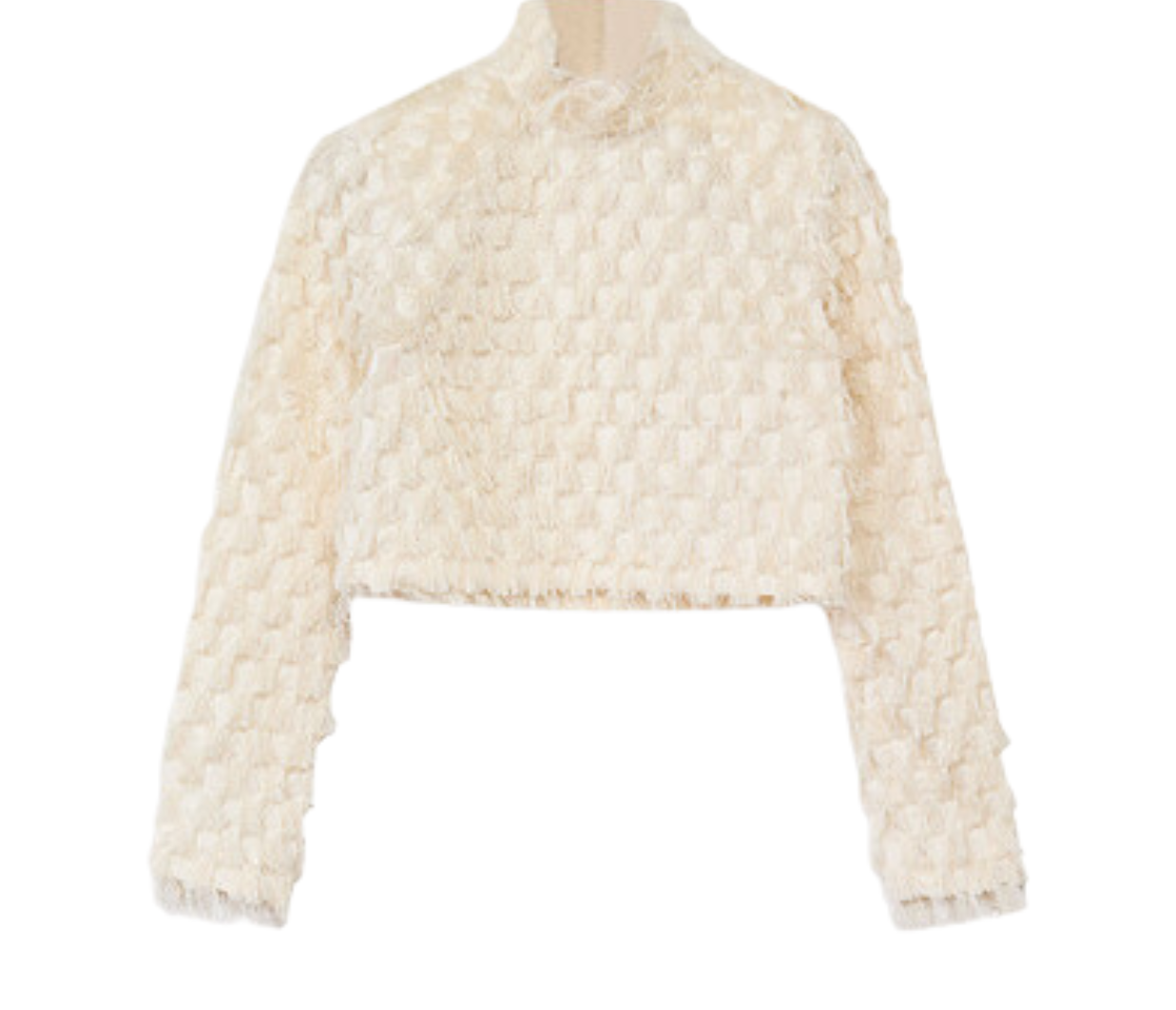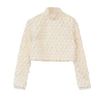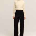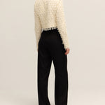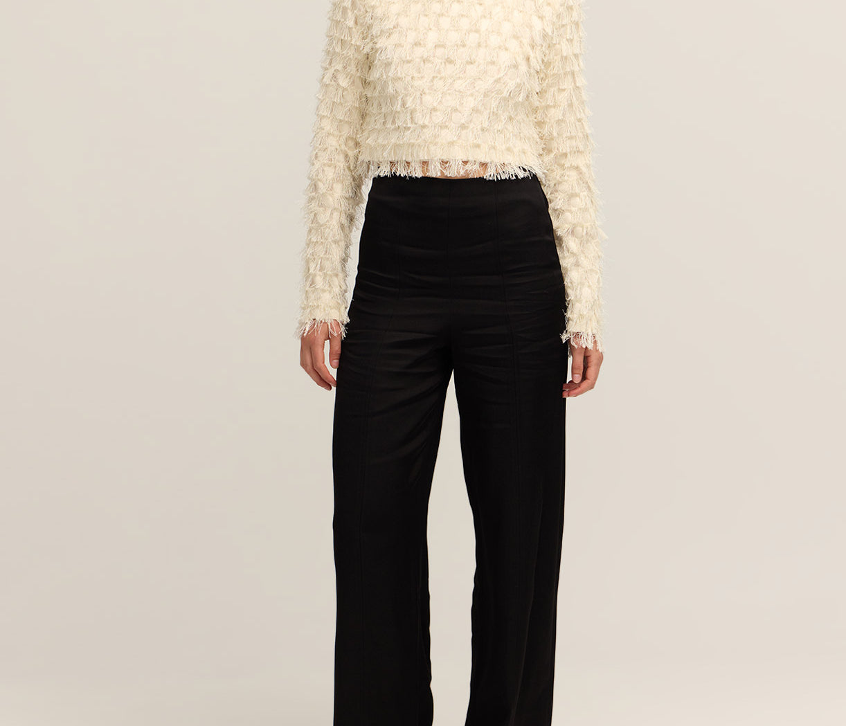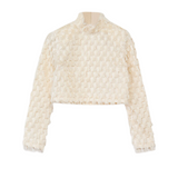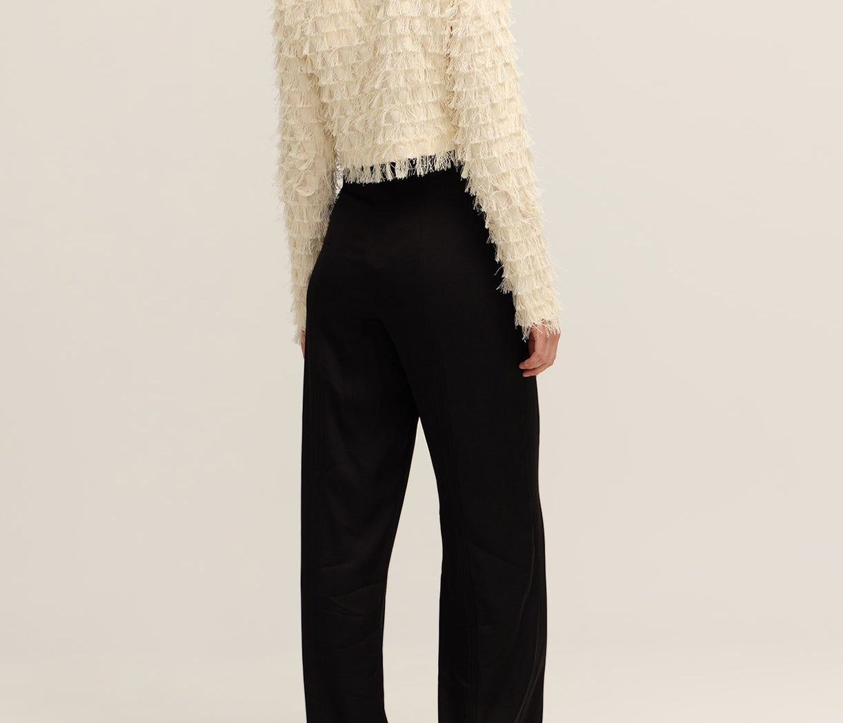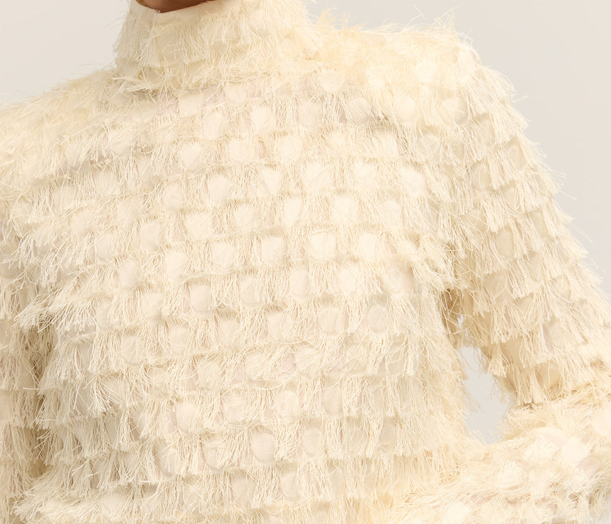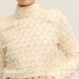Introducing Lynette Abstract Fringe Top in Vanilla Ice. Crafted with a sleek high neckline and structured padded shoulders, this top creates a striking silhouette. The zip closure at the back ensures a secure fit, while delicate fringe details add playful movement and texture.