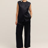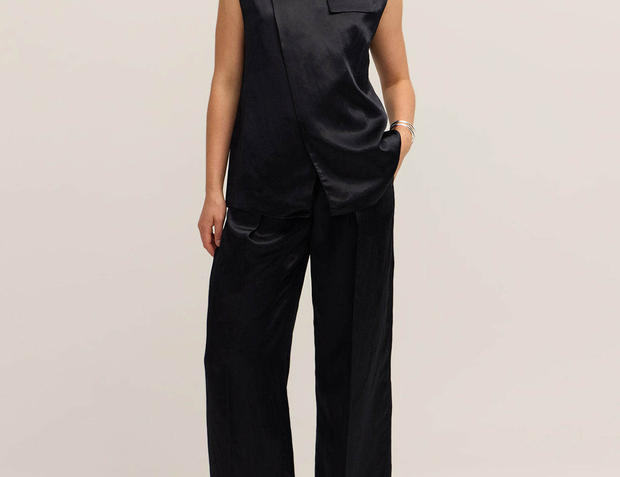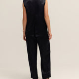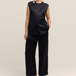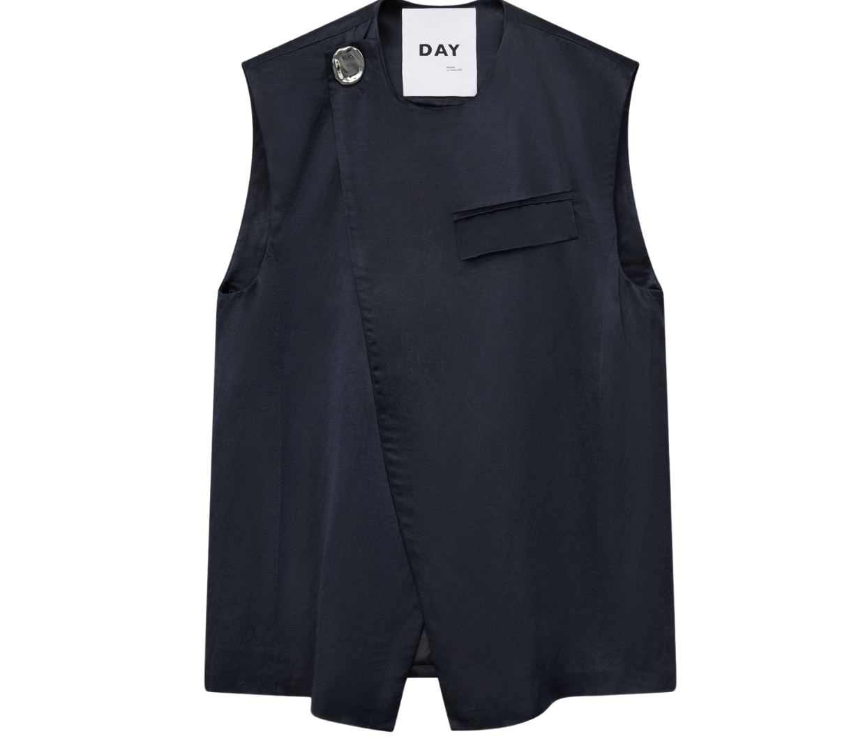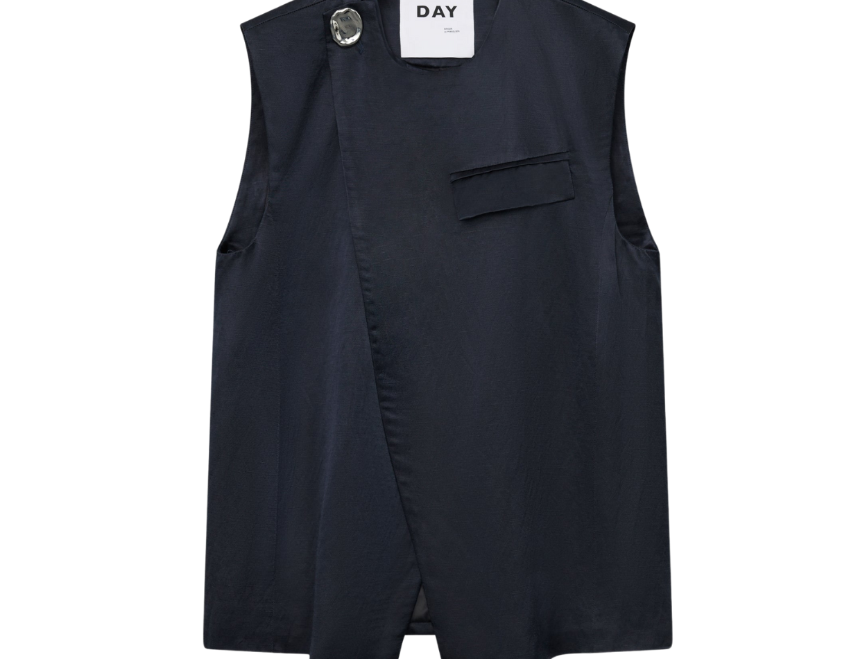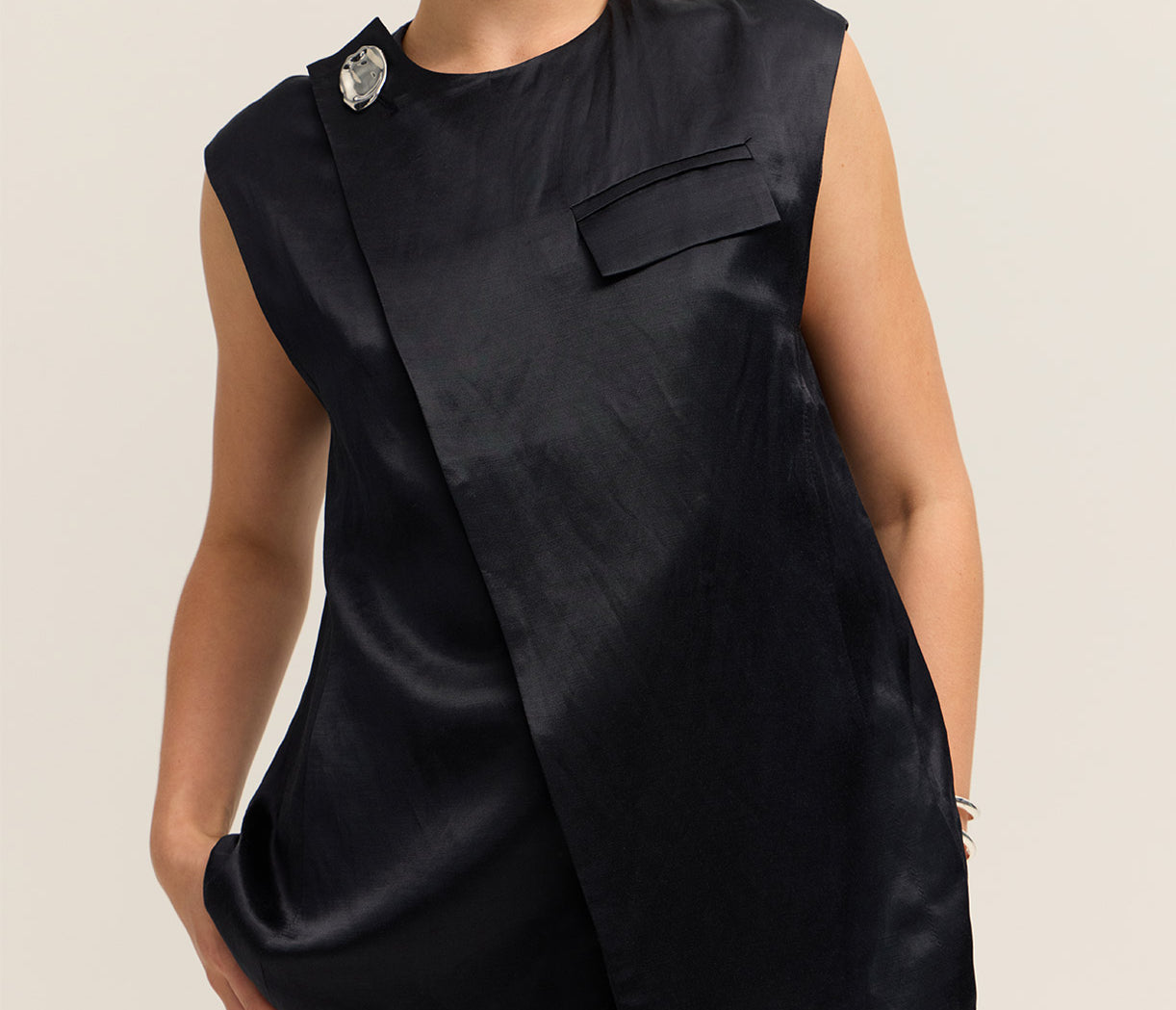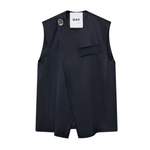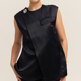 Introducing Marlin Waistcoat in Black, a bold reinterpretation of classic tailoring. This waistcoat features an eye-catching asymmetrical button closure at the shoulder, paired with a wrap-style front for an effortlessly modern look. An interior button ensures a secure fit, while the long back slit adds a touch of fluidity and movement.