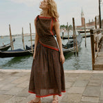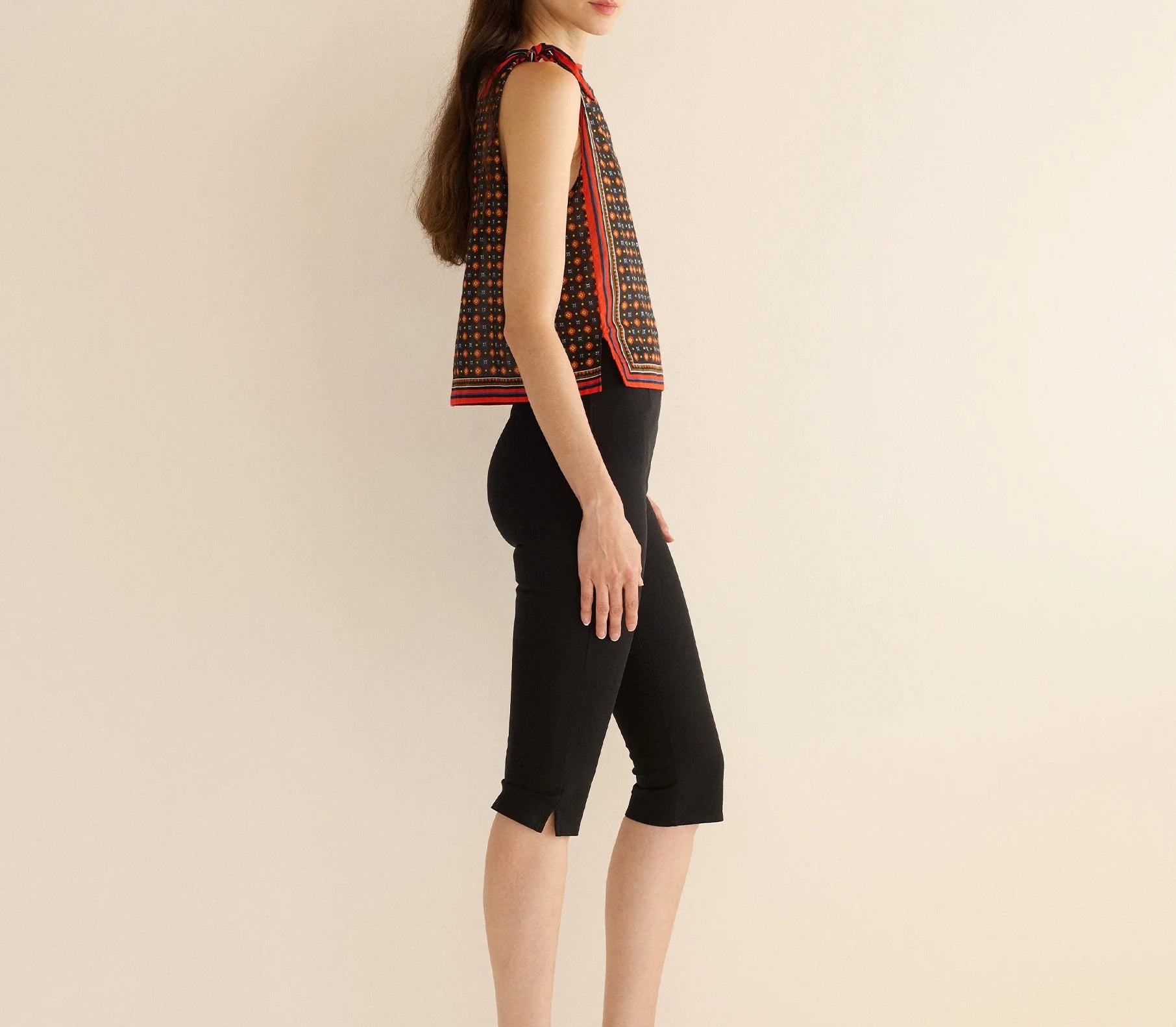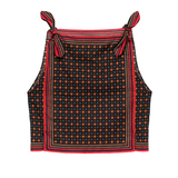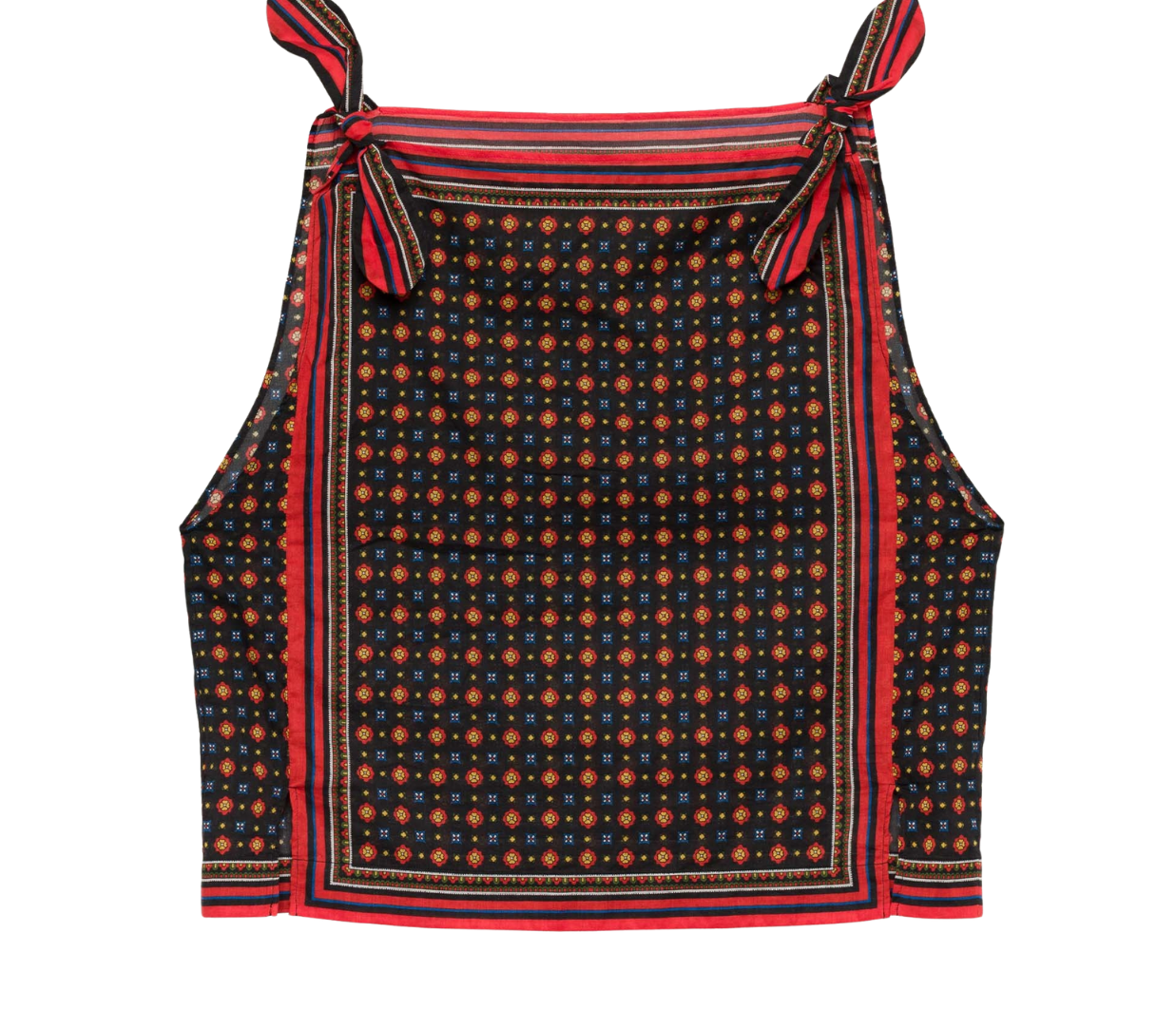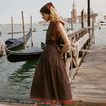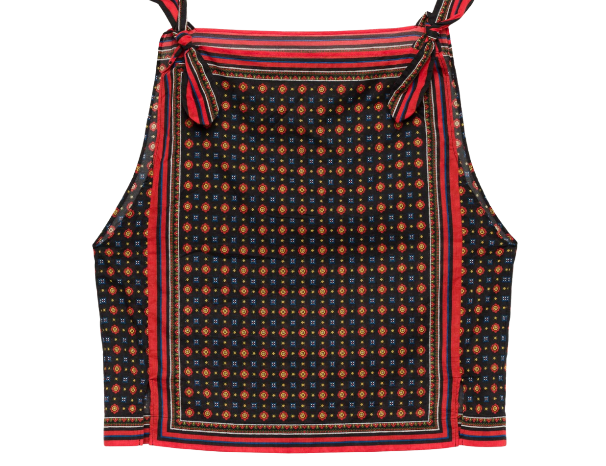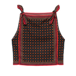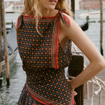 Introducing Doen's Amalia Top in Noir Montmartre Foulard a sleeveless top silhouette with a bateau neckline and adjustable shoulder ties. The top is designed in Montmartre Foulard print, and it is finished with placed stripe borders along the neckline and hem.