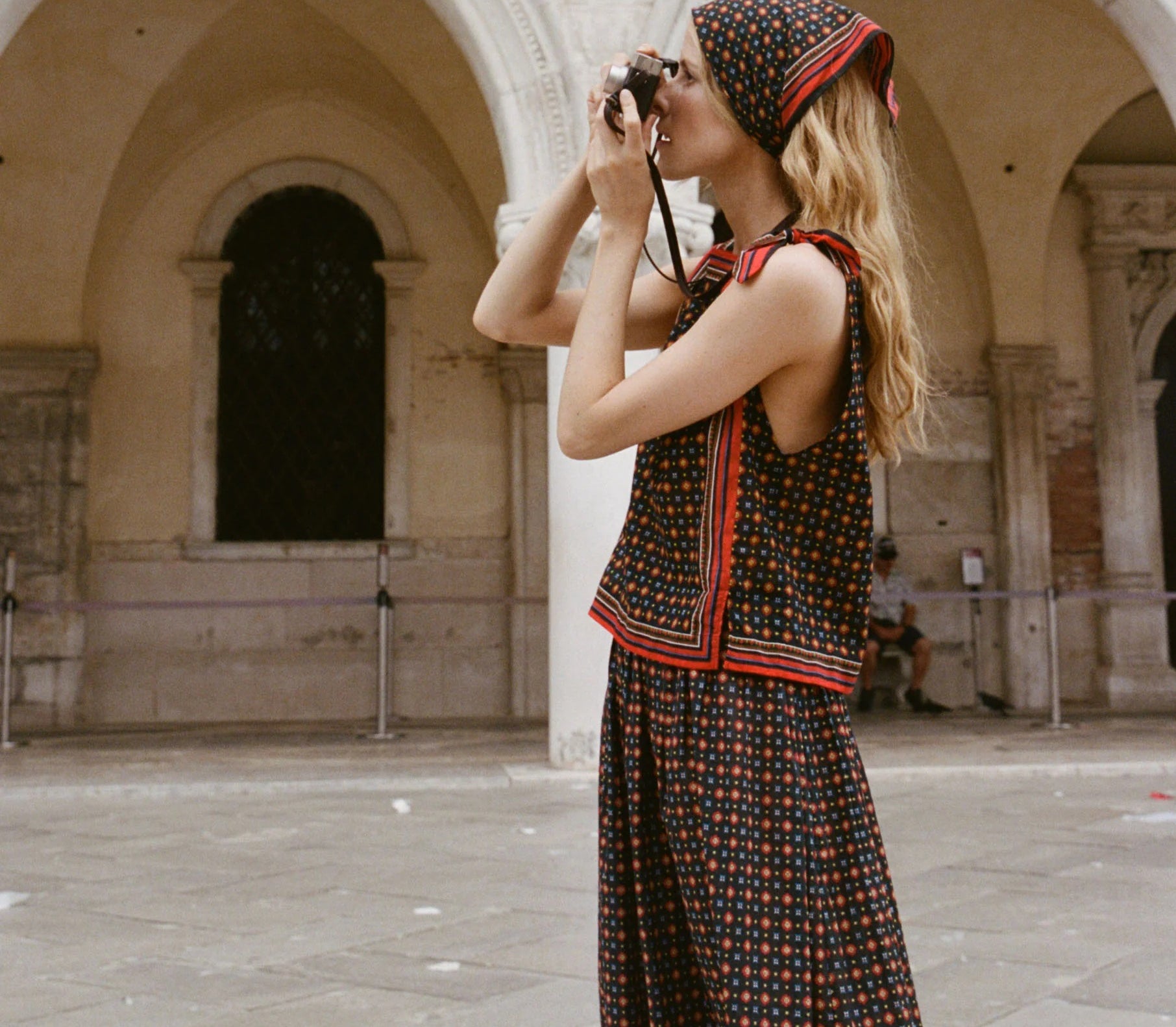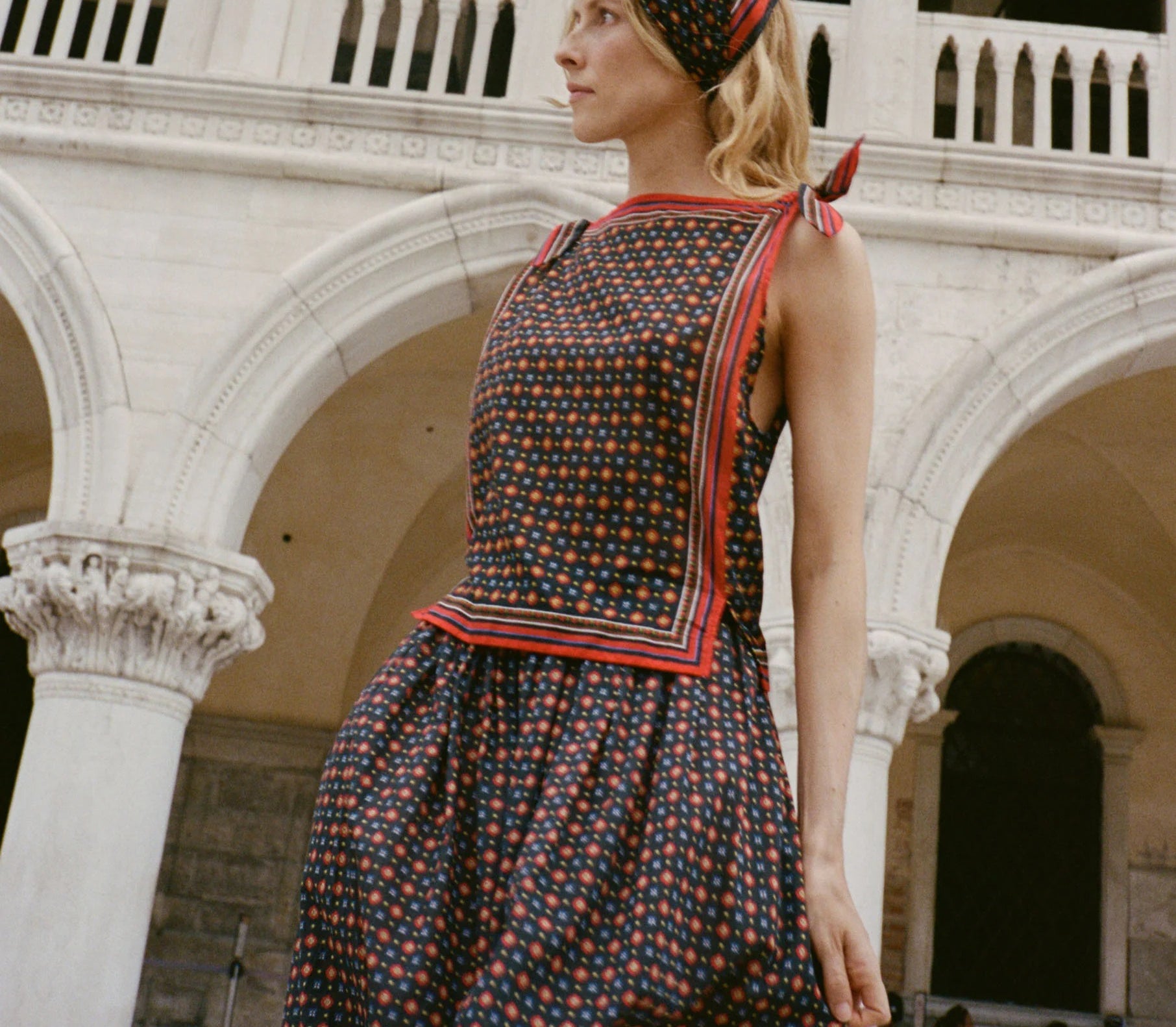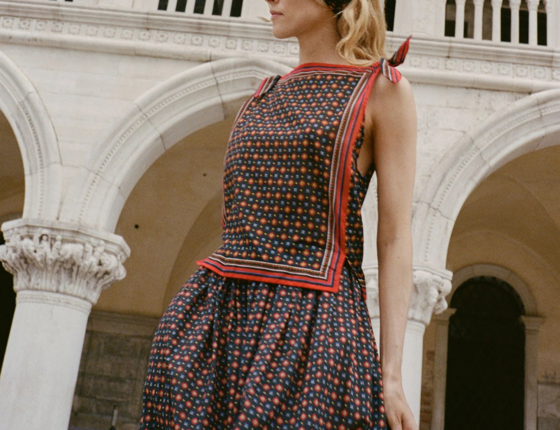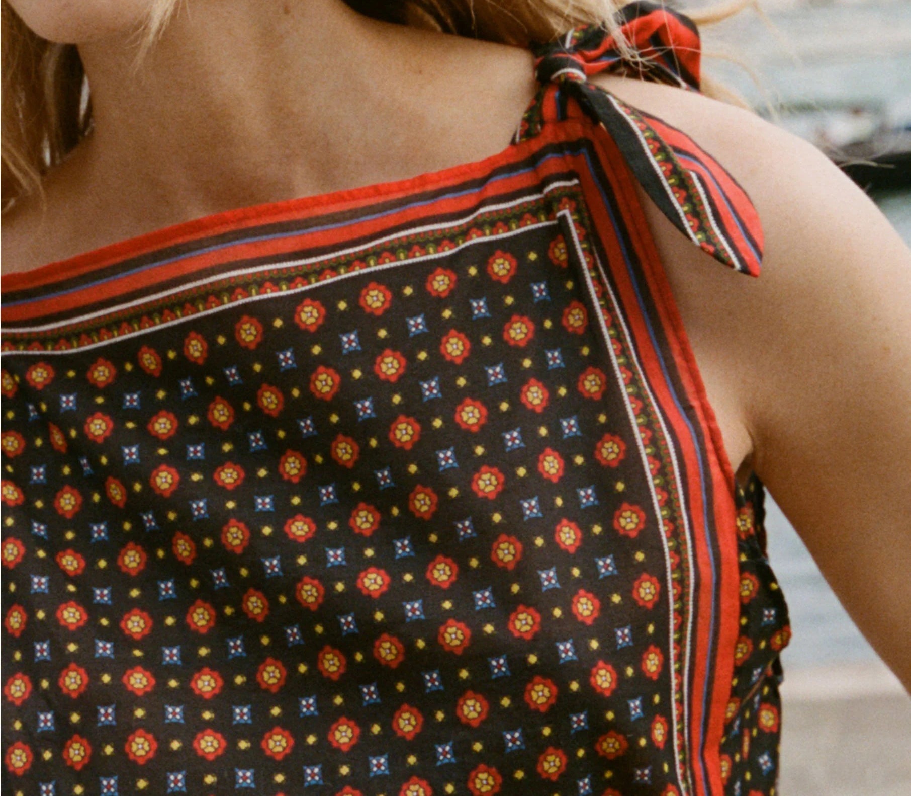 Introducing Doen's Amalia Top in Noir Montmartre Foulard a sleeveless top silhouette with a bateau neckline and adjustable shoulder ties. The top is designed in Montmartre Foulard print, and it is finished with placed stripe borders along the neckline and hem.