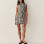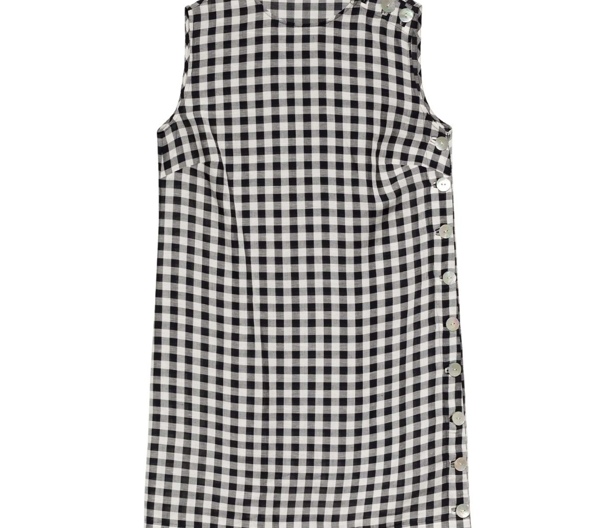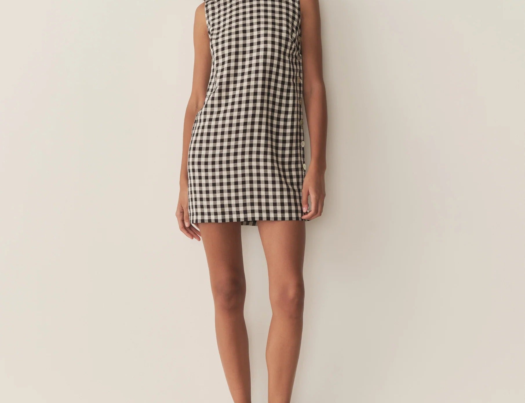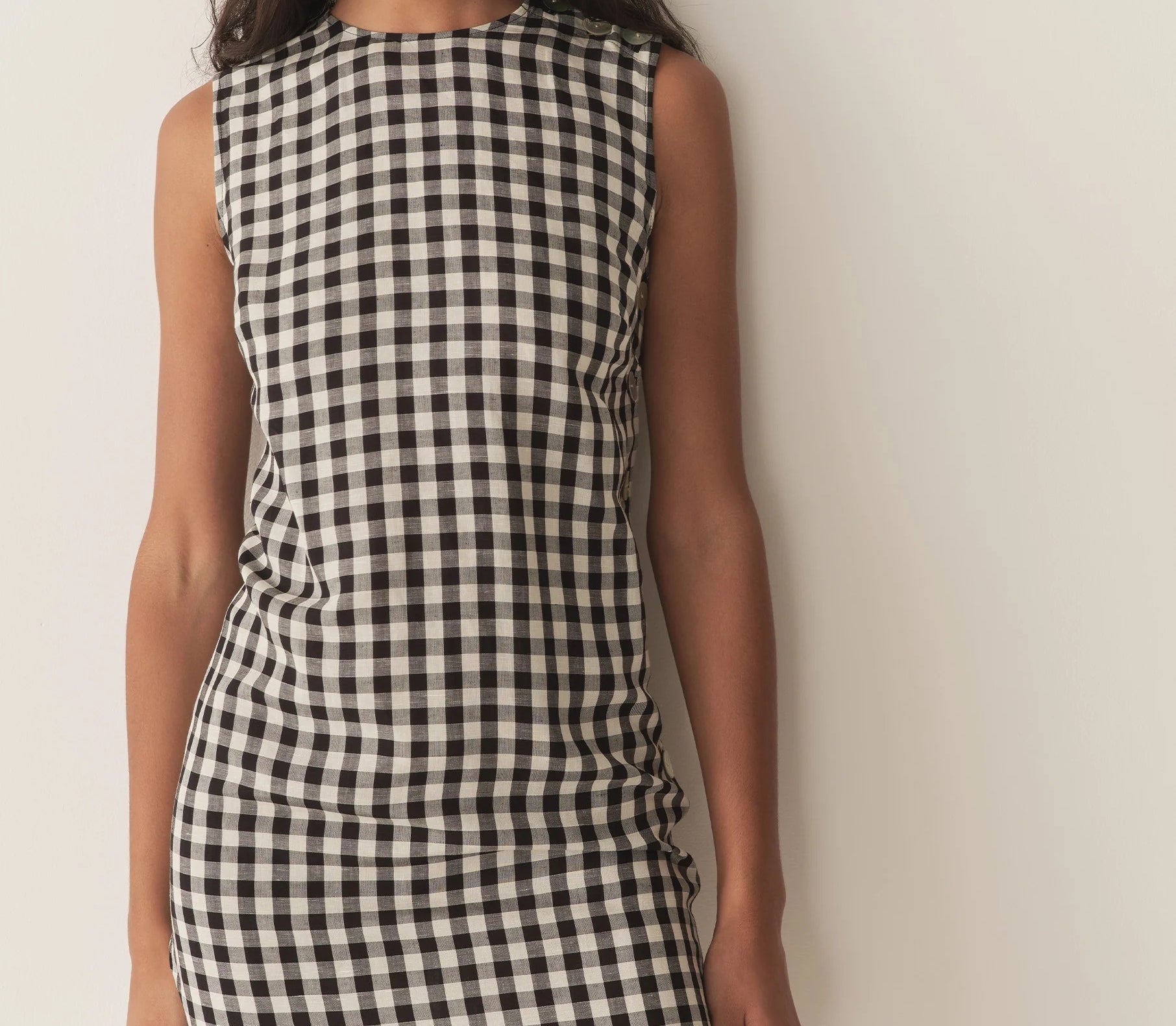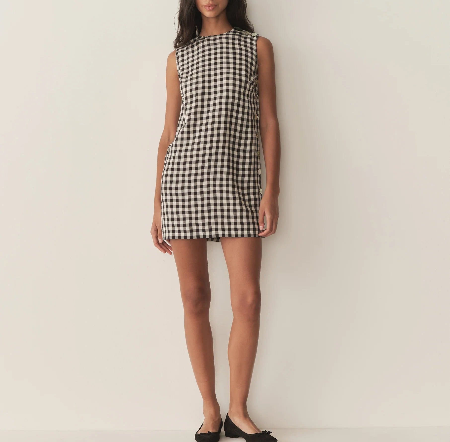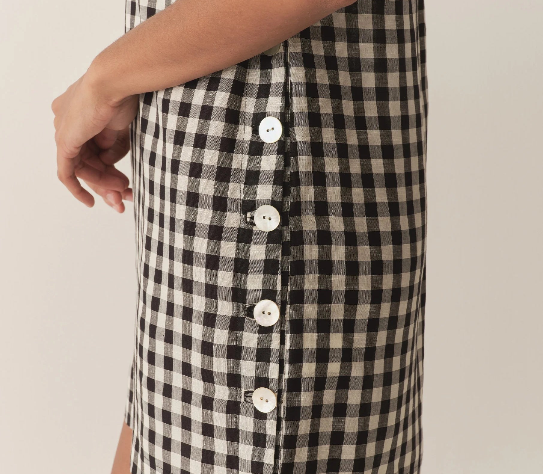 Introducing Doen's Coralie Dress in Black Marilyn Gingham . Crafted from a lightweight rayon-linen blend and rendered in our nostalgic Marilyn Gingham, the Coralie is a ‘60s-inspired sleeveless shift dress with a crew neckline, a straight cut, and a playful mini hemline. Shell buttons fasten at the side seam and shoulder.