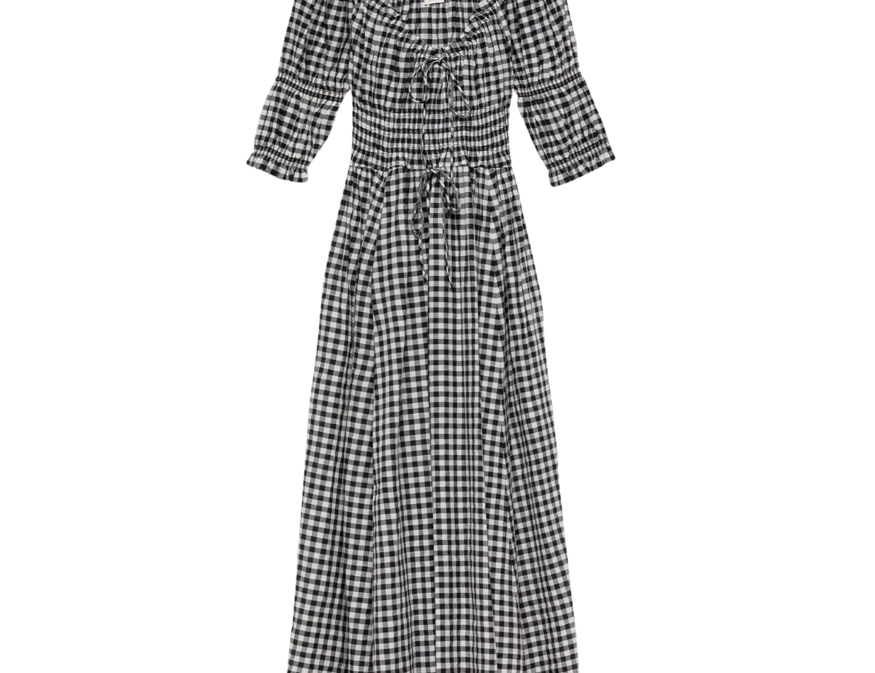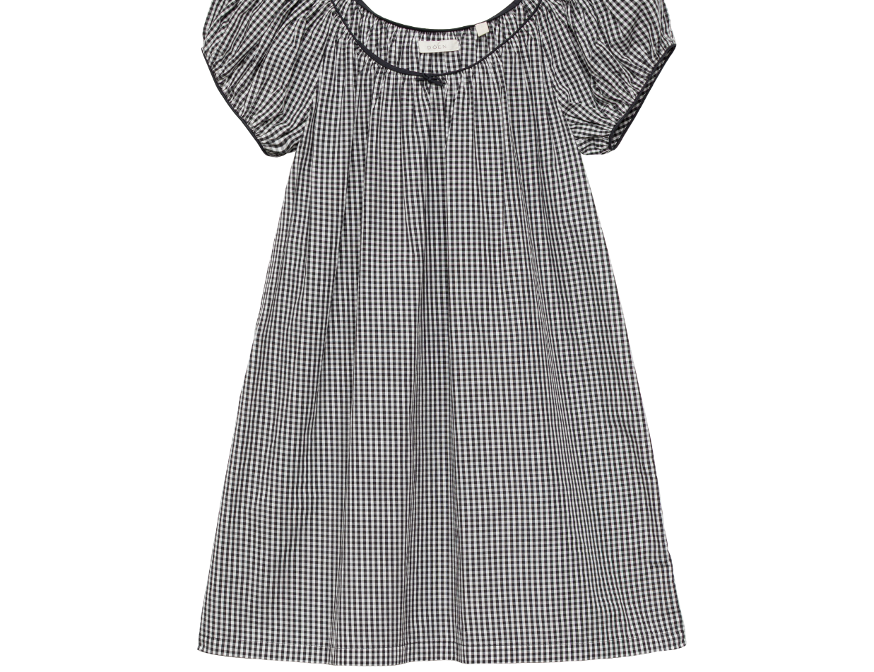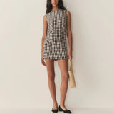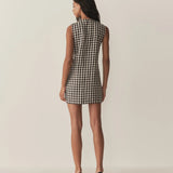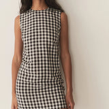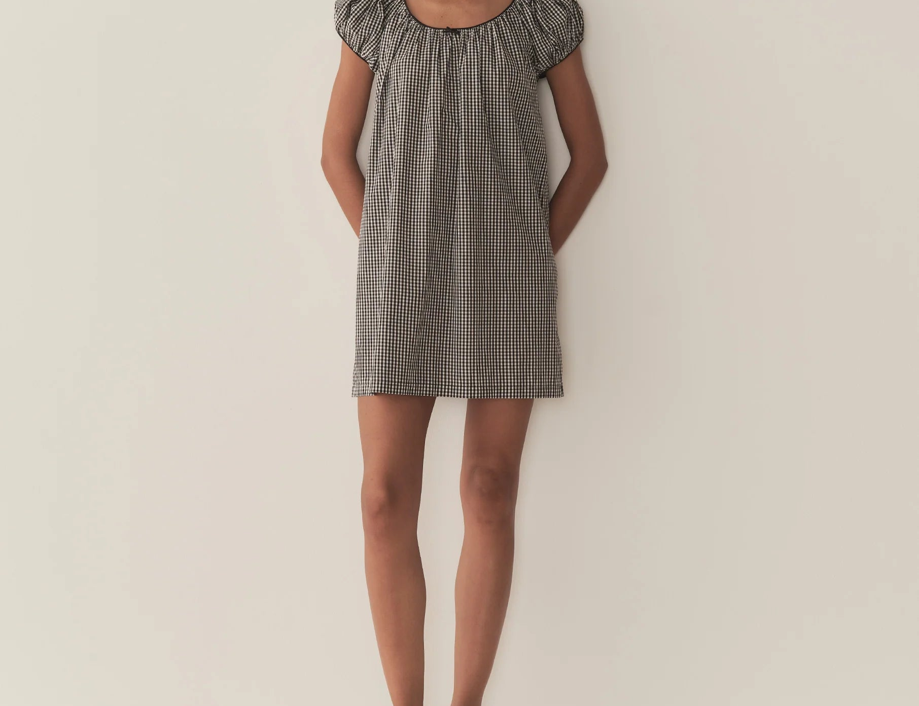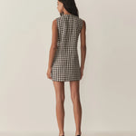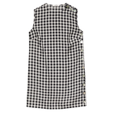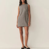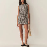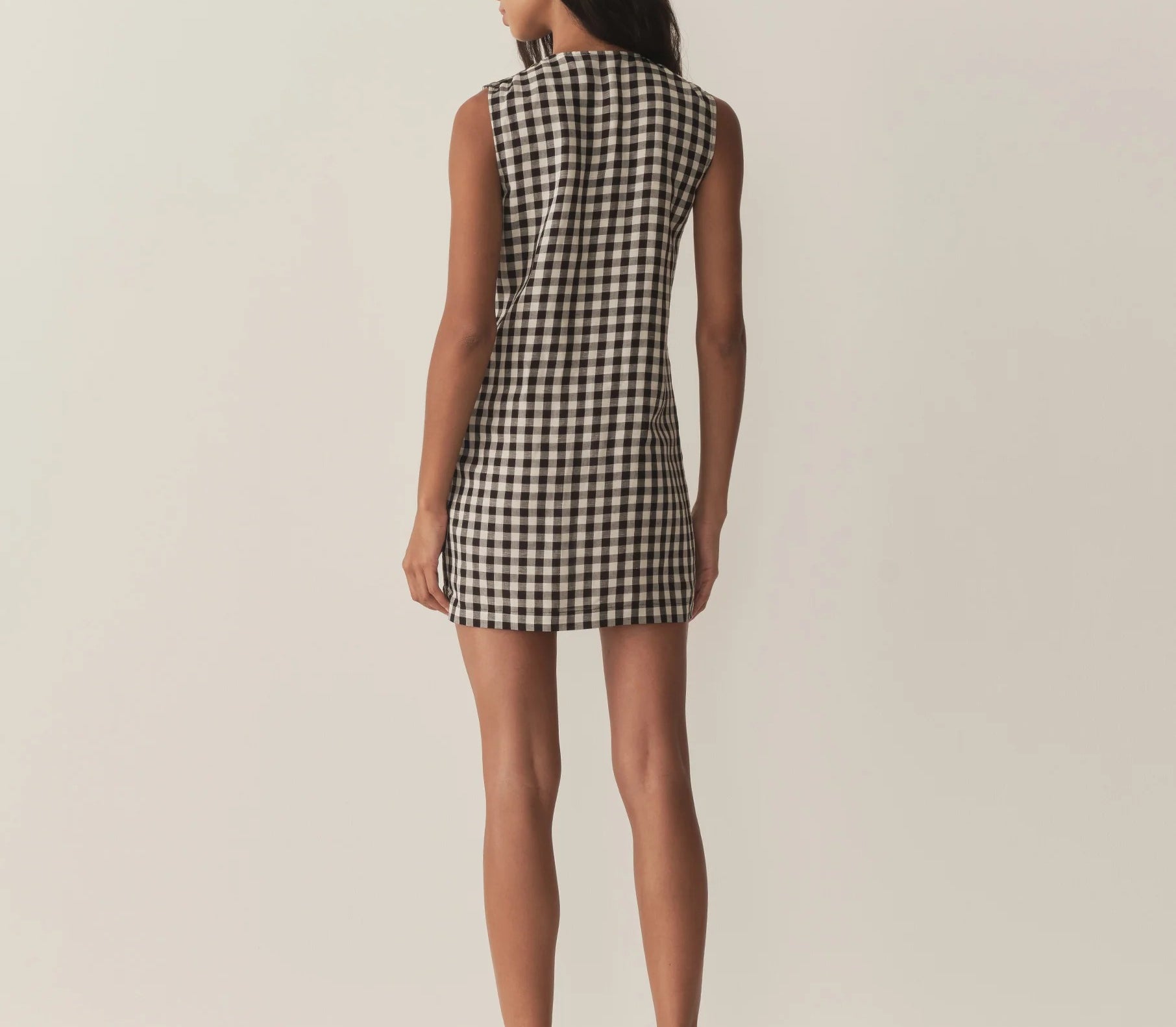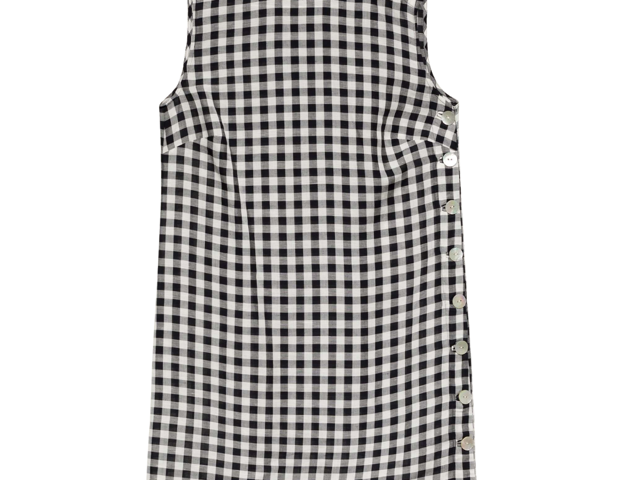 Introducing Doen's Coralie Dress in Black Marilyn Gingham . Crafted from a lightweight rayon-linen blend and rendered in our nostalgic Marilyn Gingham, the Coralie is a ‘60s-inspired sleeveless shift dress with a crew neckline, a straight cut, and a playful mini hemline. Shell buttons fasten at the side seam and shoulder.