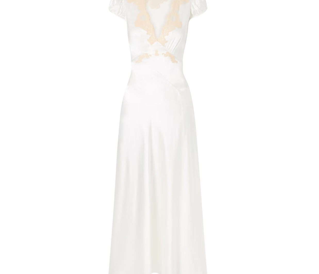 The Coraline' maxi dress takes cues from romantic lingerie. Designed with lace trims along the V-neckline, it's made from panels of lustrous silk-satin that are strategically cut and placed to draw the eye inward and has gently puffed sleeves. Adjust the slim ties to accentuate the waist.