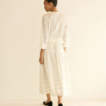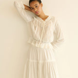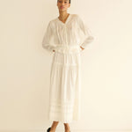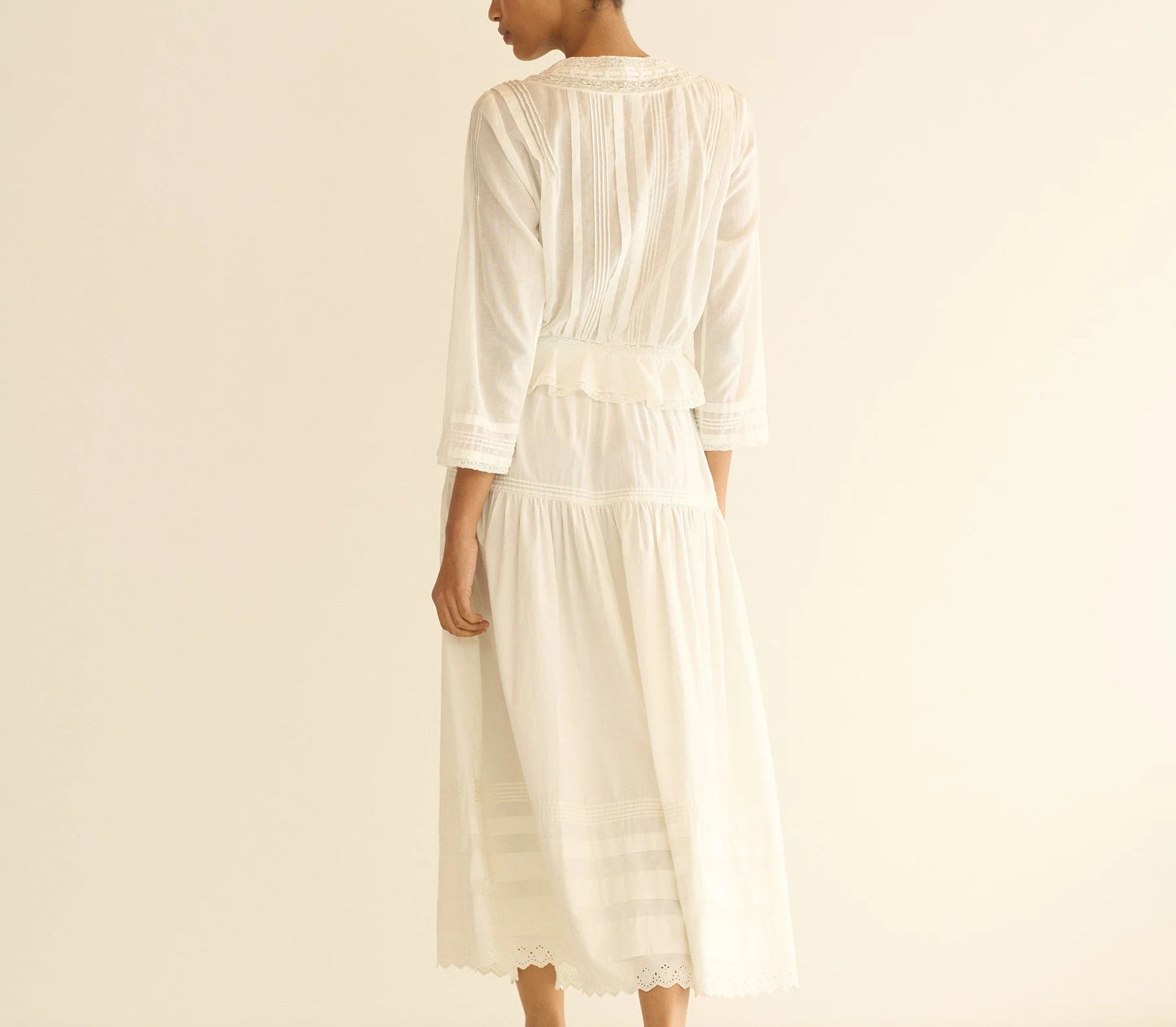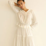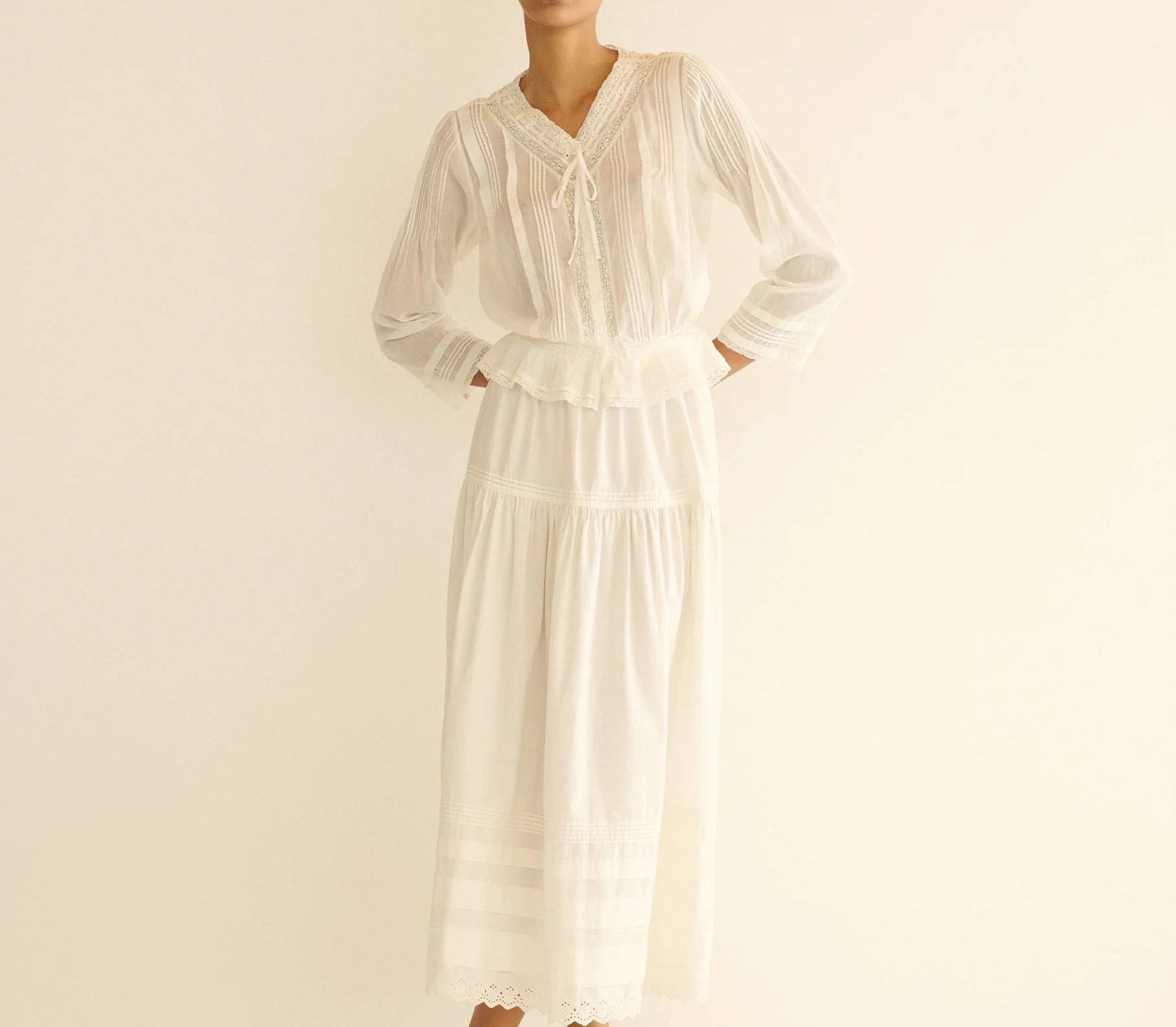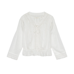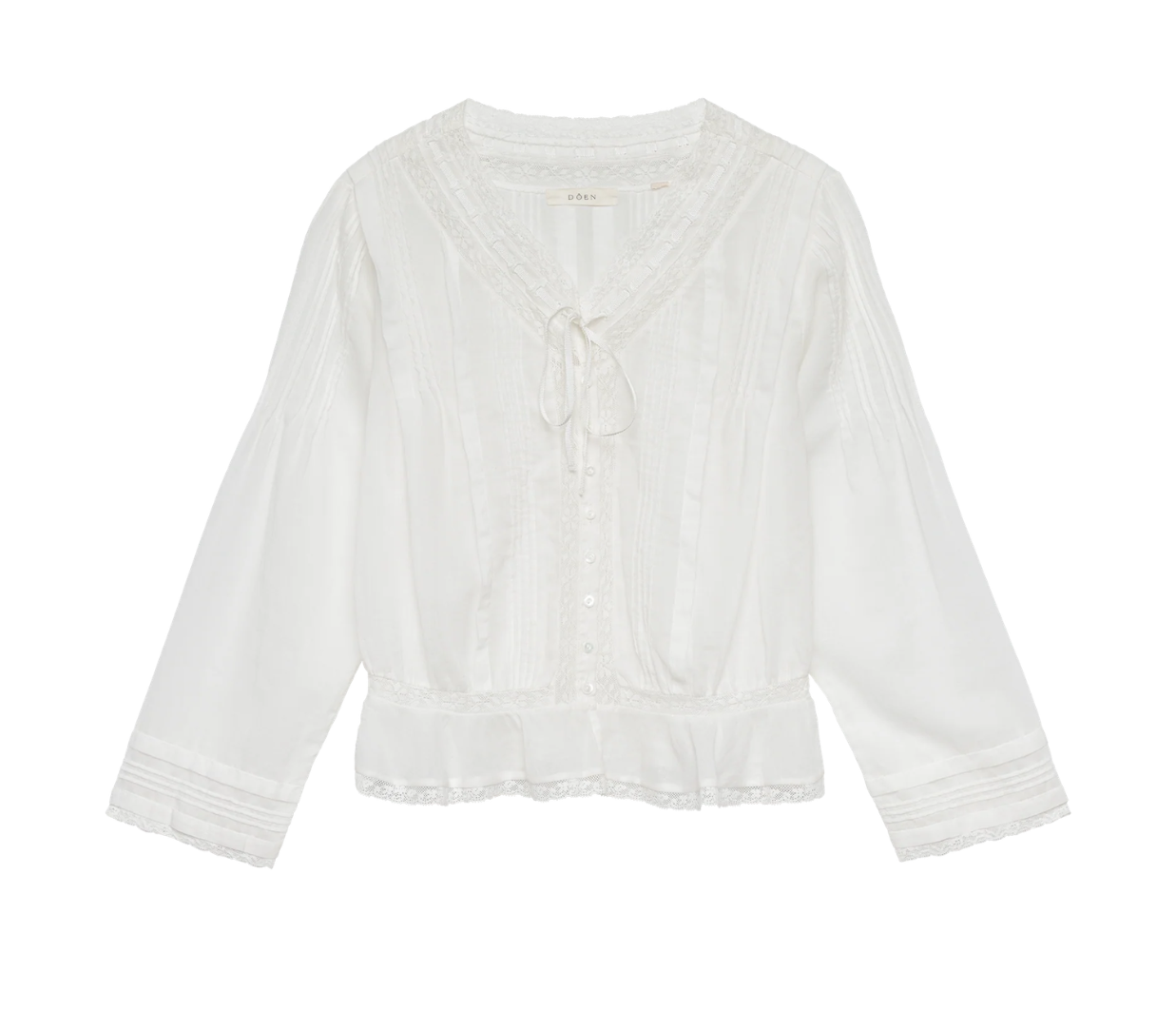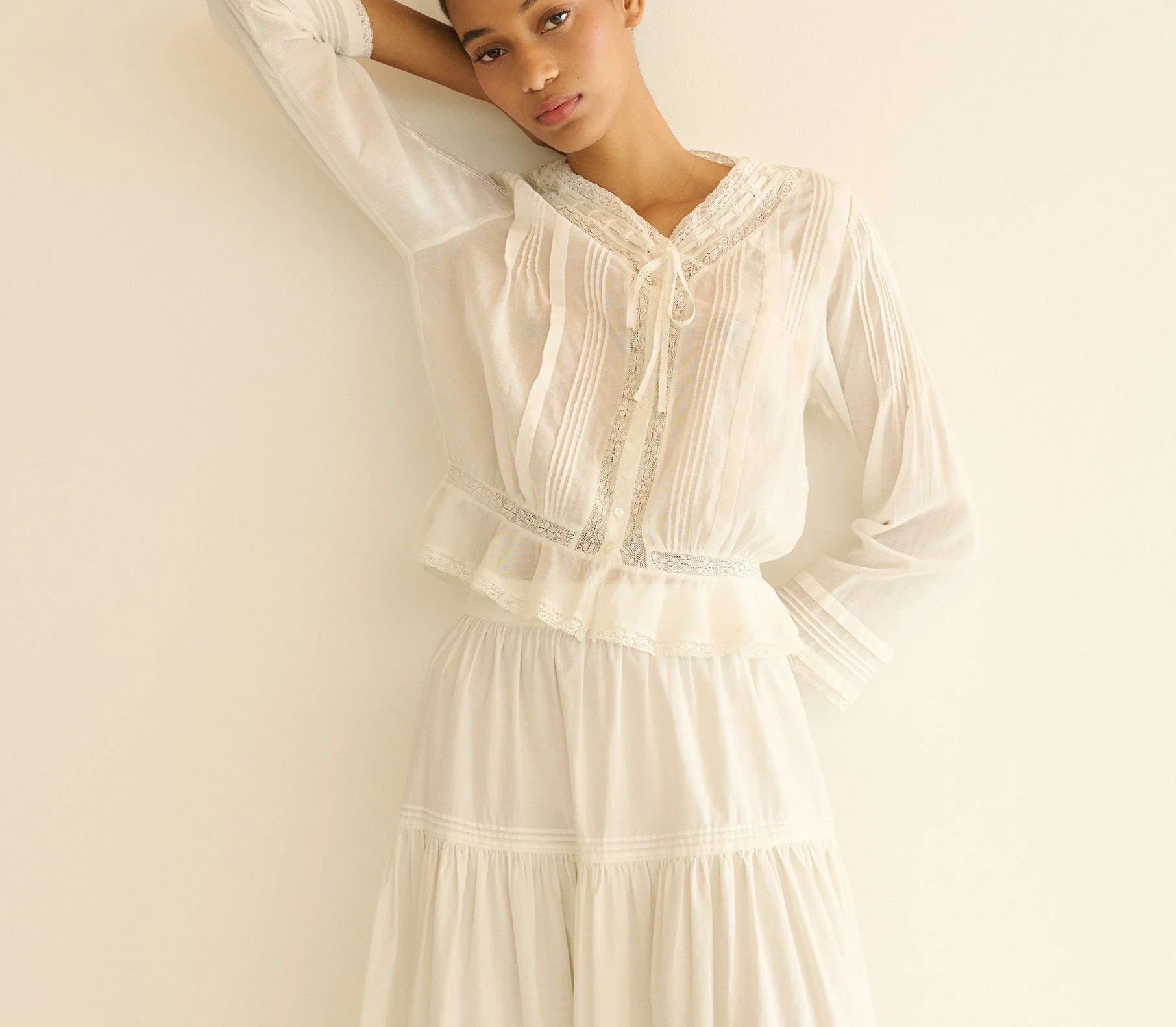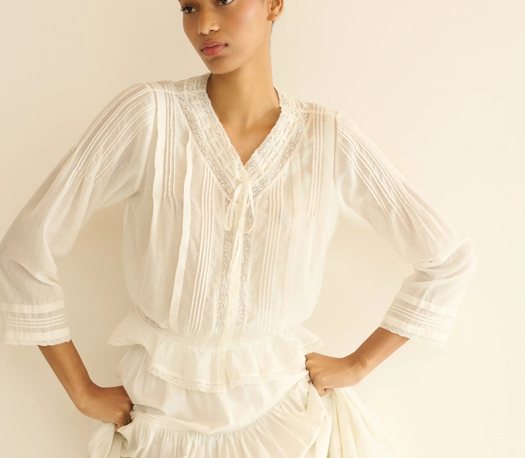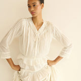 In soft organic cotton voile, the Hillock Top is a long-sleeved update to our beloved Traveler Top. Designed with a slightly cropped peplum silhouette, it’s finished with Edwardian-inspired details throughout, like clustered pintucks, delicate ladder trim, and scallop eyelets. A high V-neckline is threaded with a grosgrain ribbon tie, and a line of mother-of-pearl buttons runs down the front.