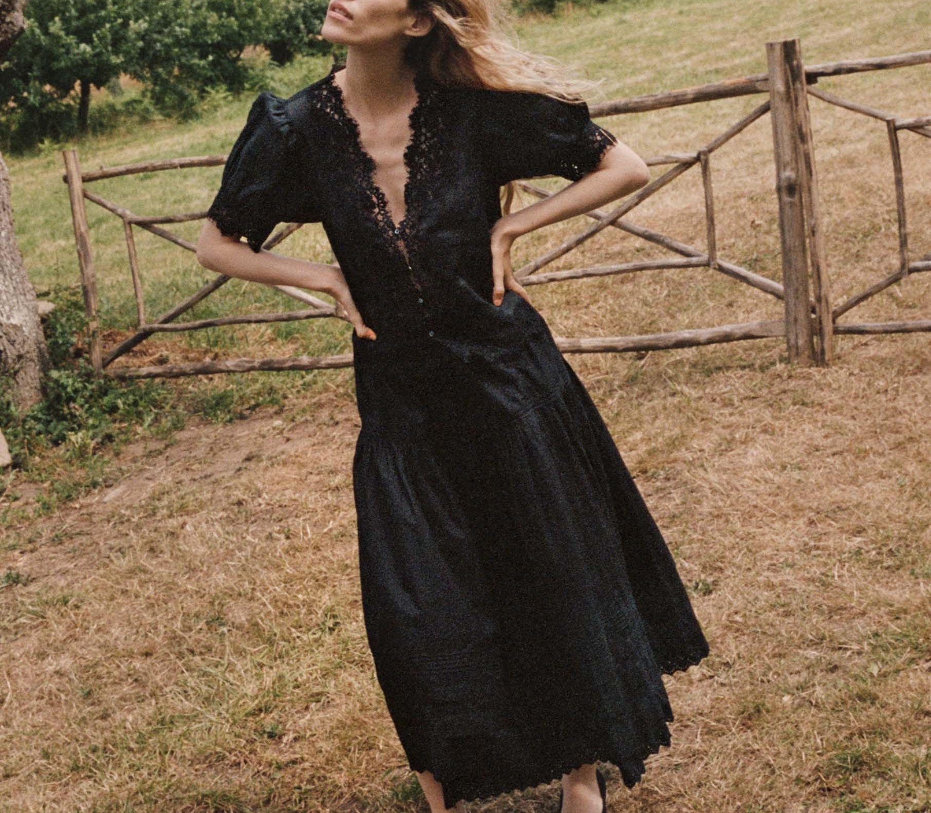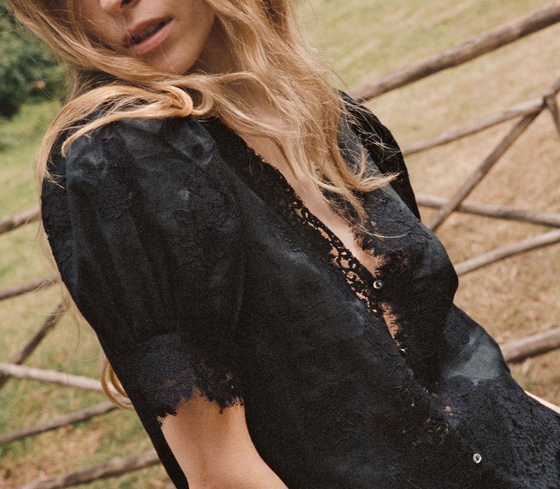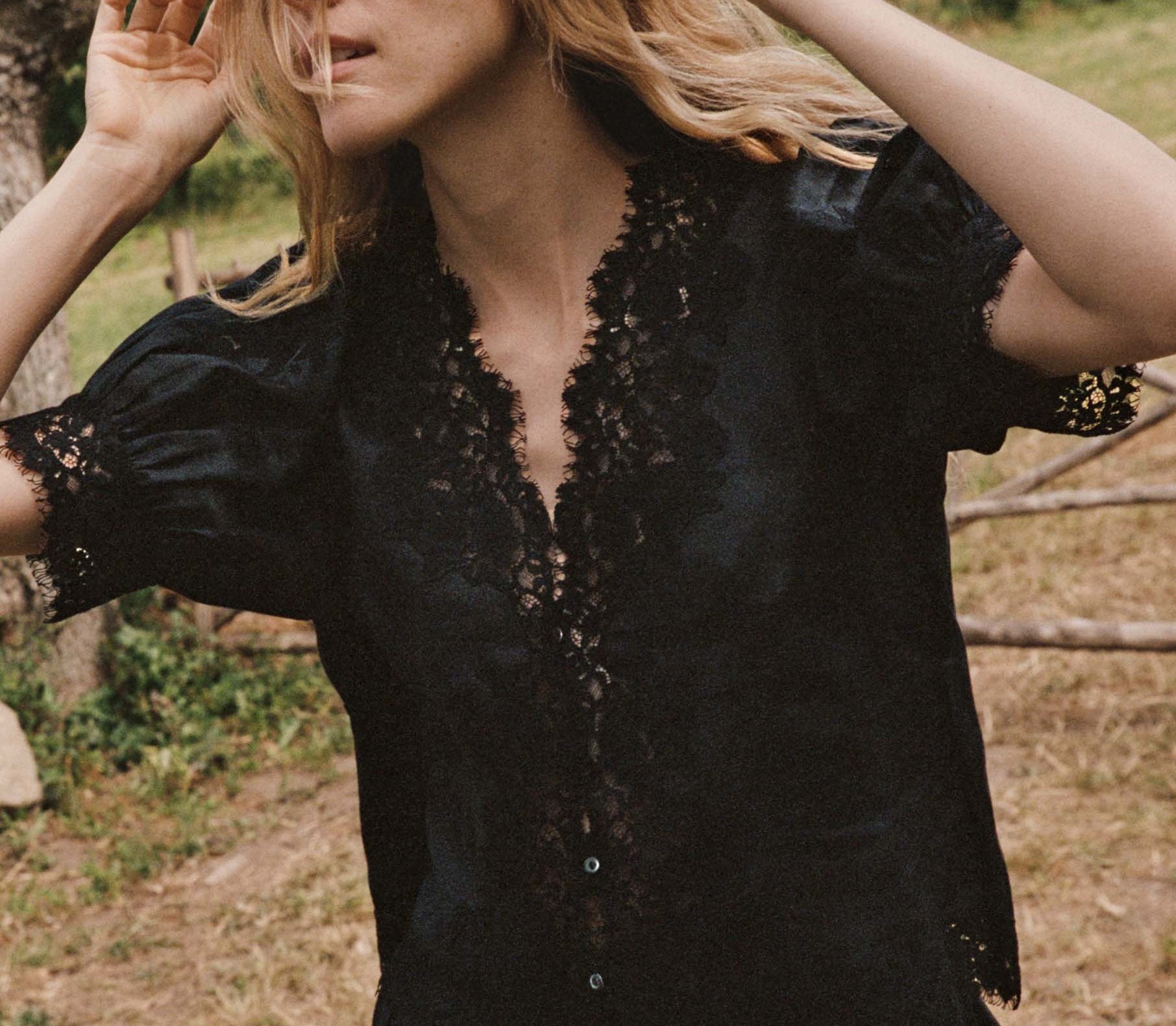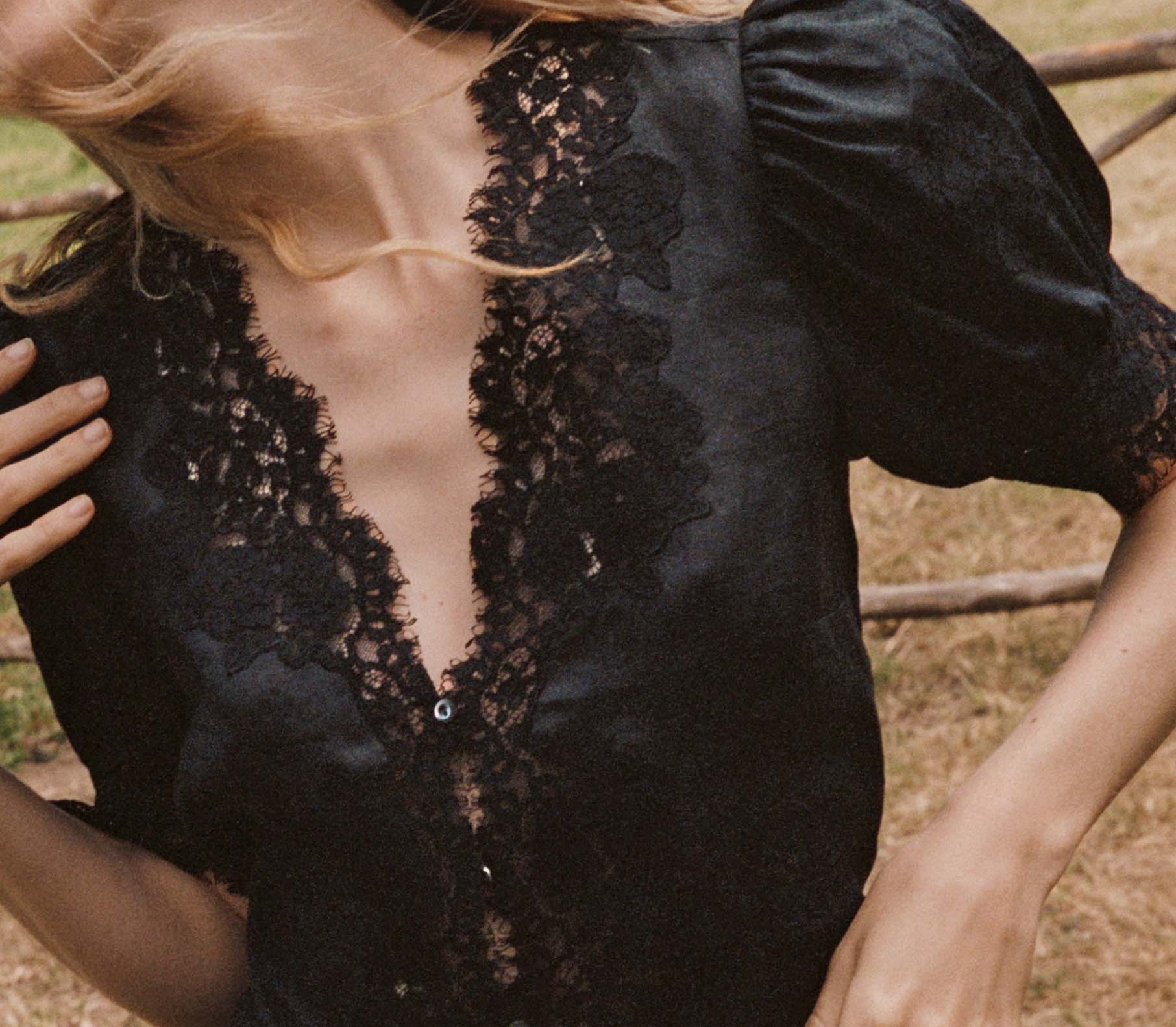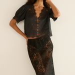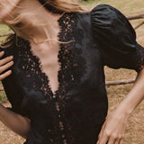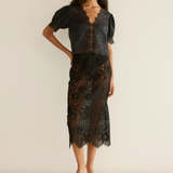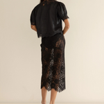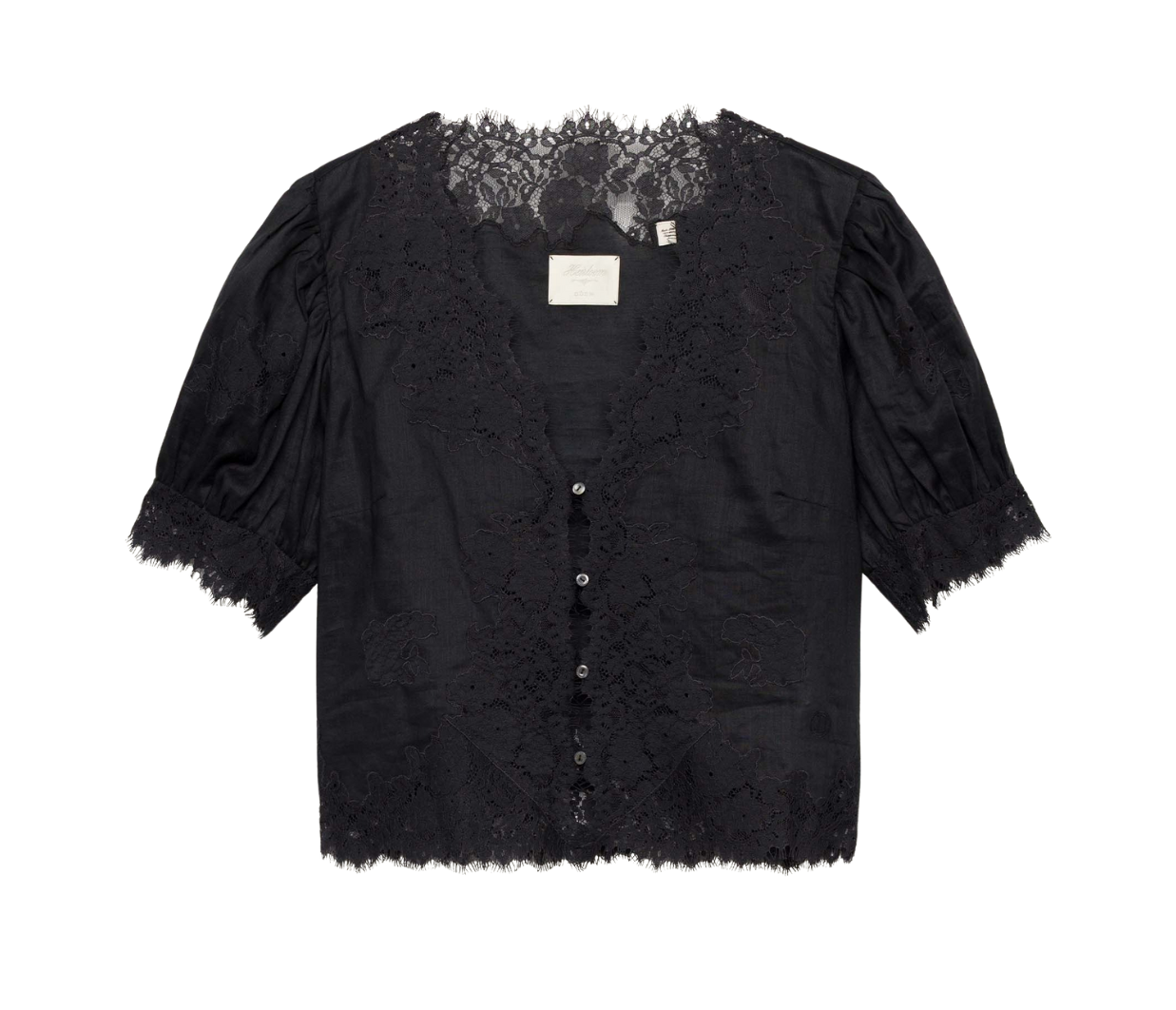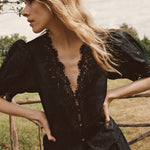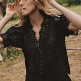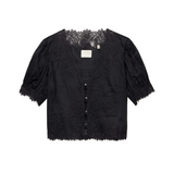 Introducing Doen's Idella Top in Black, a short sleeve lace top in black. Crafted from crisp, lightweight ramie, the antique-inspired DÔEN Heirloom Idella Top features a plunging V-neckline, short puffed sleeves, and a breezy cut. Intricate embroidered floral lace trims the neckline, sleeve cuffs, center front placket, and slightly cropped hemline, while lace insets adorn the sleeves and bodice. An embroidered “D” emblem finishes the front left hem, and a line of mother-of-pearl buttons extends down the front.