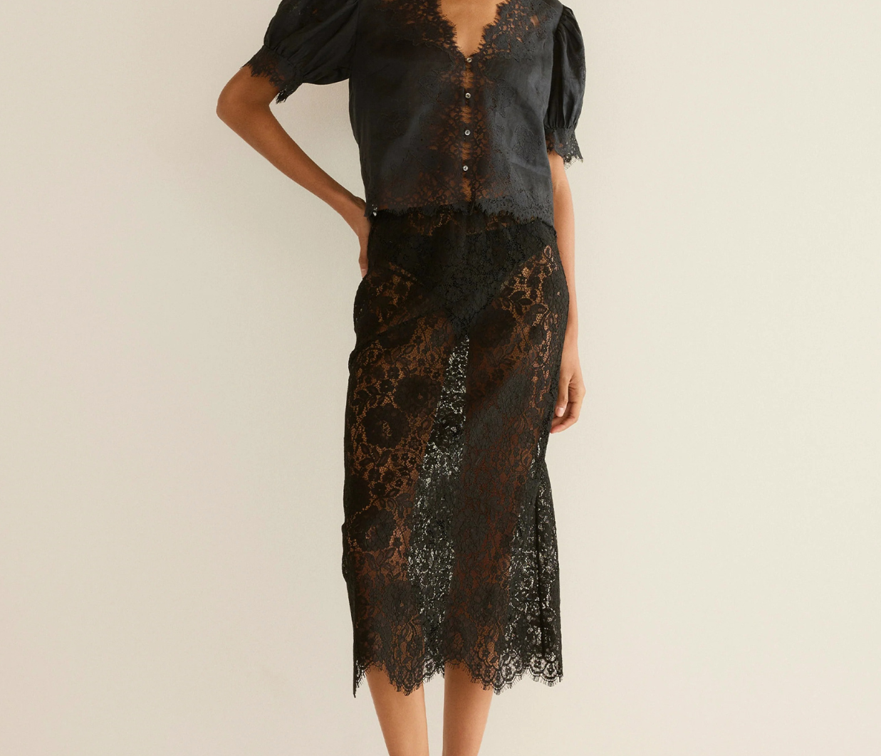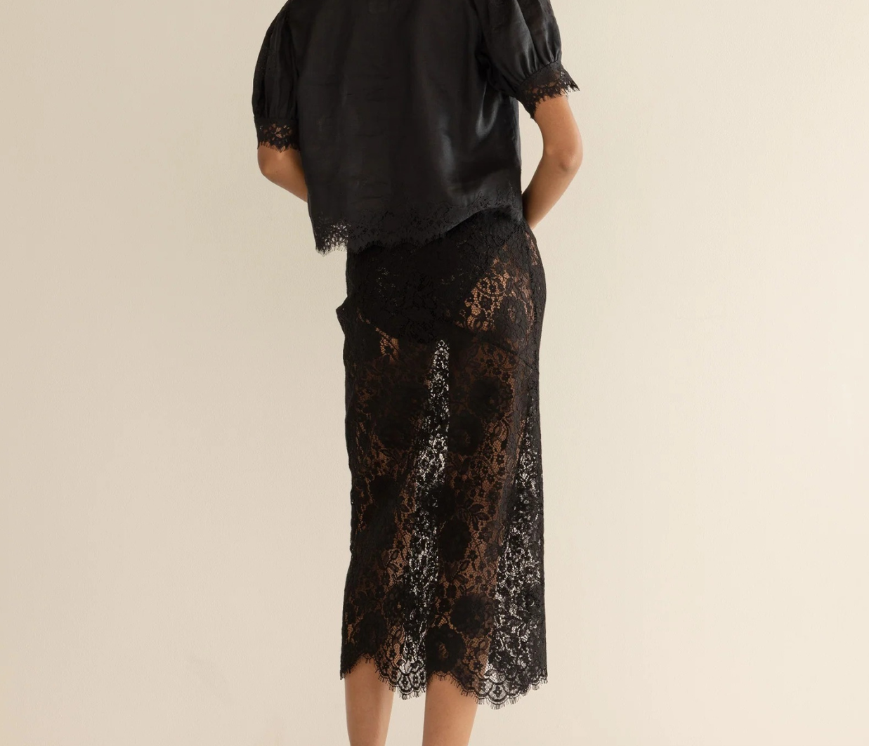 - Lace insets across sleeves and bodice