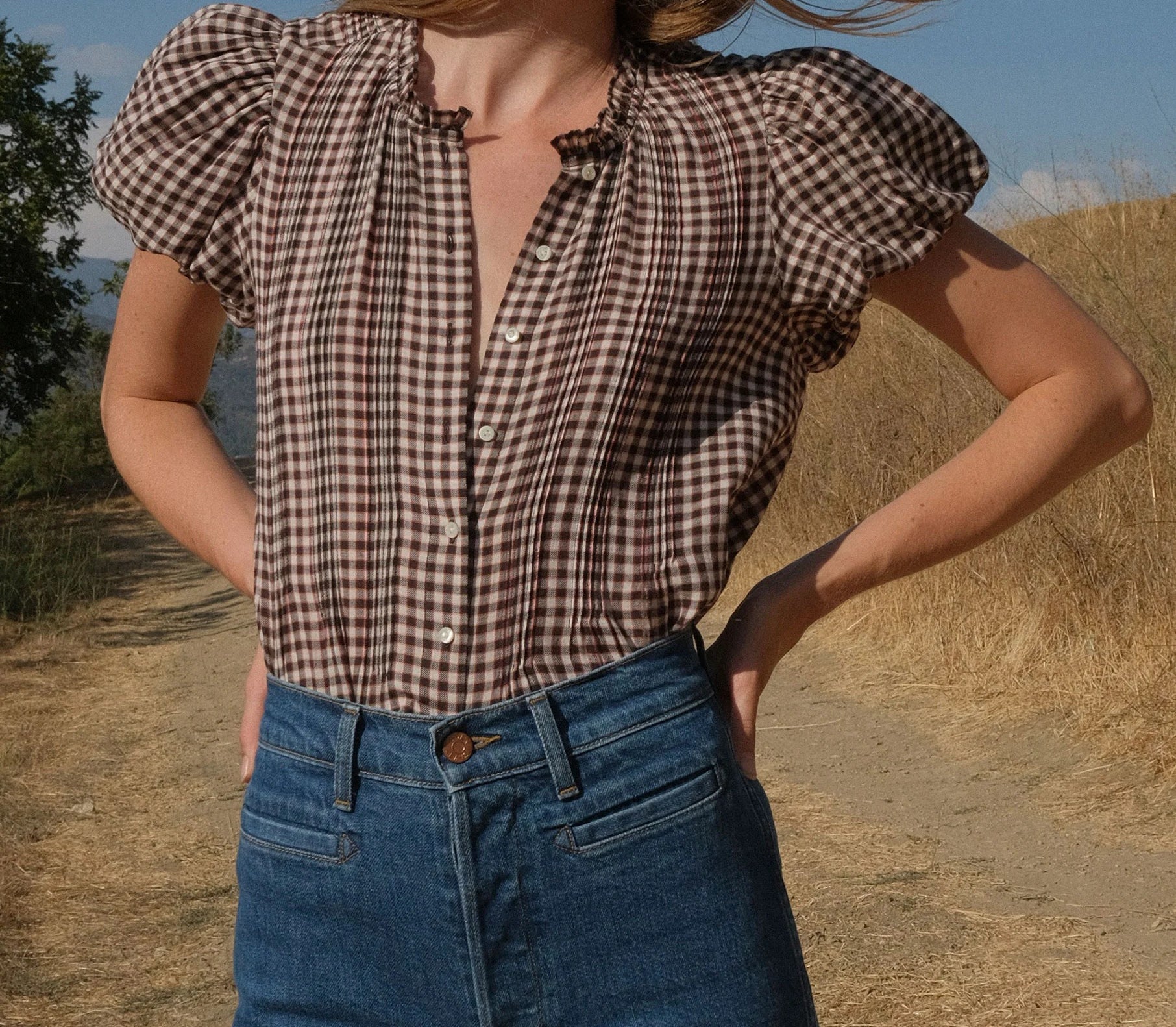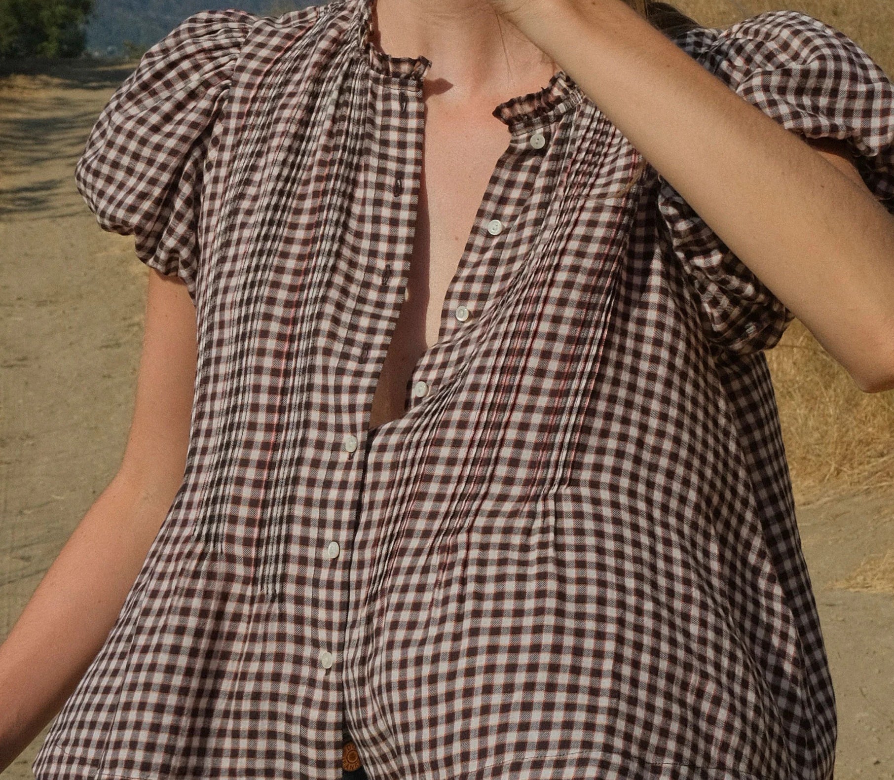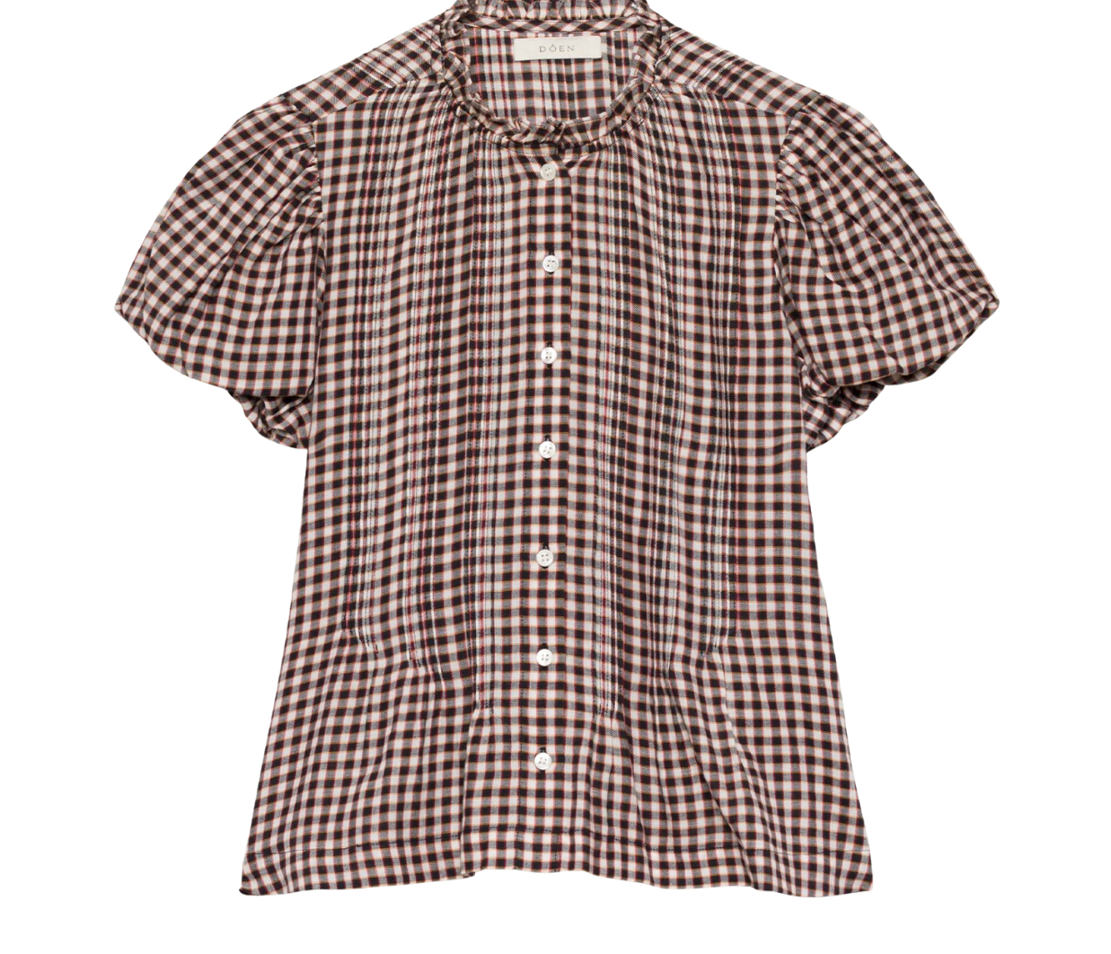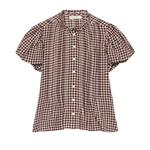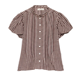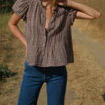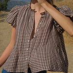 Introducing Doen's Millie Top in Delphine Plaid, a puffed short sleeve top in a brown plaid gingham pattern. The Millie Top features a high neck trimmed with petite ruffles, short puffed sleeves, and a breezy, slightly cropped cut. The pintucks lend texture to the front and back bodice, while starburst buttons extend down the front.
