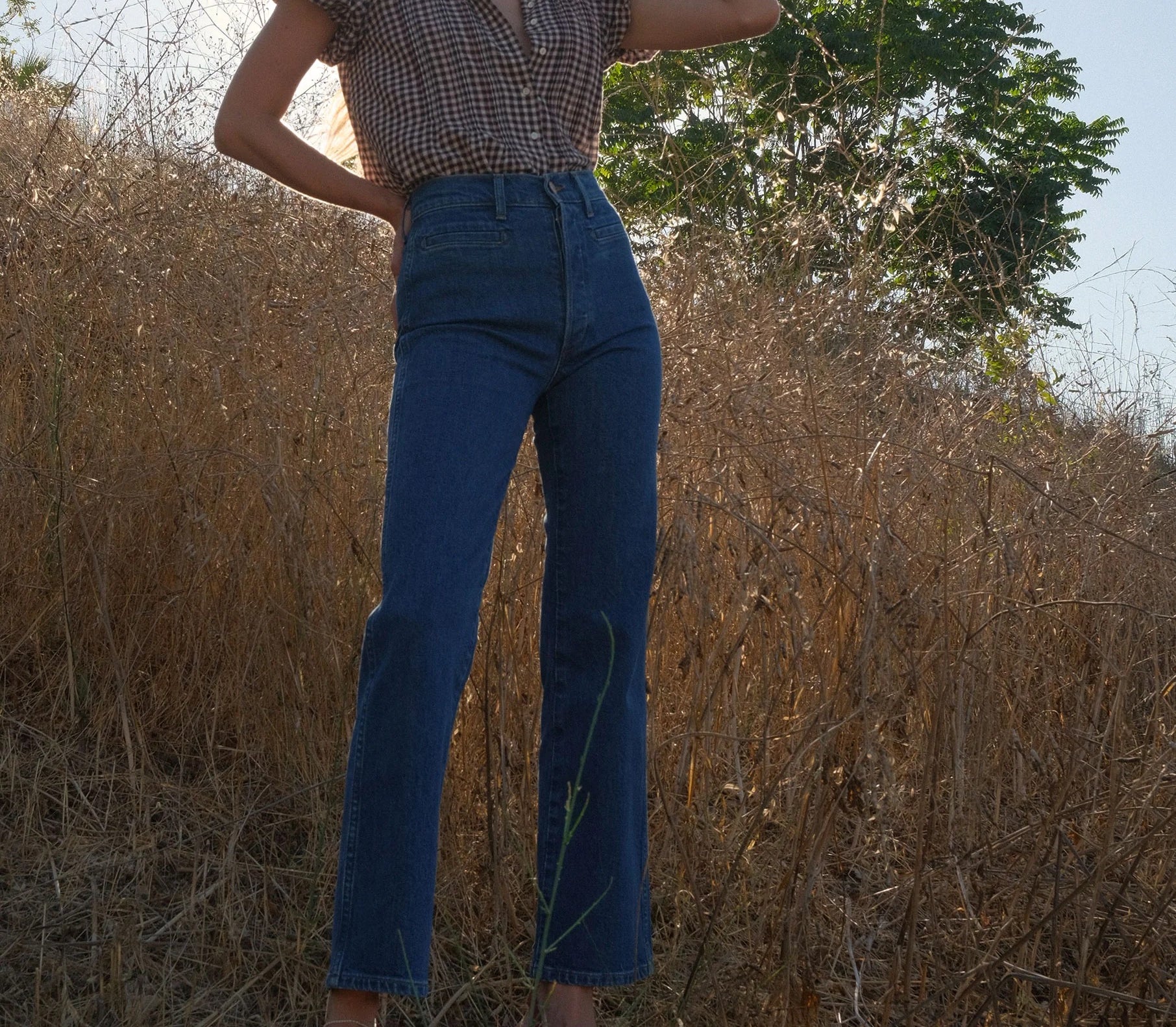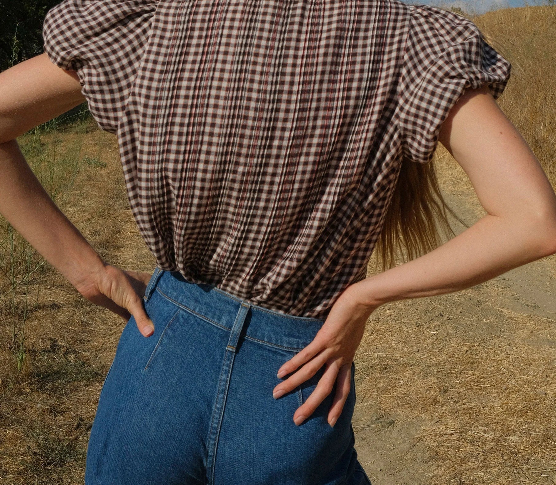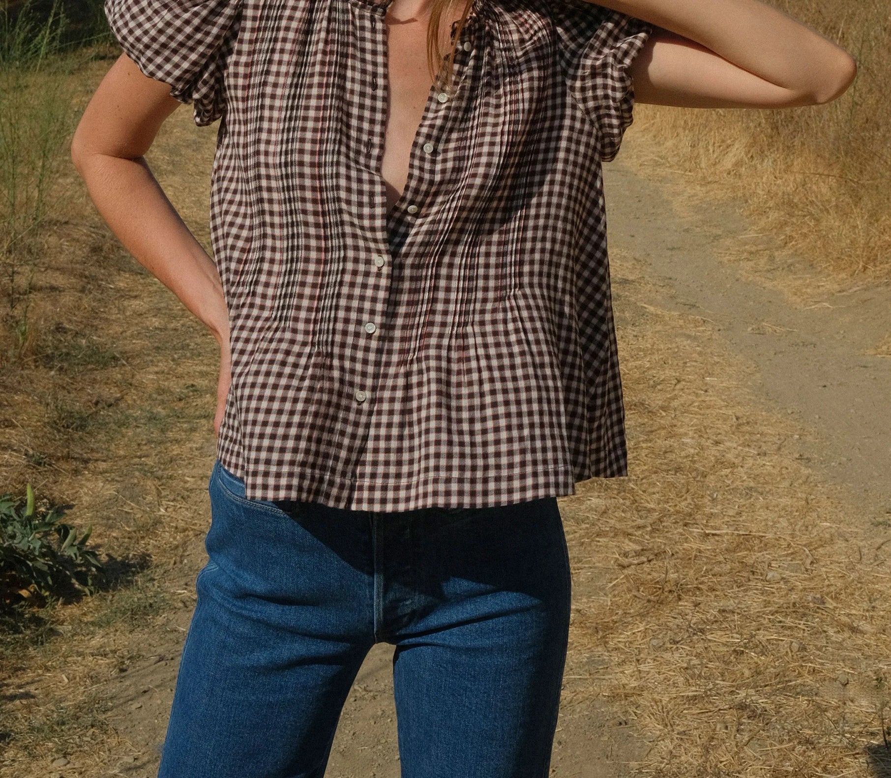 Introducing Doen's Millie Top in Delphine Plaid, a puffed short sleeve top in a brown plaid gingham pattern. The Millie Top features a high neck trimmed with petite ruffles, short puffed sleeves, and a breezy, slightly cropped cut. The pintucks lend texture to the front and back bodice, while starburst buttons extend down the front.