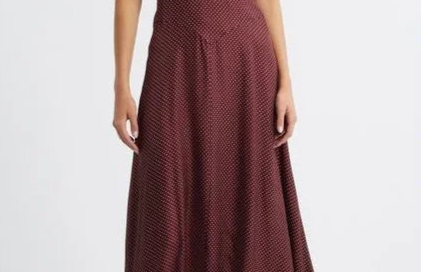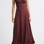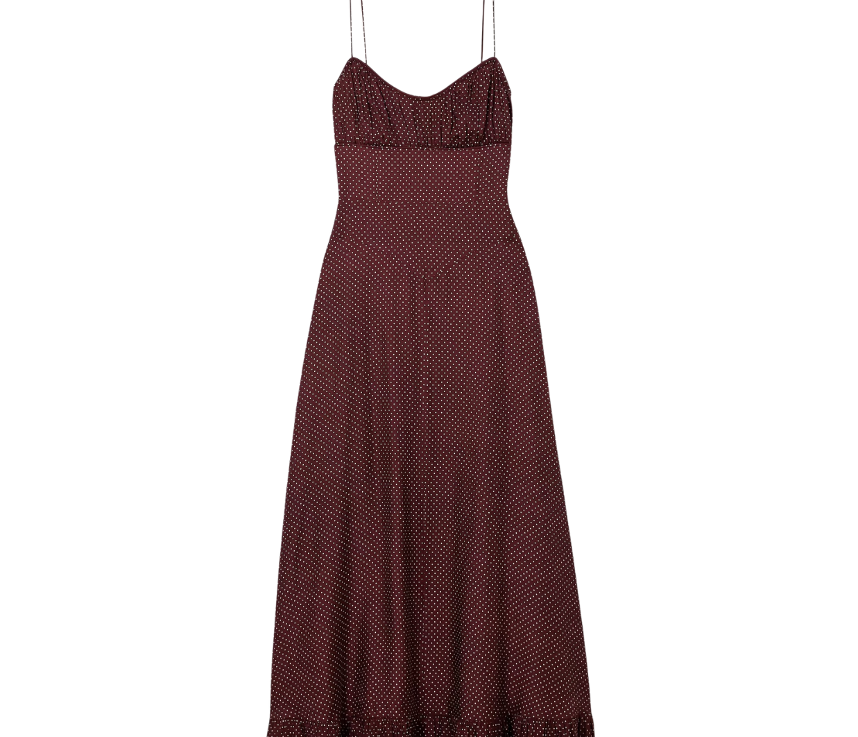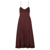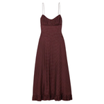 Introducing Doen's Rosaria Dress in Burgundy Colette Dot, a midi polka dot dress in deep red-burgundy hue. The Rosaria polka dot dress features a flattering V-neckline with a gathered bust, delicate pin-thin spaghetti straps, and a defined waist that draws the eye inward. Finished with a softly ruffled hem, the Rosaria Dress moves with ease and elegance, making it perfect for both day-to-evening wear.