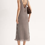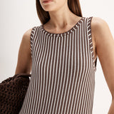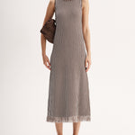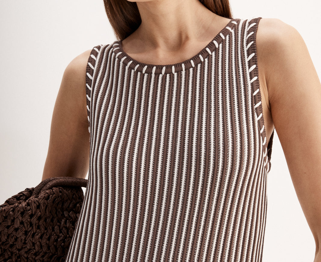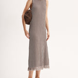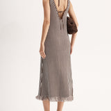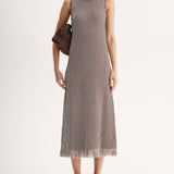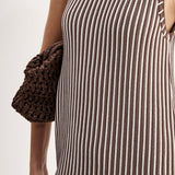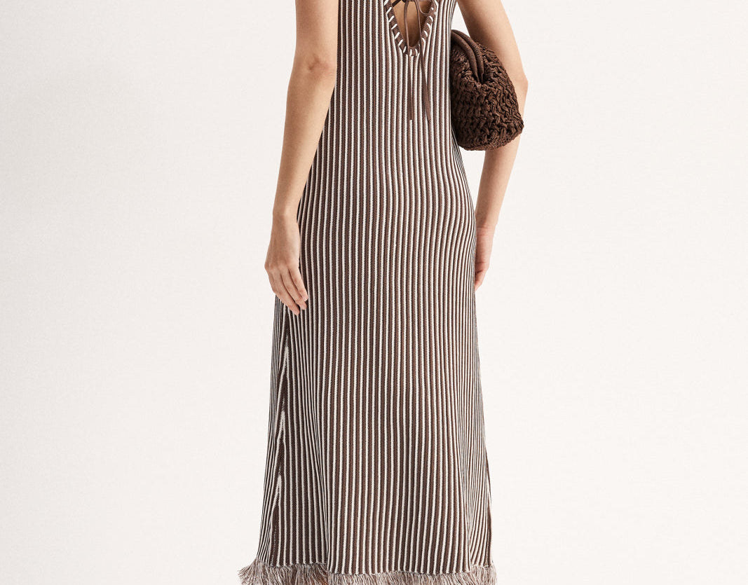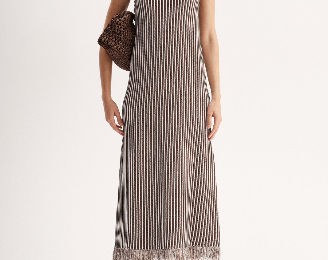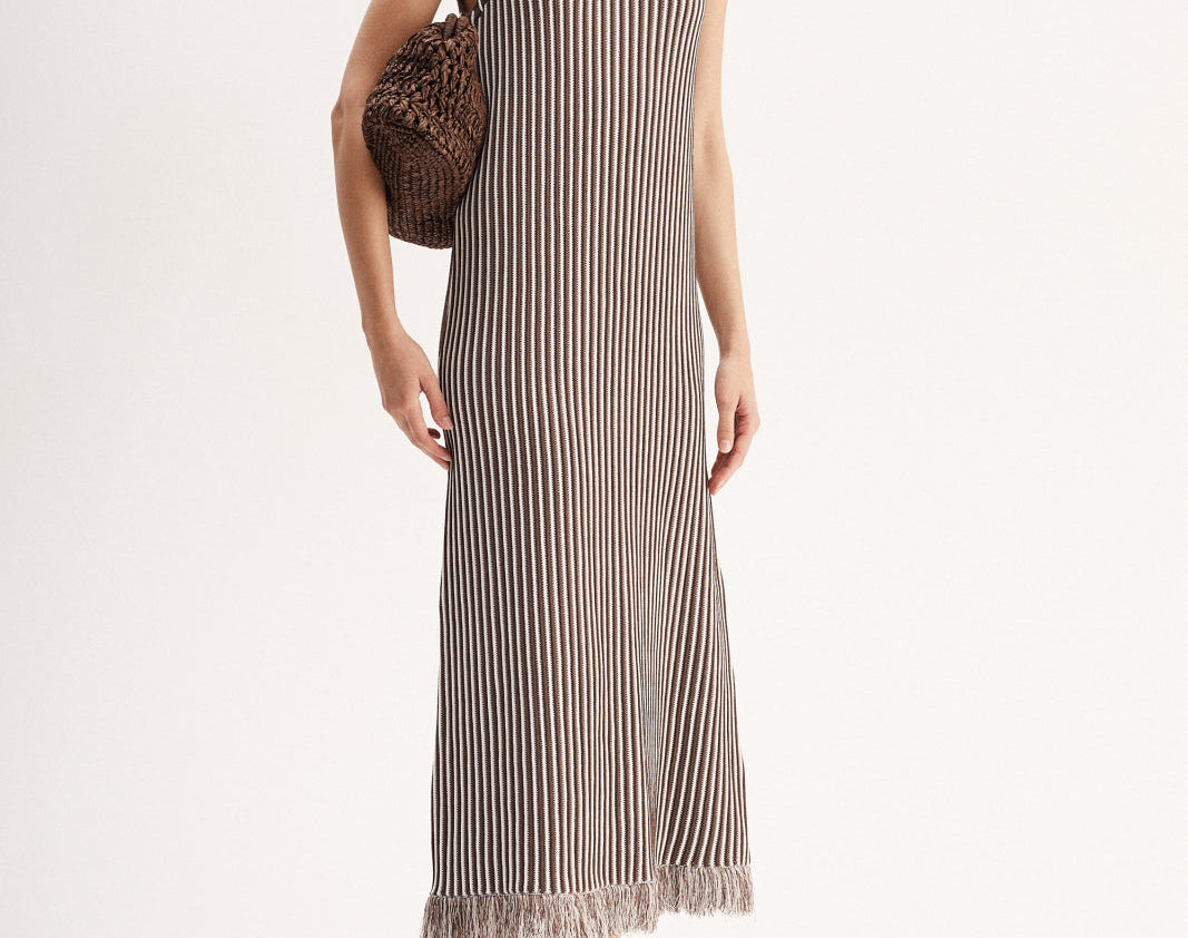 Introducing Elka Collective’s Alessandra Maxi Dress in Chocolate Stripe, a sleeveless knit maxi dress in chocolate stripe. Designed with a round neckline and a relaxed silhouette, this striped maxi dress falls effortlessly to an ankle-grazing length. Vertical chocolate and ivory stripes elongate the form, while the fringed hem adds texture and movement.