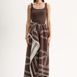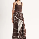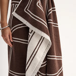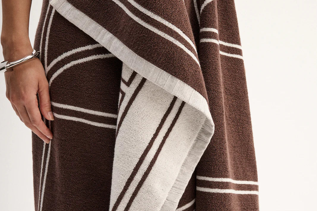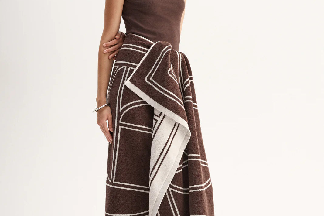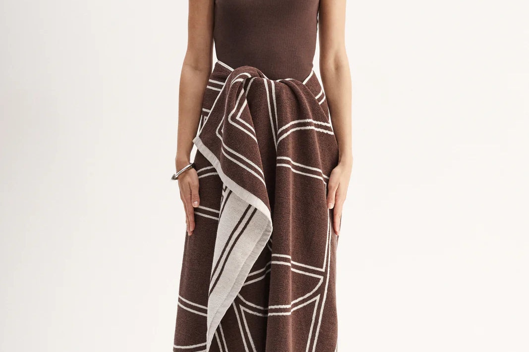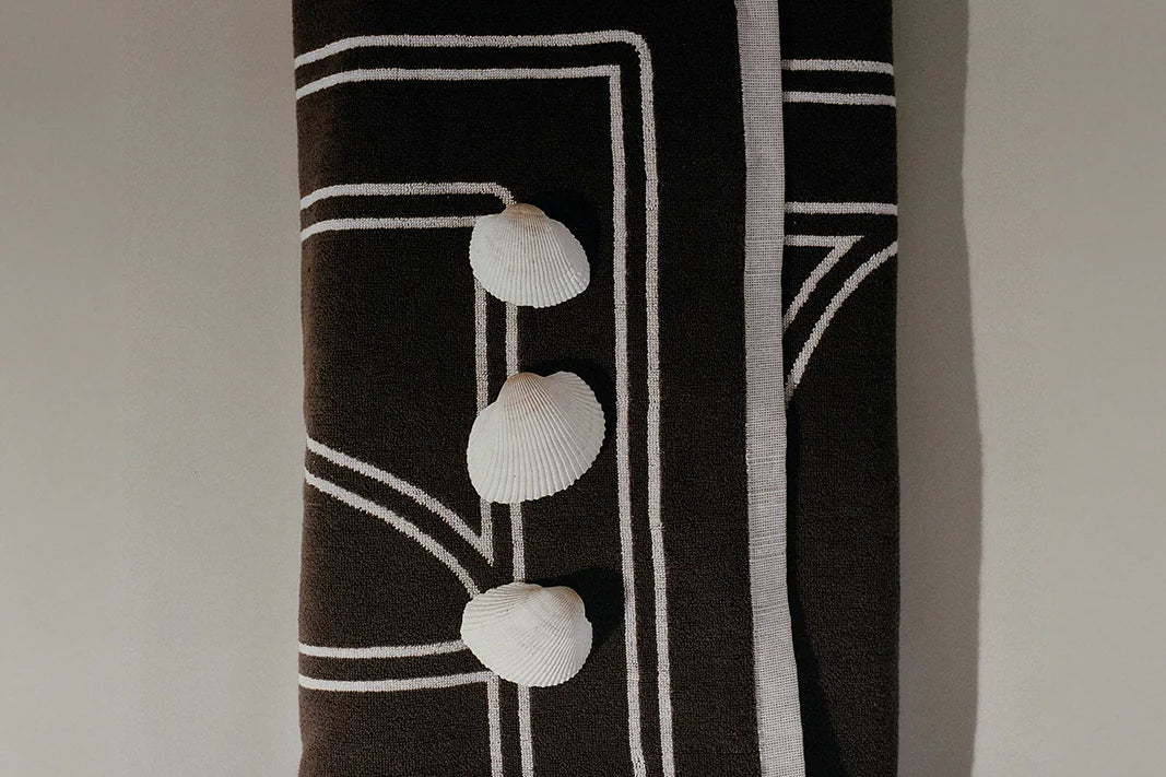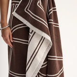 Introducing Elka Collective's Beau Towel in Chocolate Ecru, a cotton terry towel. The Beau towel is designed with an extra-large Elka Collective printed monogram in chocolate and ecru. The towel provides a plush, soft handfeel ideal for the beach or relaxing poolside.