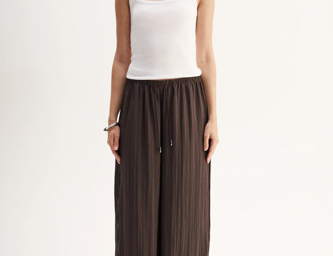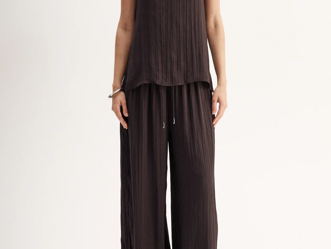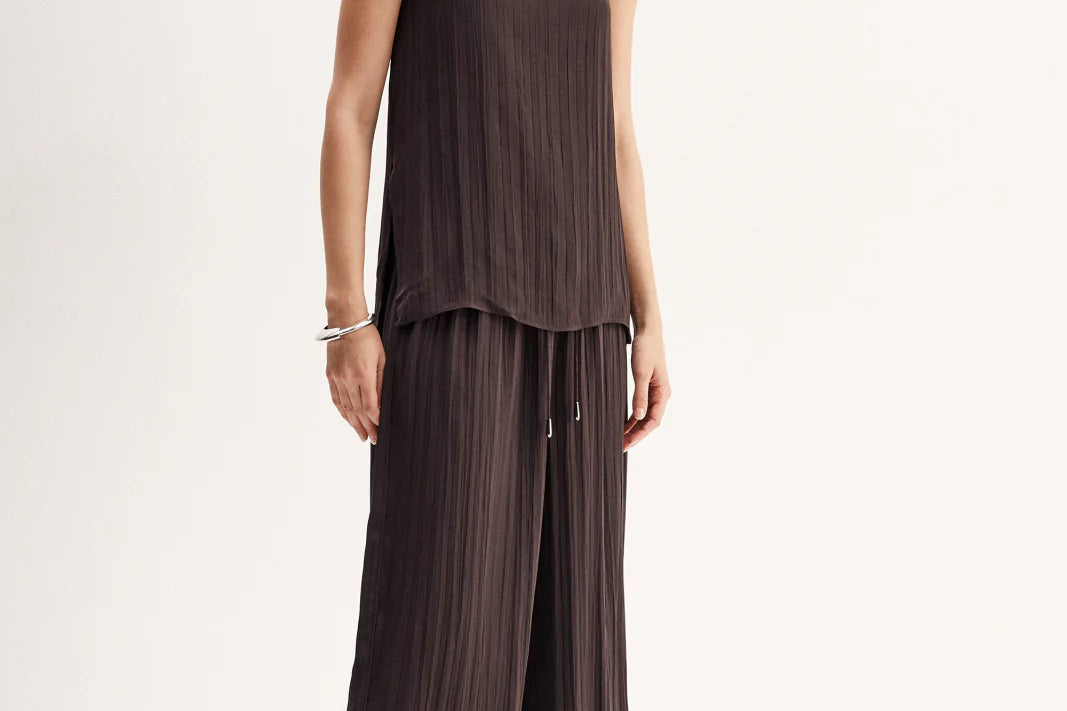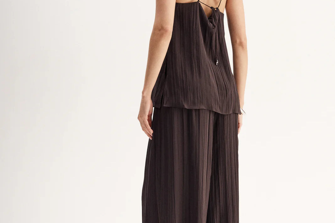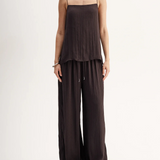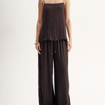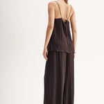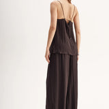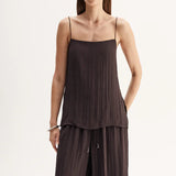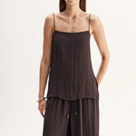 Introducing Elka Collective's Beckett Top in Chocolate, a relaxed cami top in a chocolate brown hue. The Beckett top is designed with a silky plissé textured fabrication featuring side splits, spaghetti straps, and a square neckline. The cami top is a longline top that drapes off the hips. Perfect for an everyday breezy look.