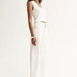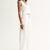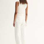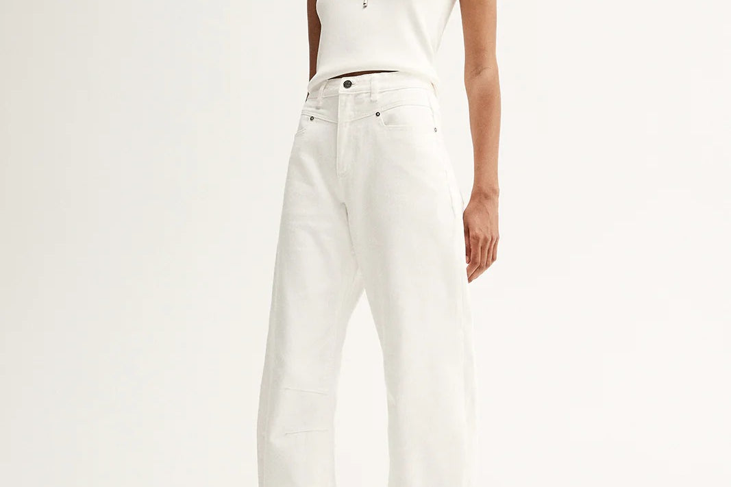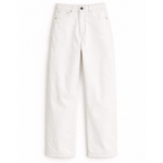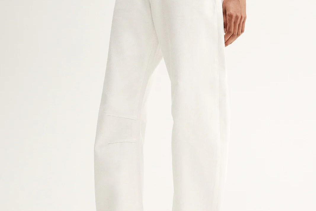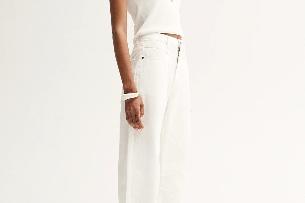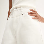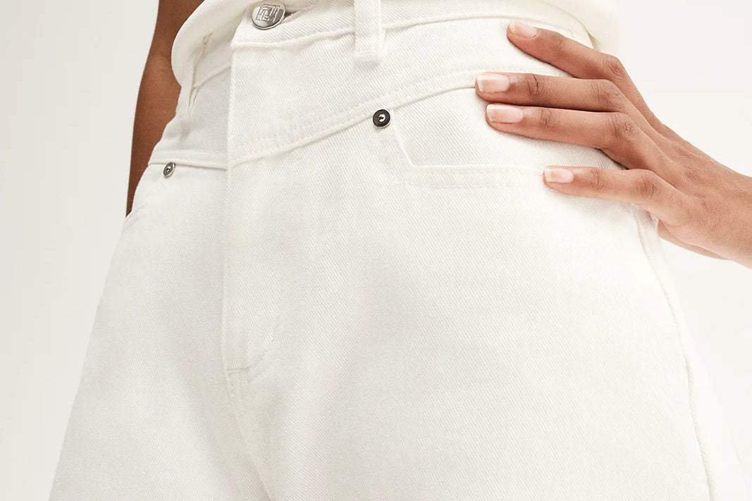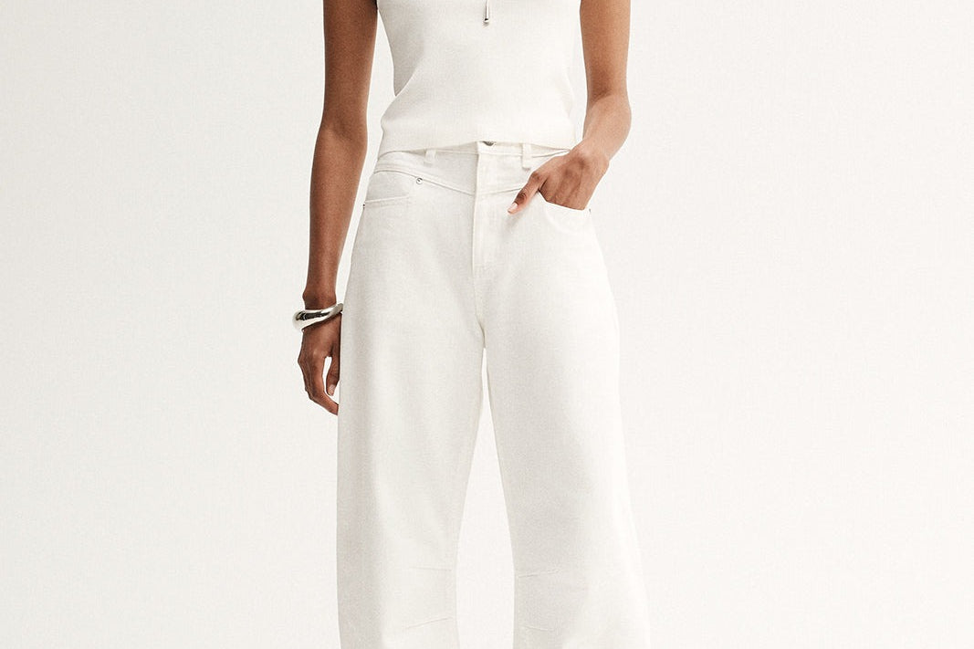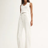 Introducing Elka Collective's Chelsea Denim Jean in Ivory, a mid-rise barrel-leg jean in a white-ivory hue. Designed with a five-pocket construction and belt loops, these cream pants combine casual ease with a structured finish. The Chelsea Denim is a versatile wardrobe essential for both everyday wear and elevated styling.