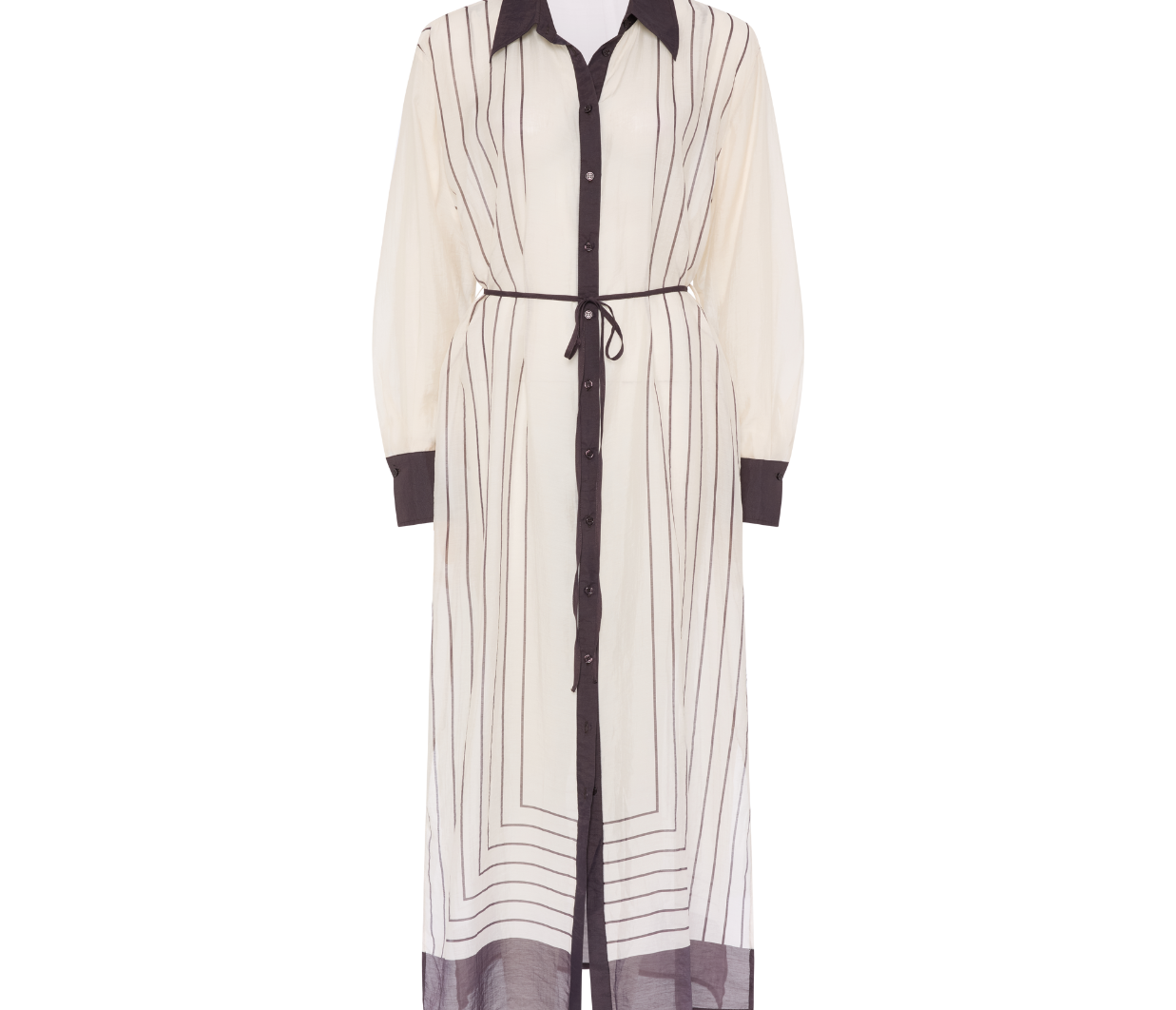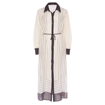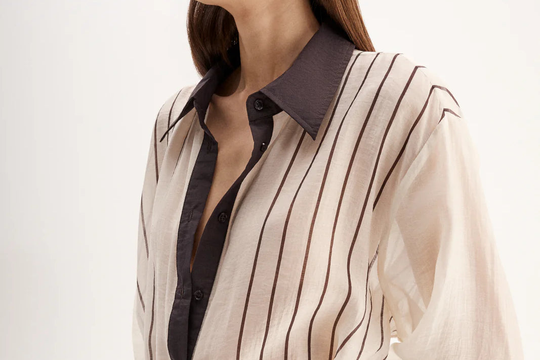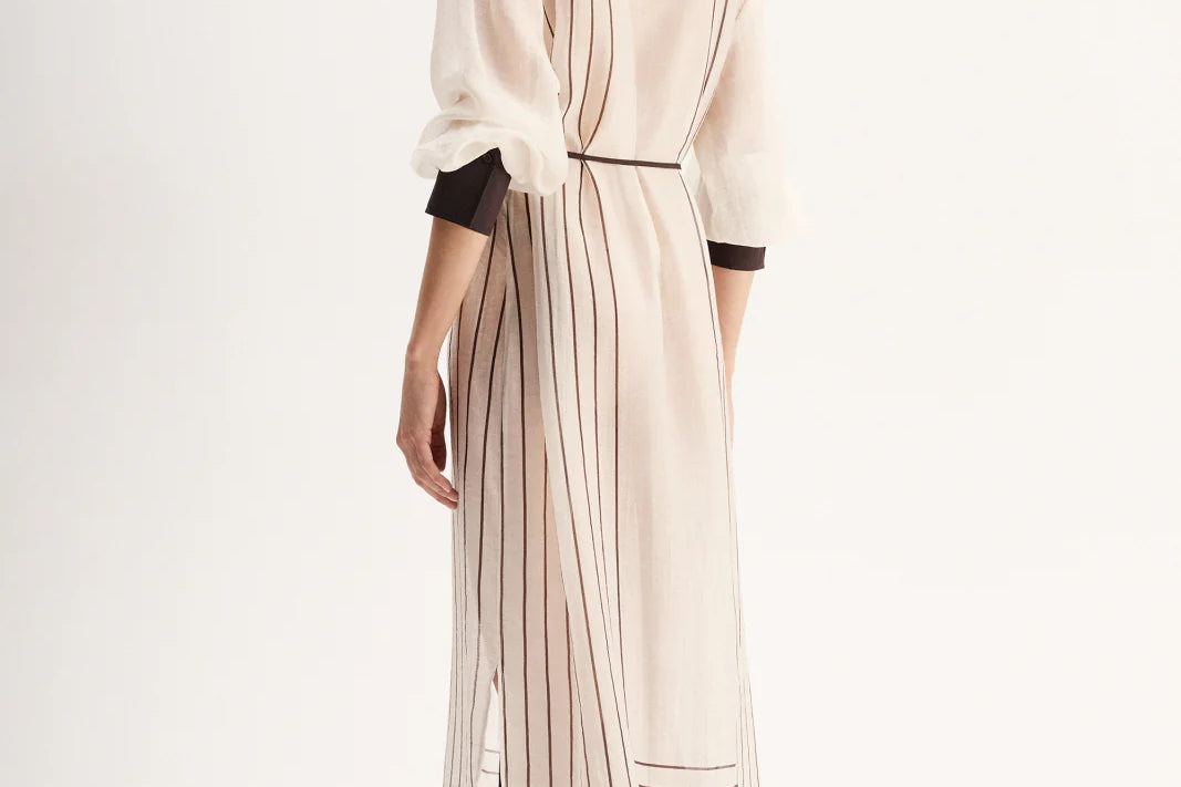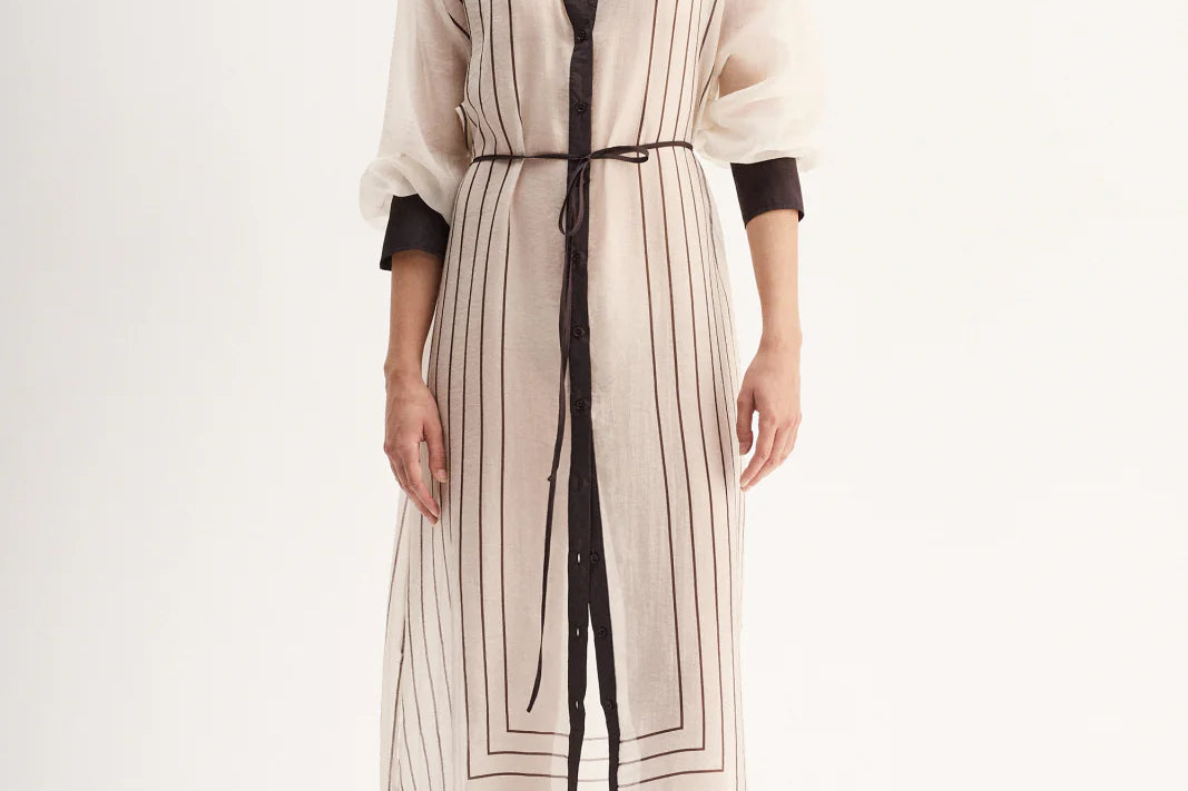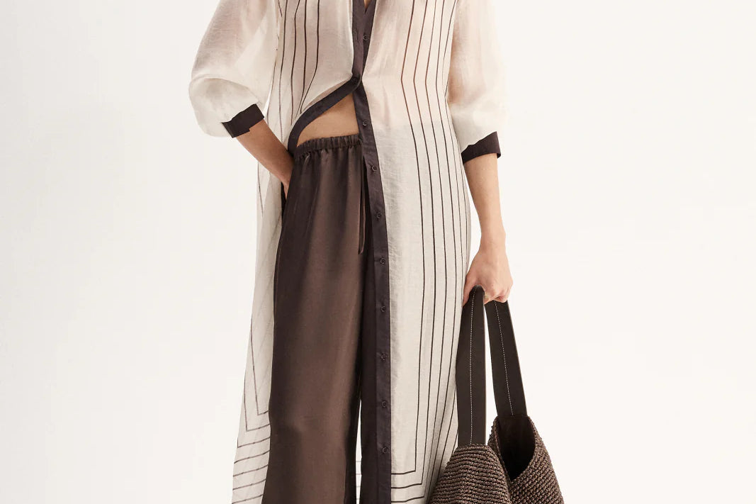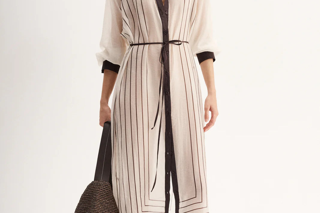 Introducing Elka Collective's Havanna Maxi Dress in Chocolate Stripe, a semi-sheer maxi dress in chocolate stripe. Designed with a lightweight semi-sheer fabric with a classic shirt silhouette with buttons through the front and a collared neck. Perfect for a summer outing.