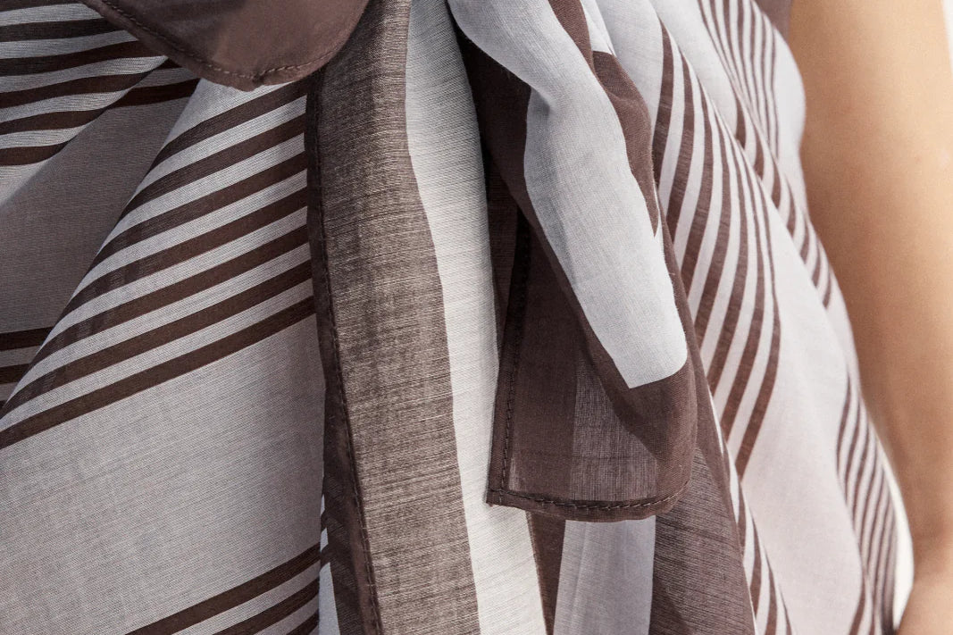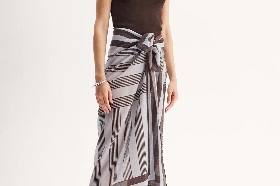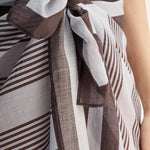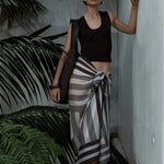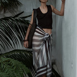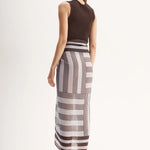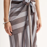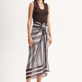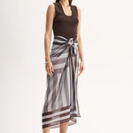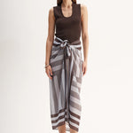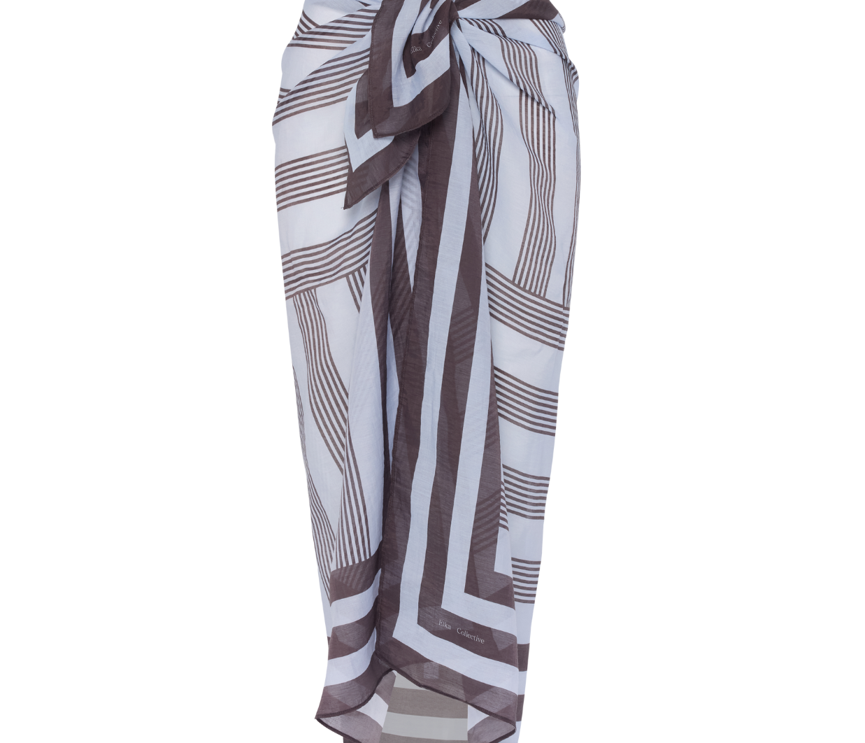 Introducing Elka Collective's Pierra Sarong in Blue, a sarong silhouette in blue stripe pattern. The Pierra Sarong is made of a soft, semi-sheer fabric with a bold contrasting stripe print, a sleek and contemporary summer accessory. Ideal for beach and poolside layering, this piece is a vacation staple.
