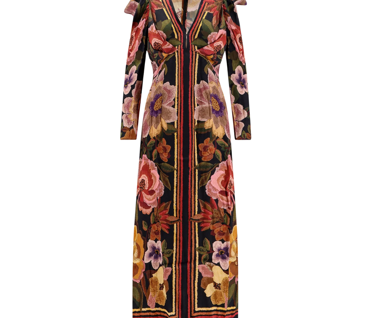 Introducing Farm Rio's Chenille Flowers Black Midi Dress, a long-sleeve maxi-length dress in floral motif print. The Chenille dress features a V-neckline and full-length sleeves with a ruffle detail on the shoulder. Perfect for a day to evening outing.