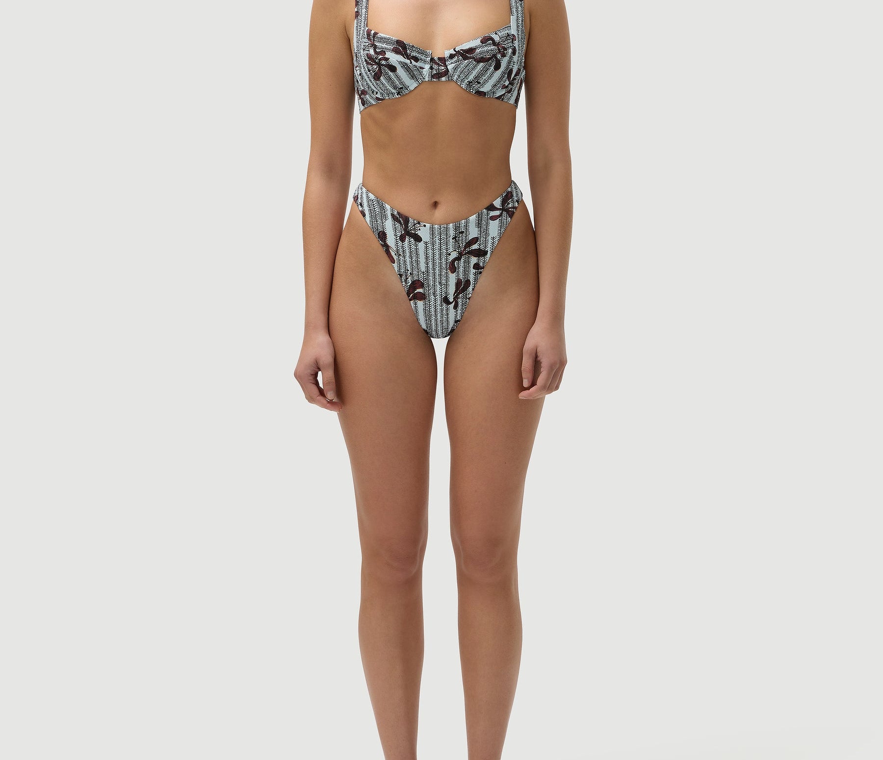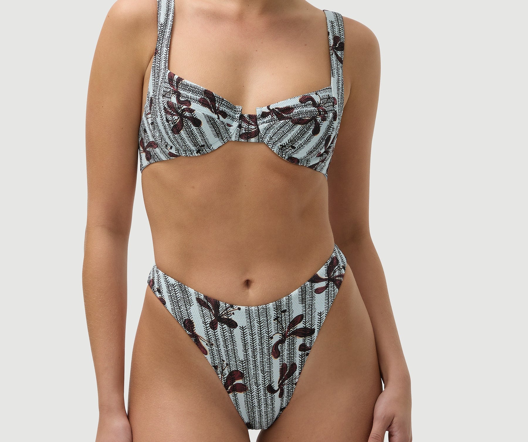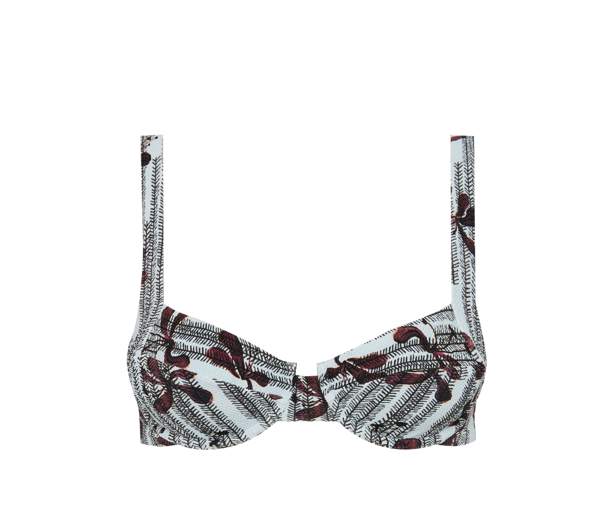 Introducing Fella's Casanova Bikini Top in Kimono Floral, an underwire balconette bikini top with a brown floral print on a light blue canvas. The Casanova bikini top is an underwired bra-style top designed for ultimate support and comfort. It features medium coverage, ensuring a flattering fit, and is finished with a thick strap.