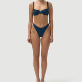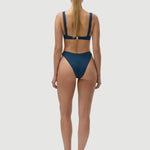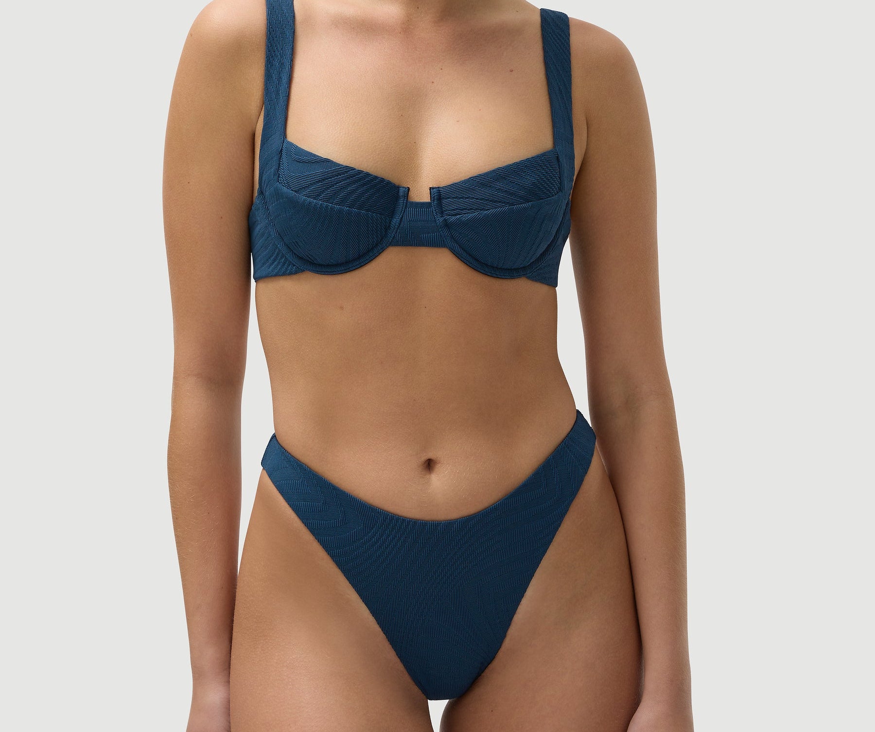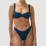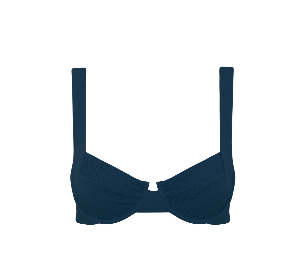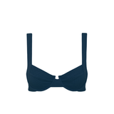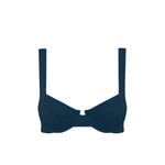 Introducing Fella's Casanova Bikini Top in Poseidon, an underwire balconette bikini top in a deep, rich blue with subtle green undertones. The Casanova bikini top is an underwired bra-style top designed for ultimate support and comfort. It features medium coverage, ensuring a flattering fit, and is finished with a thick strap.
