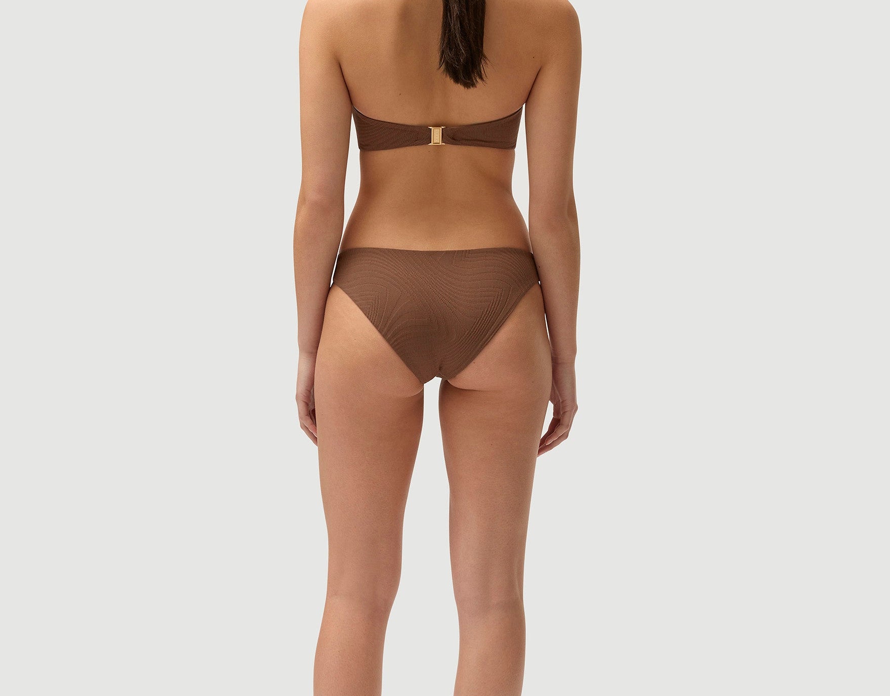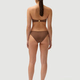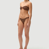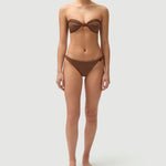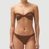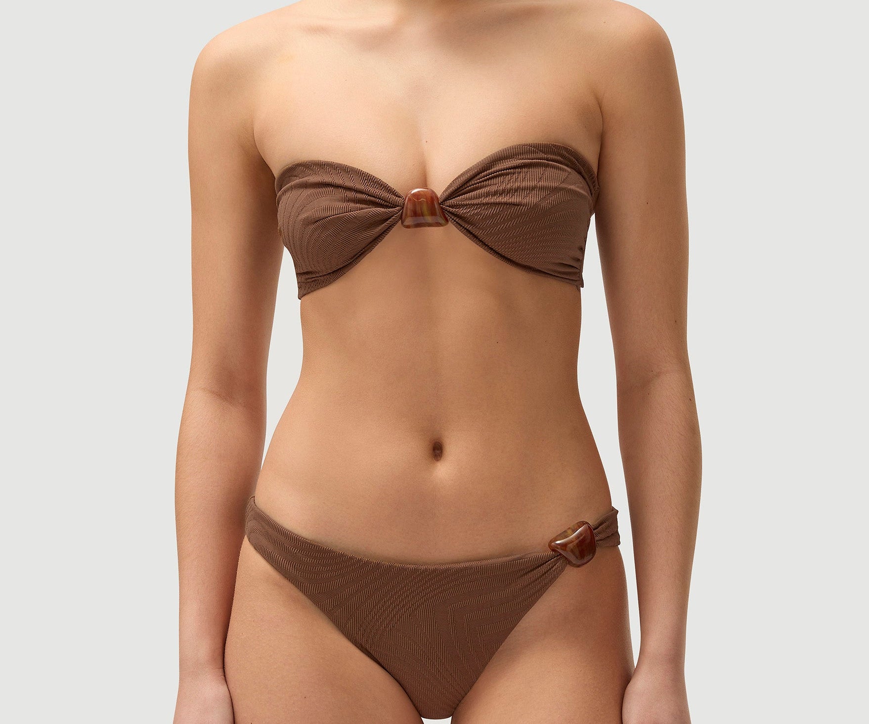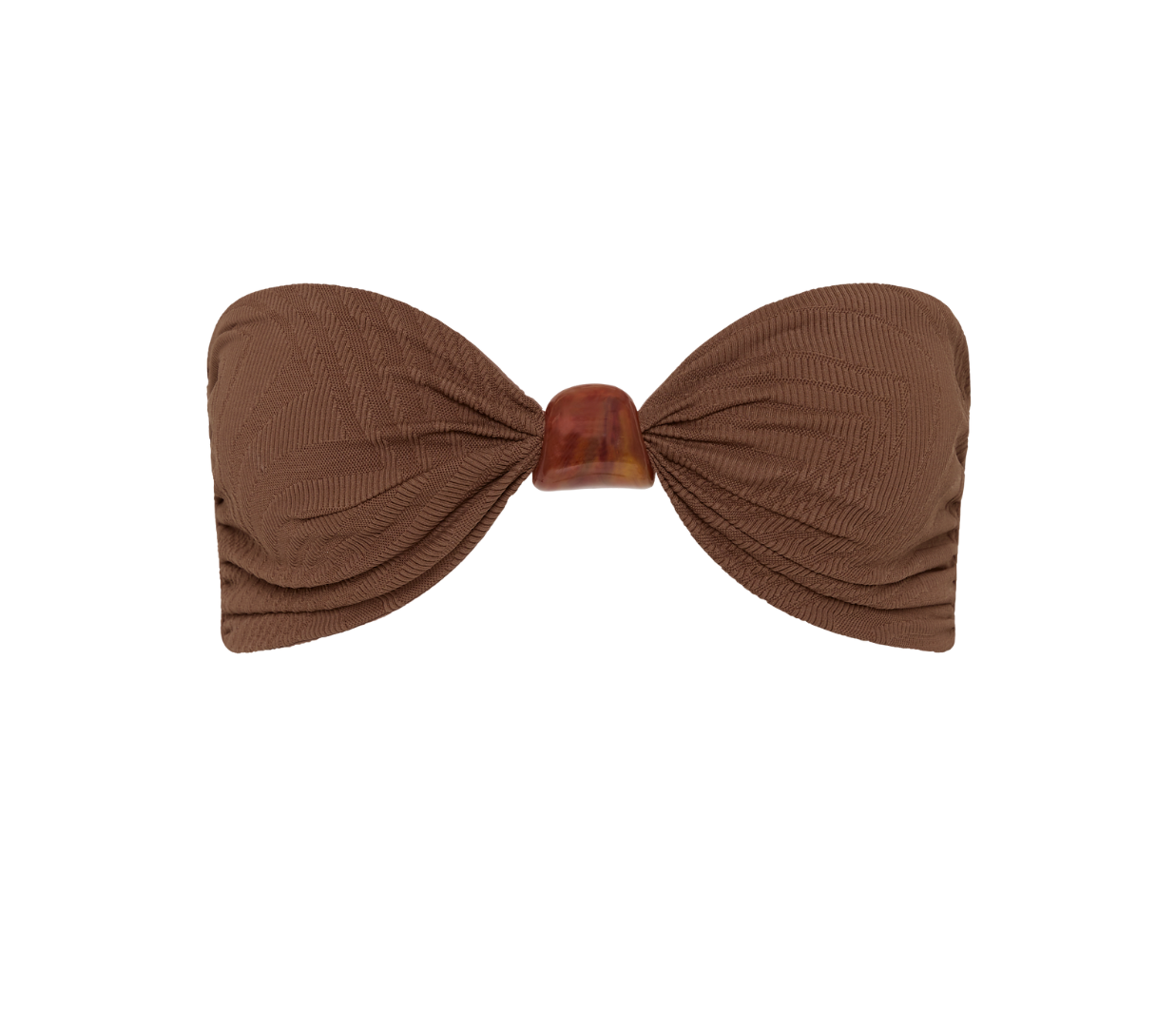 Introducing Fella's Eli Bikini Top in Pinecone, a strapless bandeau bikini top in a chocolate brown hue. The Eli bikini top features a chunky Italian Plexiglas bead with a ruched detail effect finished with a clasp at the back and boned side seams. Best suited for bust cups A, B, and C (size XS to M).