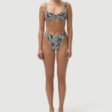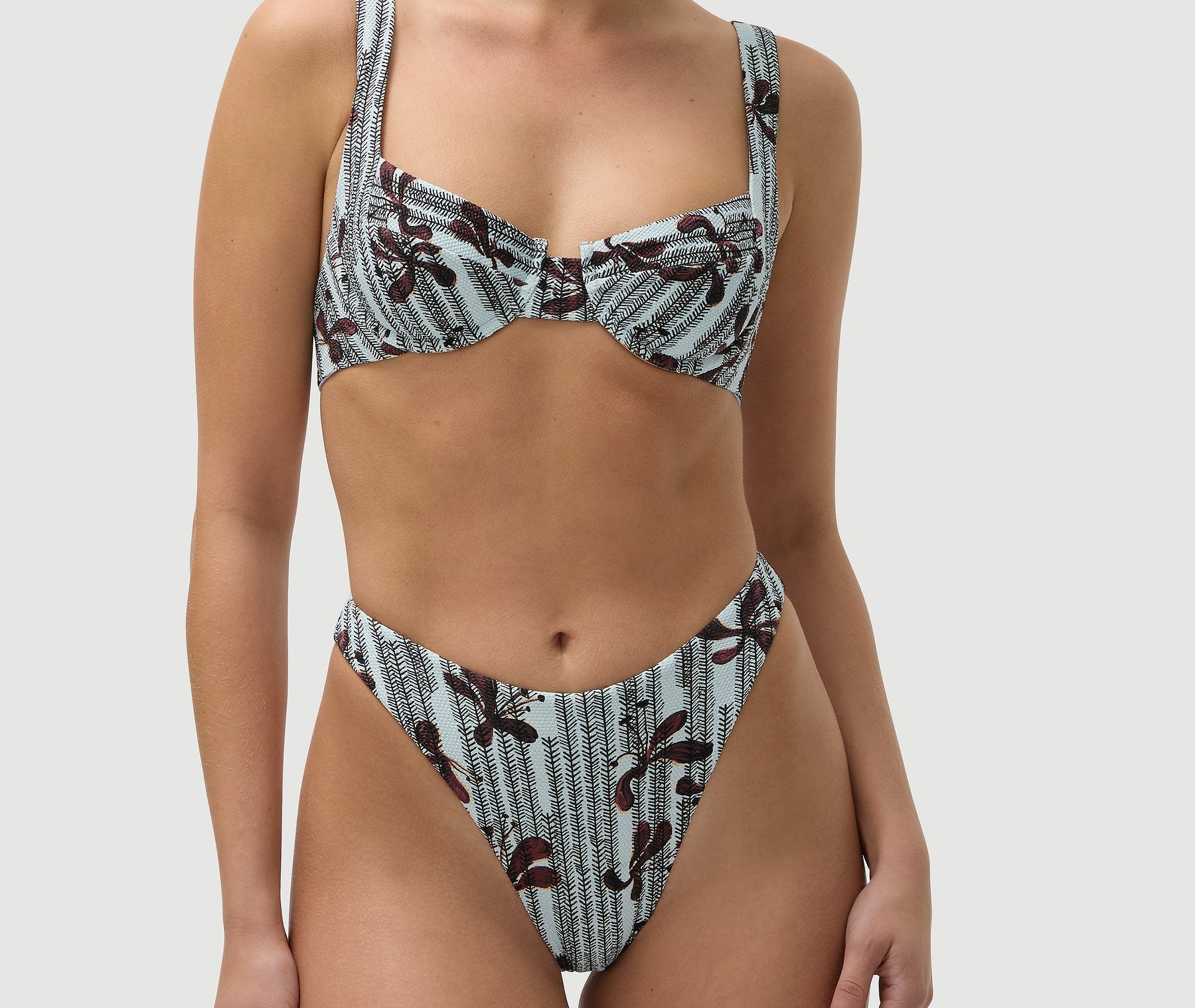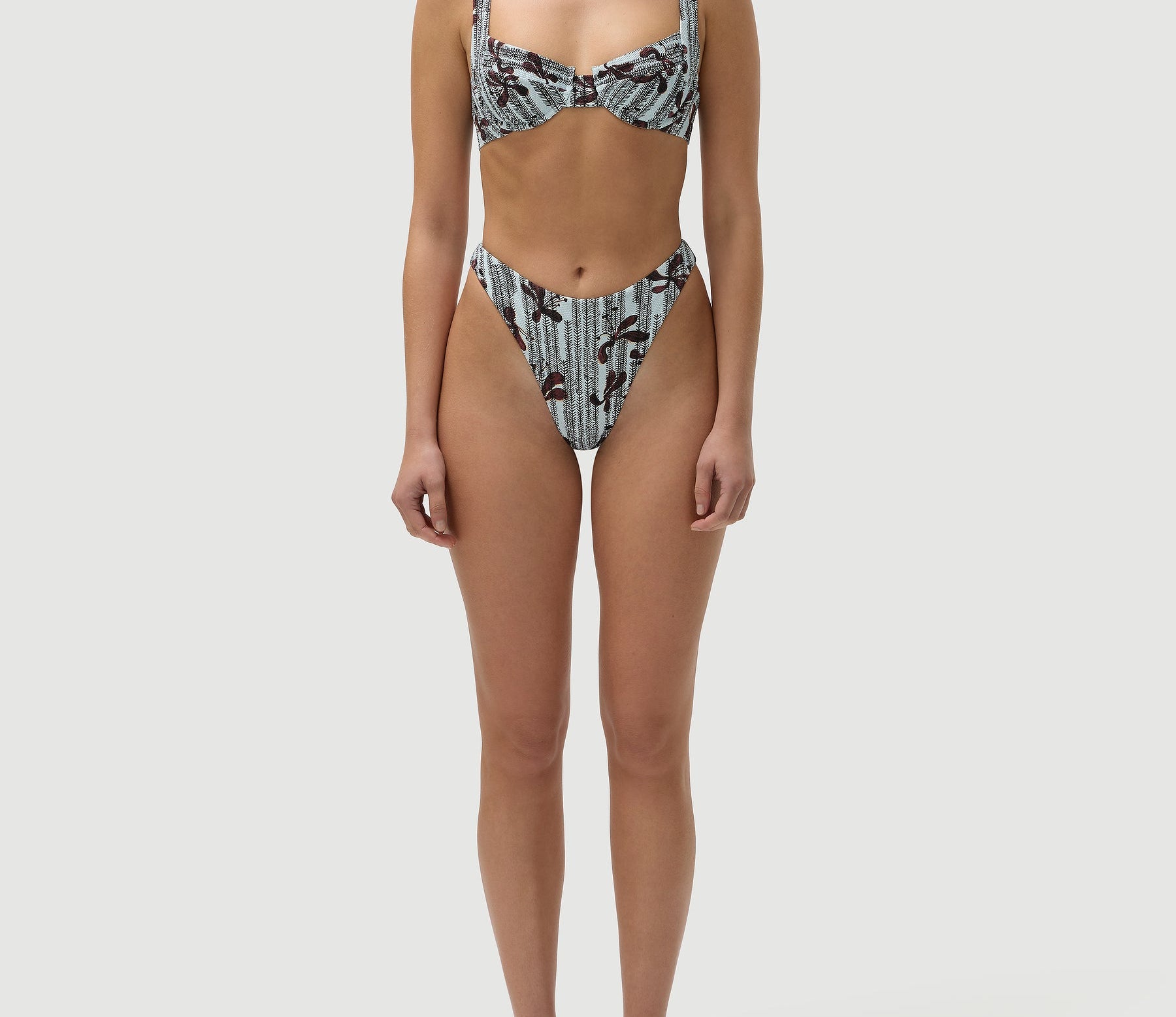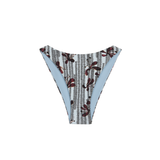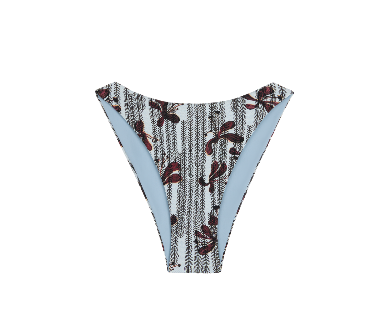 Introducing Fella’s Elvis Bottom in Pinecone, a high-cut 90s-inspired bikini bottom in a brown-red floral print set against a soft light blue base. Designed to elongate the legs and accentuate the waist, the Elvis bottom offers a cheeky to conservative cut that flatters all body shapes. Fully lined for a smooth, supportive fit, it’s a timeless swim essential.