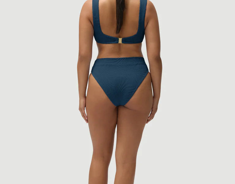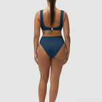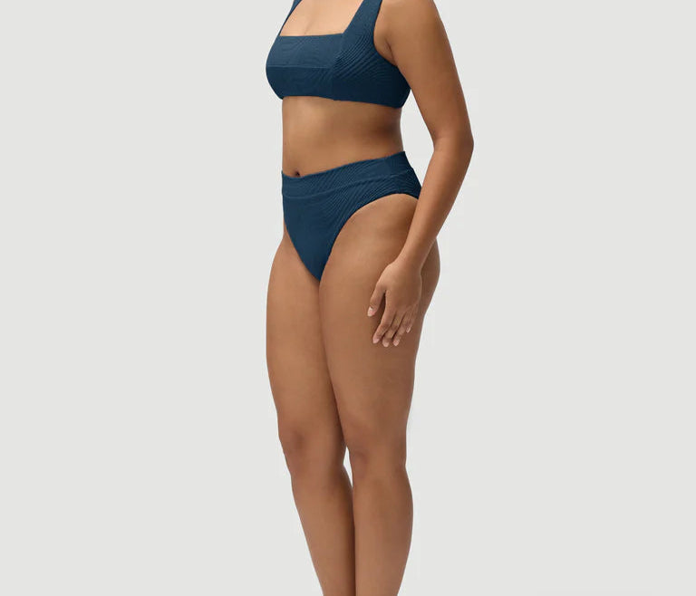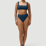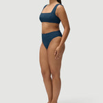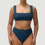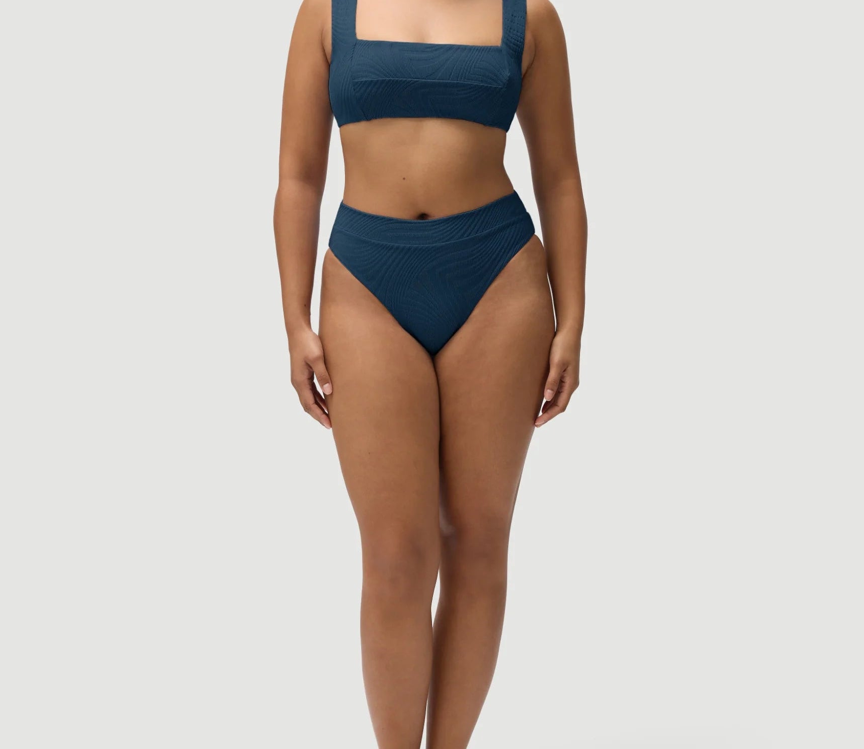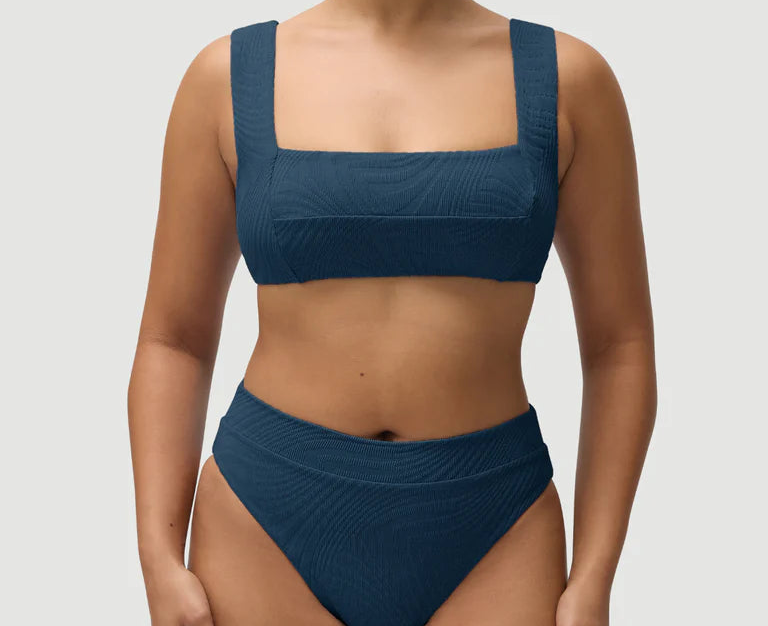 Introducing Fella's Franco Bikini Top in Poseidon, a bandeau bikini top in a deep, rich blue with subtle green undertones. The Franco bikini top is a structured bandeau crop top with thick shoulder straps. It's extremely supportive for a larger bust but flattering for all bust sizes.