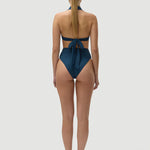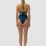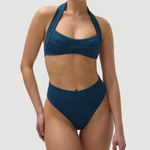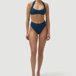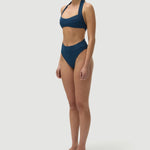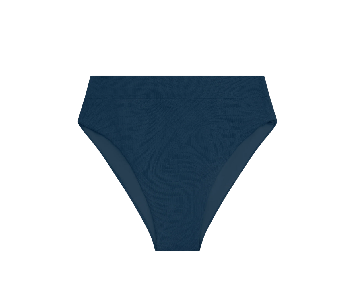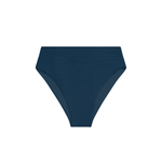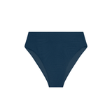 Introducing Fella's Hubert Bottom in Poseidon, a high-waisted 80s bikini bottom in a deep, rich blue with subtle green undertones. The Hubert bottom is crafted to sit at the waistline and just below the belly button, with a mid-cut leg ideal for conservative wear.