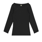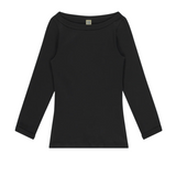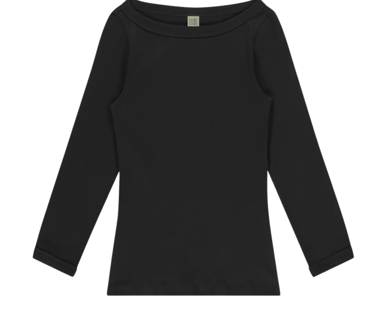 Introducing the Steffie Boat Neck 3/4 Sleeve Tee in Black by Flore Flore is an essential for the capsule wardrobe. Featuring a classic boatneck long-sleeve tee silhouette with a double-stitched cut-off seam on the back, crafted from 100% organic cotton rib.