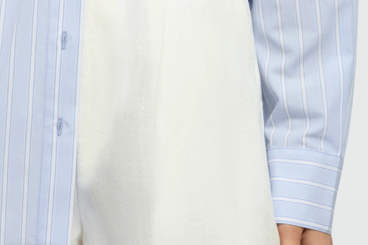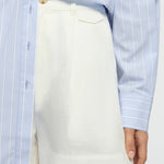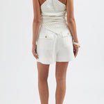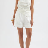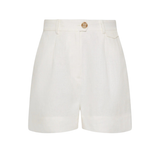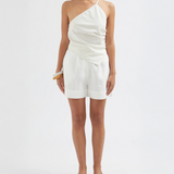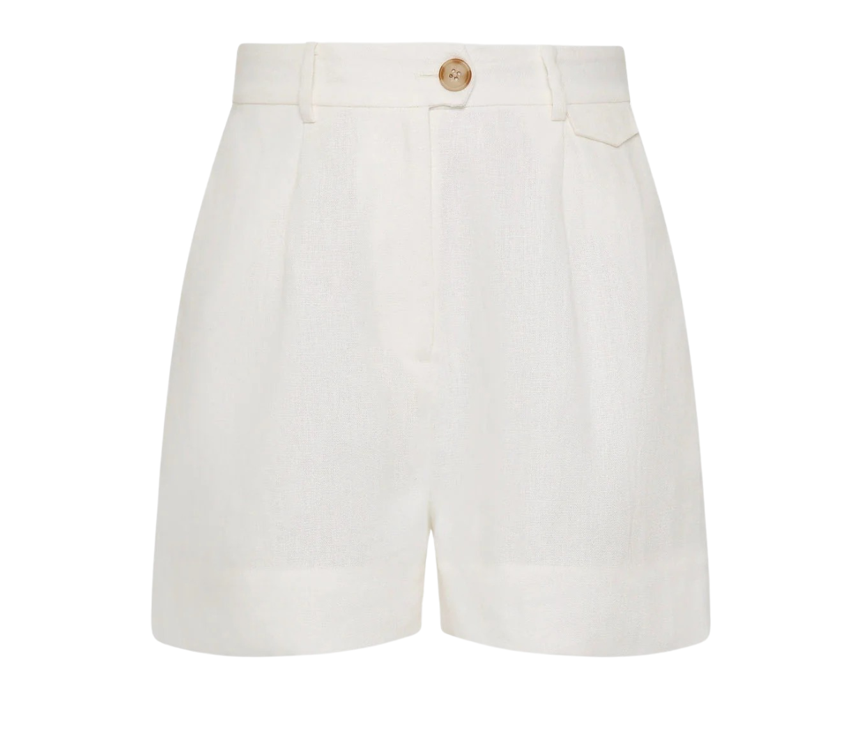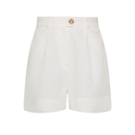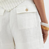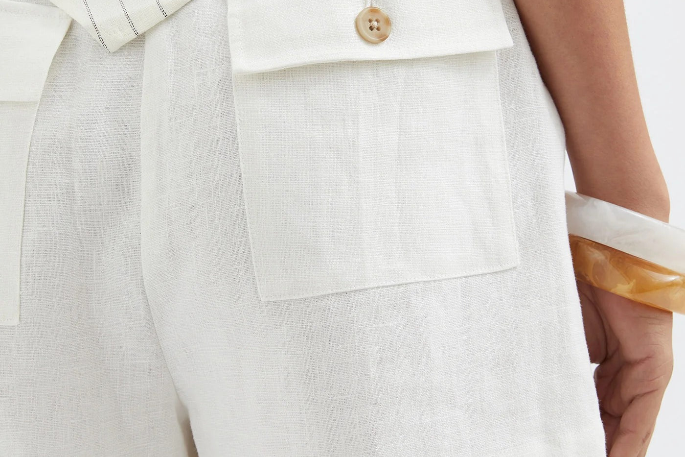 Introducing Friend of Audrey's Linen Pocket Shorts in White, a relaxed mini short silhouette in white. Designed in 100% linen, the linen pocket shorts feature tortoiseshell button detailing, side pockets, and front pleats for a tailored look. A perfect summertime staple short, pair it with the striped one-shoulder top for a coordinated look.