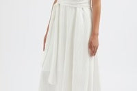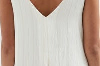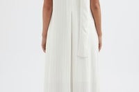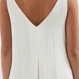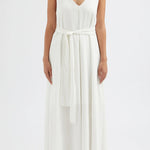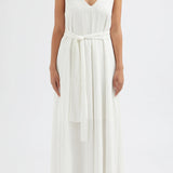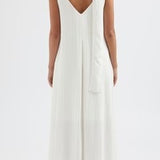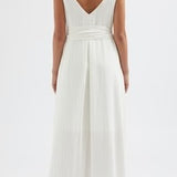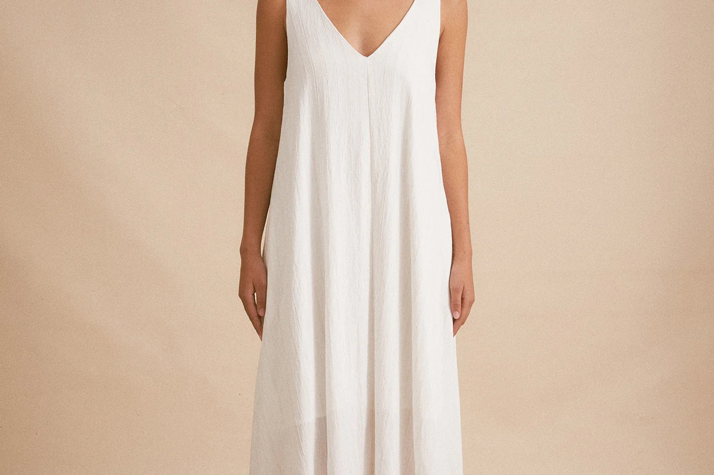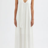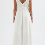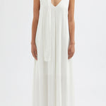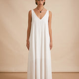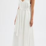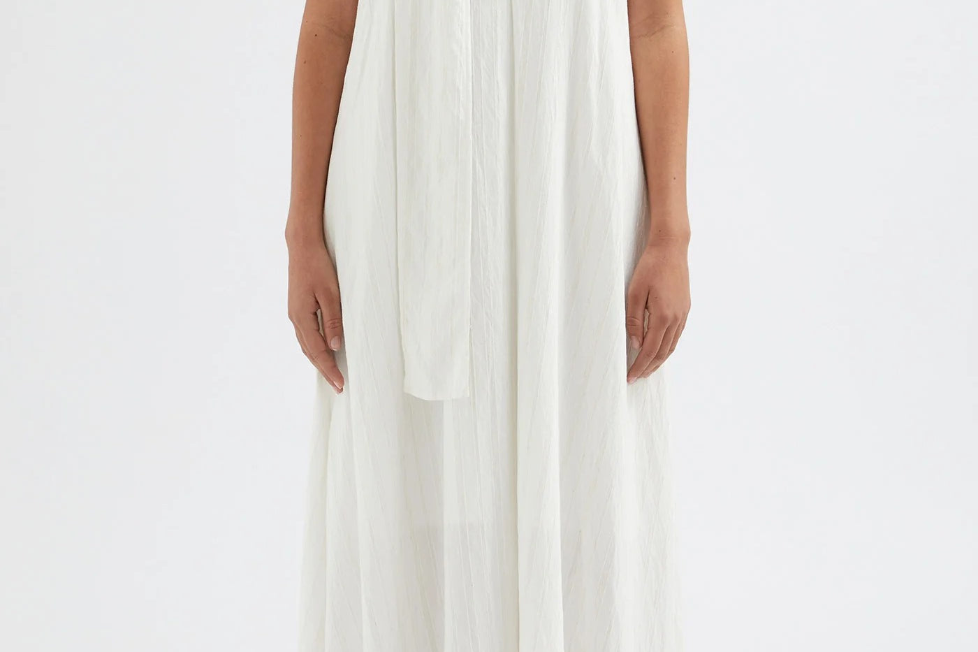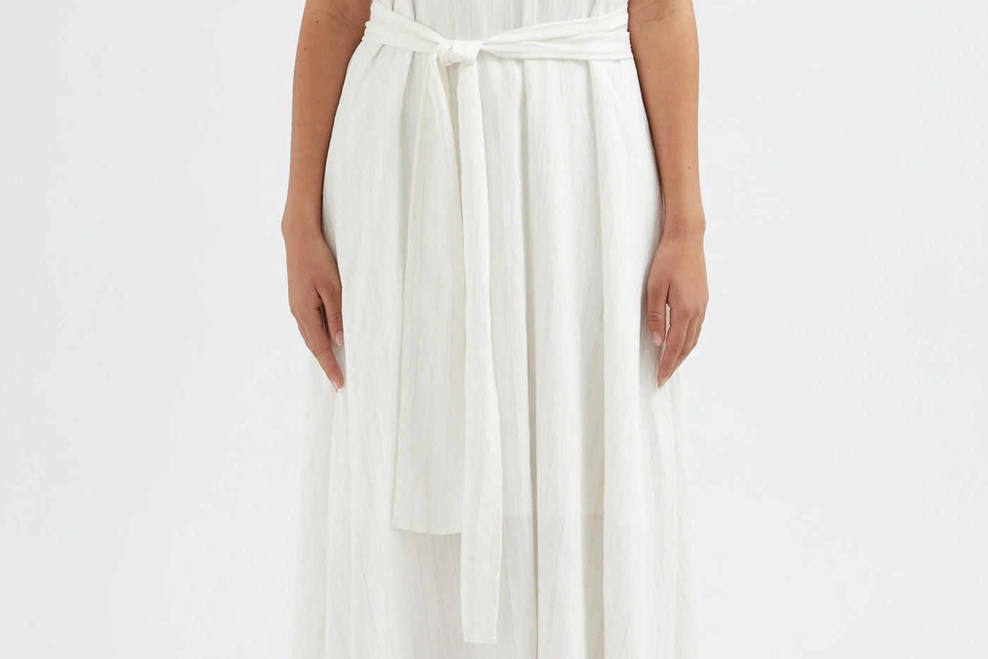 Introducing Friend of Audrey's Sundress with Neck Tie in White, a maxi-length sundress silhouette in white. The Sundress is a lightweight, relaxed, flowy V-neck sundress, designed with a textured fabrication with an A-line draping that falls effortlessly to ankle length. Finished with a self-fabric tie with endless wear options. Perfect dress for a summer day.