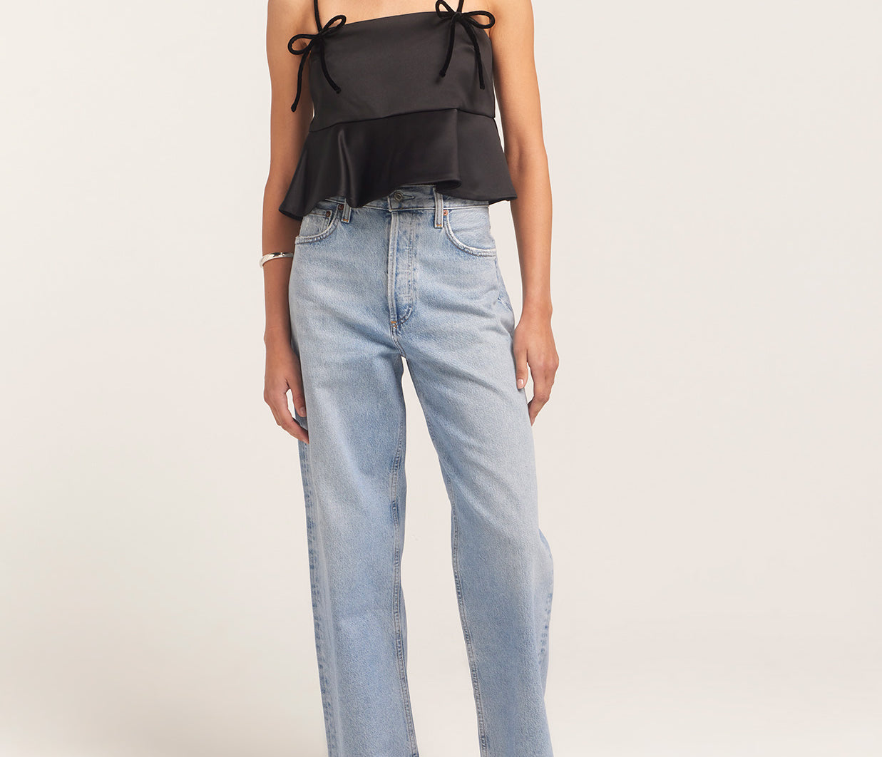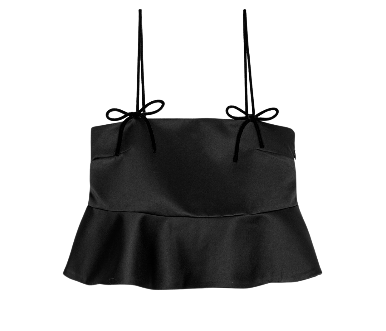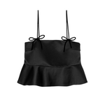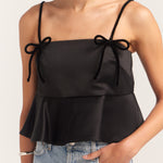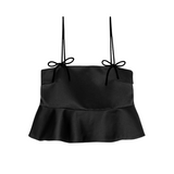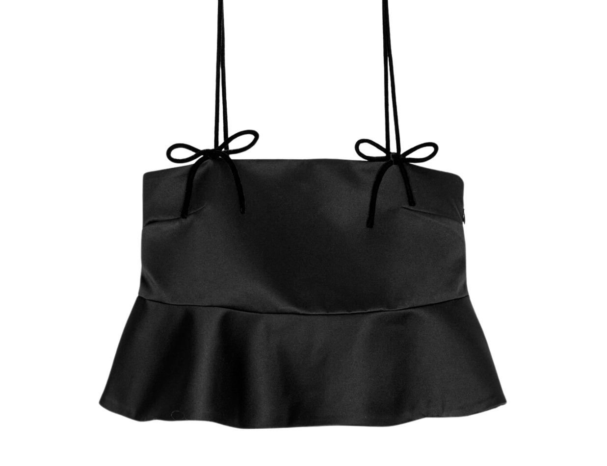 Introducing Ganni's Duchesse Satin Top in Black. Featuring straps adorned with bow details, and a straight neckline, the flounce hem creates a flattering, feminine silhouette.