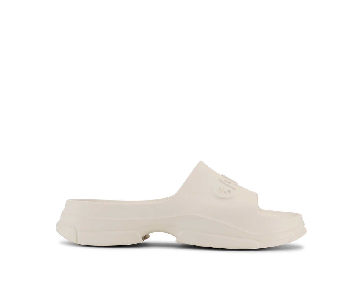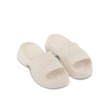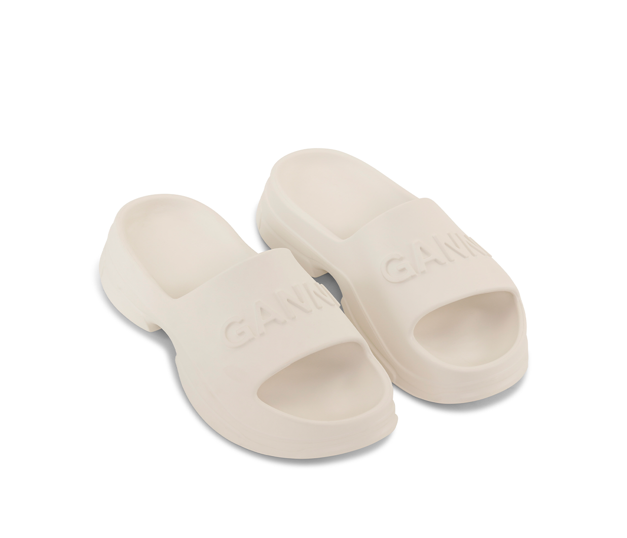 Constructed from sugar cane resin and ethylene vinyl acetate, these White Pool Slide Sandals offer a sustainable and stylish choice. Designed with an open round toe and adorned with an embossed GANNI logo, these sandals provide both comfort and a touch of brand elegance.